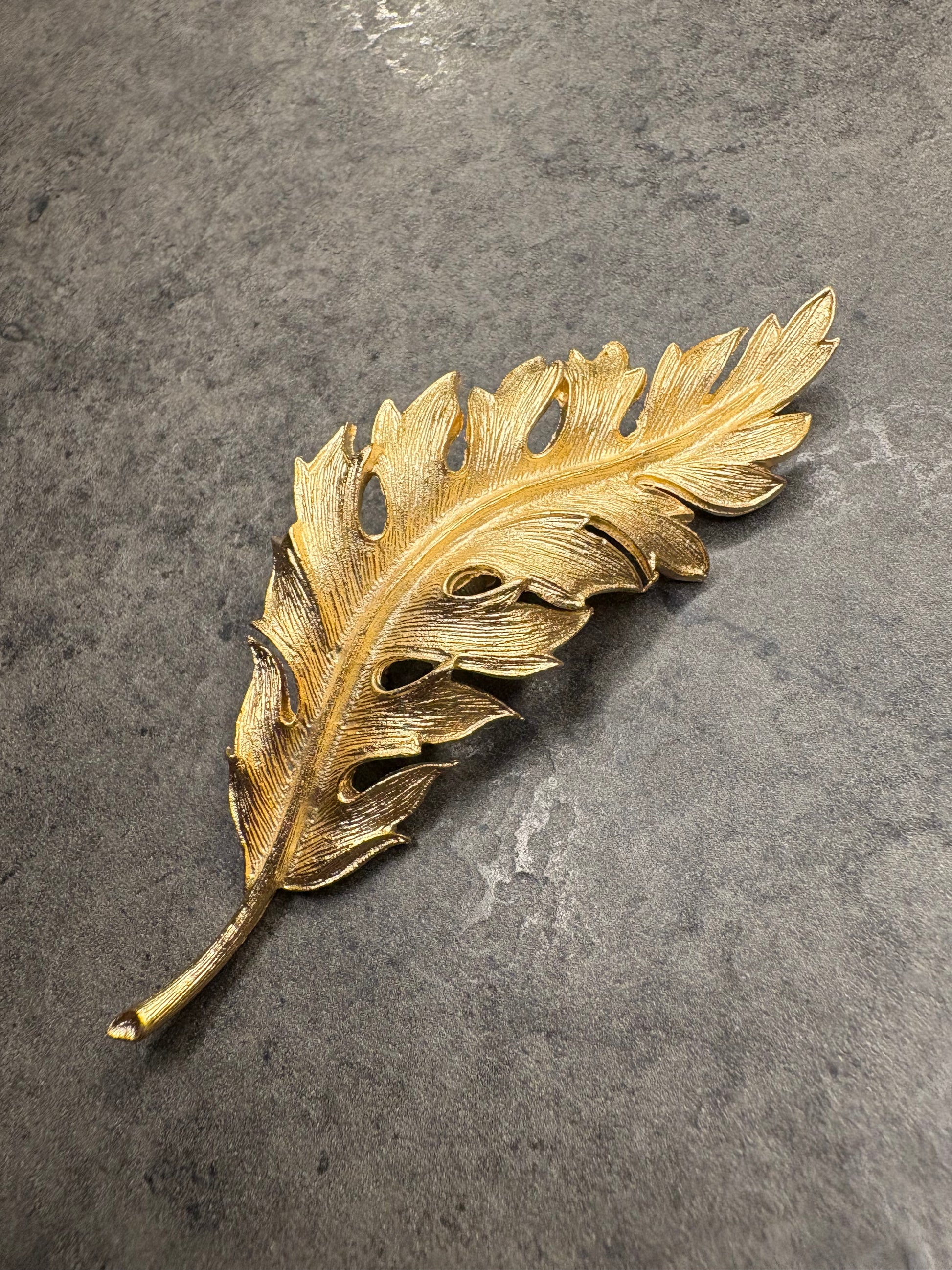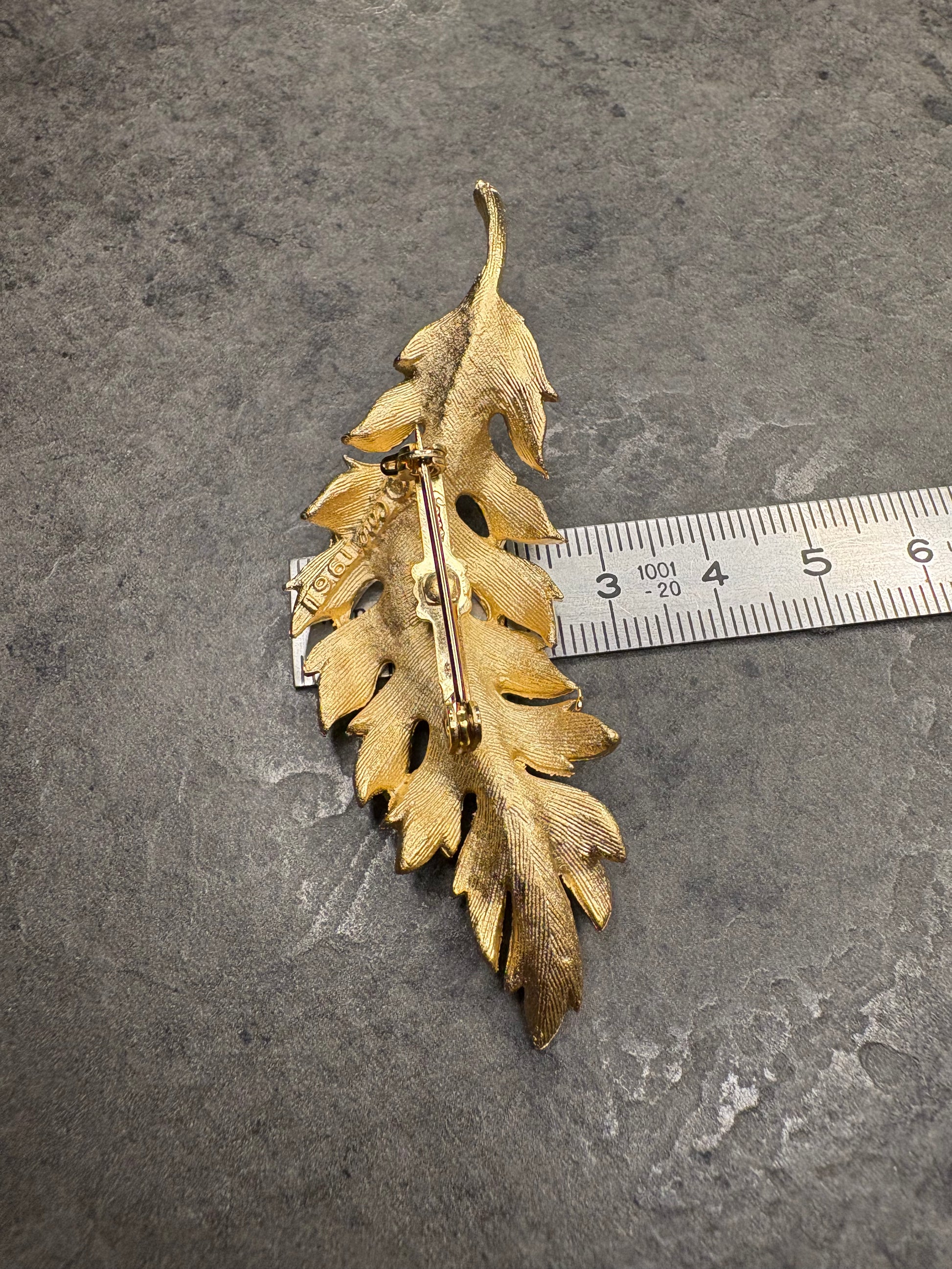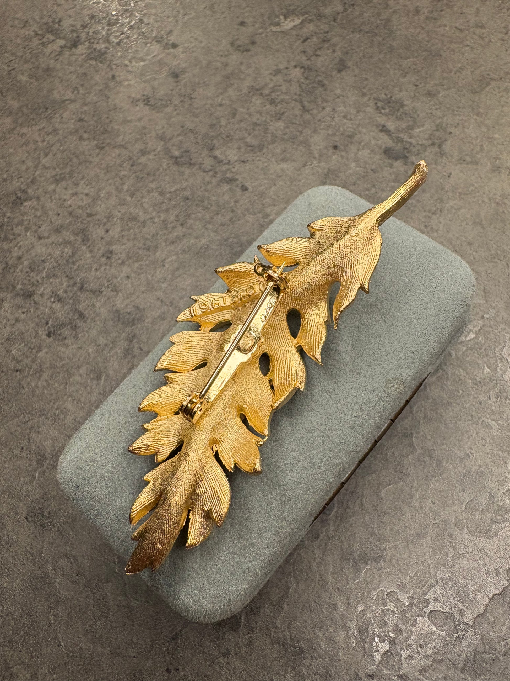 Splendida spilla vintage firmata Coro, datata 1961, raffigurante una foglia stilizzata dal design elegante e tridimensionale.