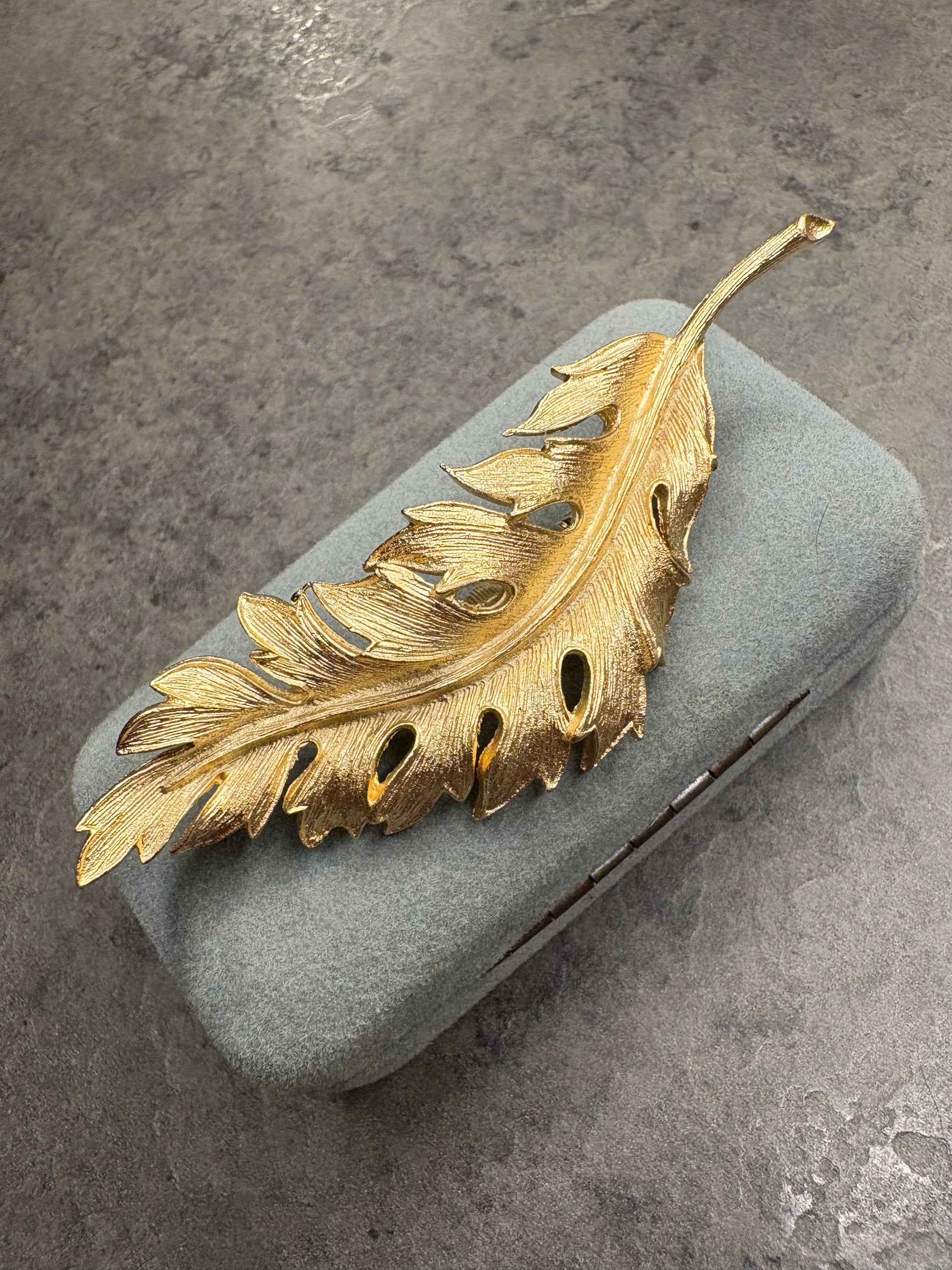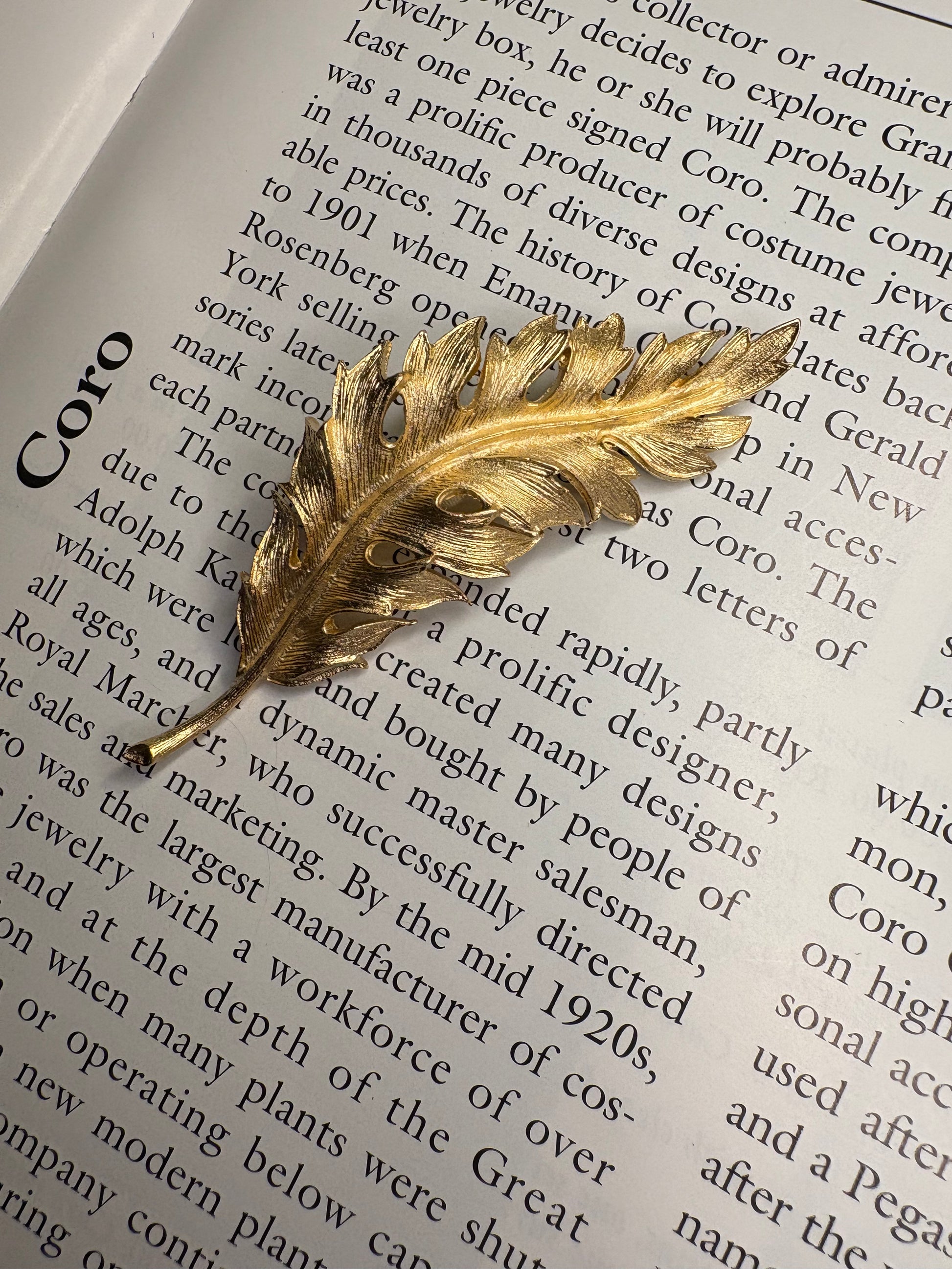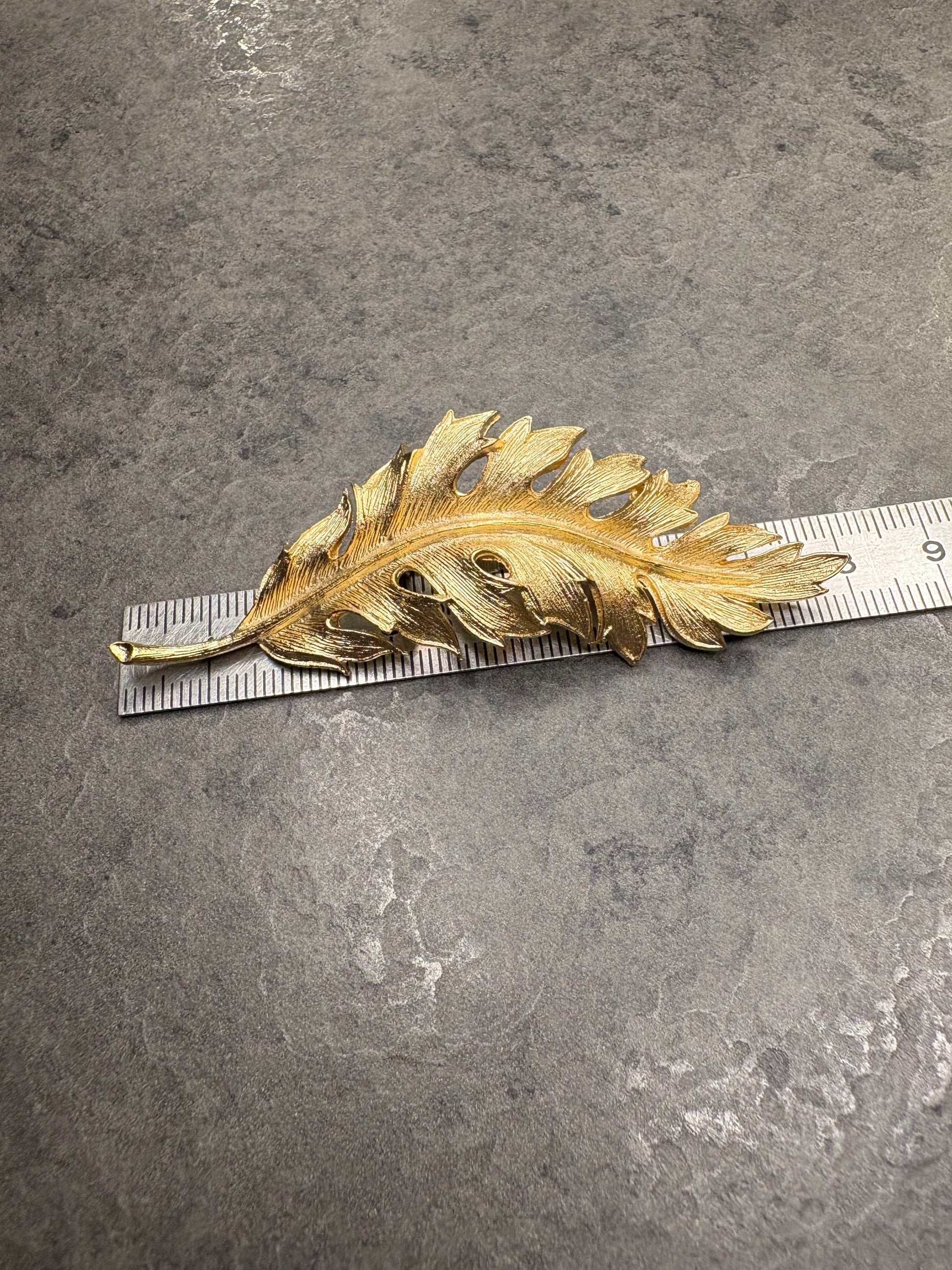 Splendida spilla vintage firmata Coro, datata 1961, raffigurante una foglia stilizzata dal design elegante e tridimensionale.