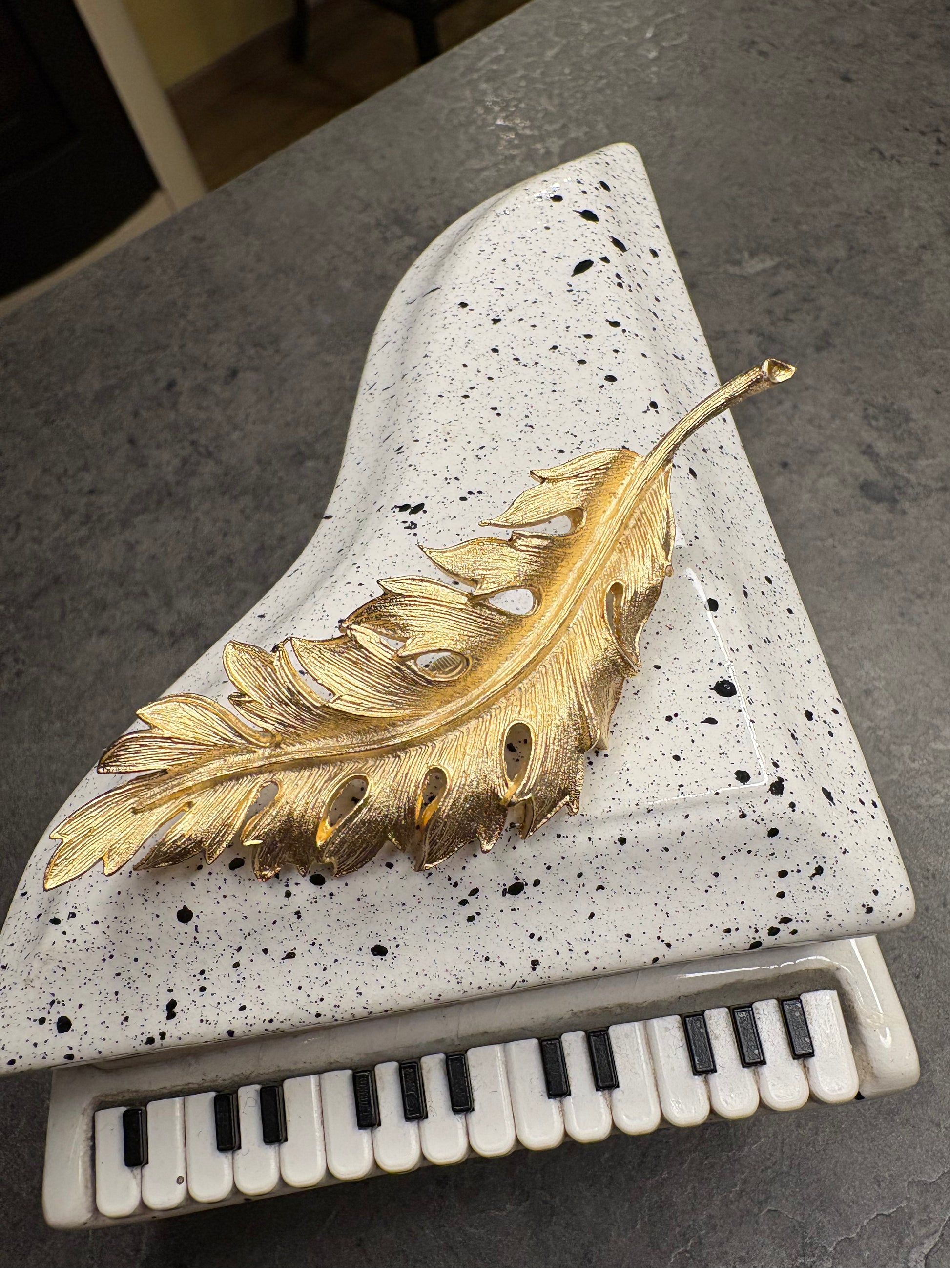 Realizzata in metallo dorato con raffinata finitura satinata e lucida a contrasto, presenta una lavorazione dettagliata che riproduce le venature naturali della foglia e sottili trafori che le donano leggerezza e movimento.