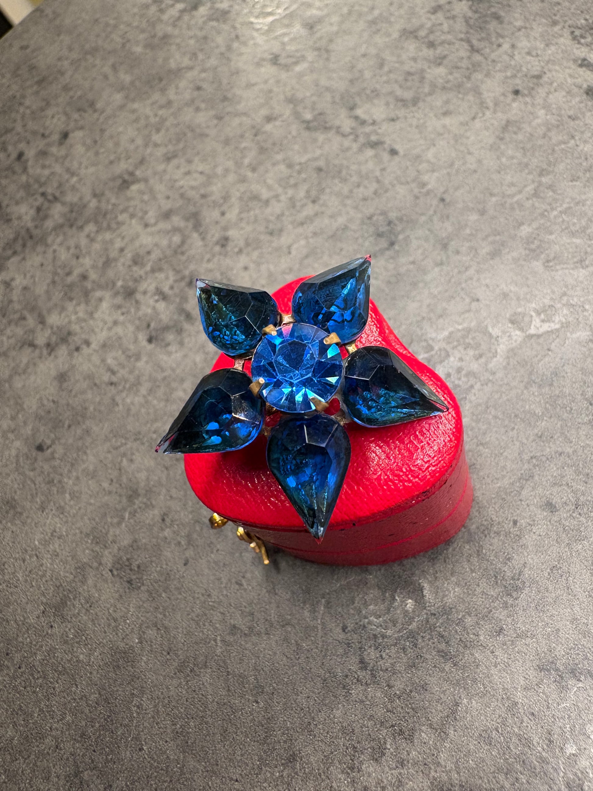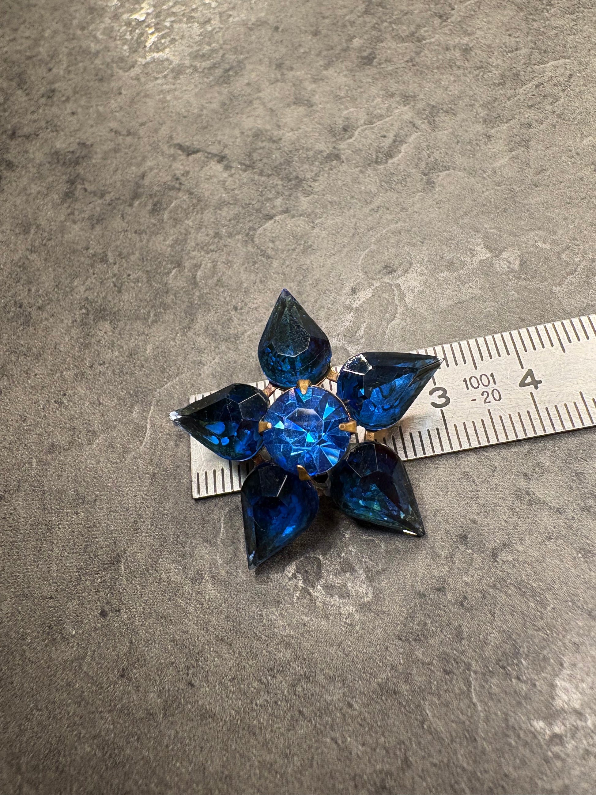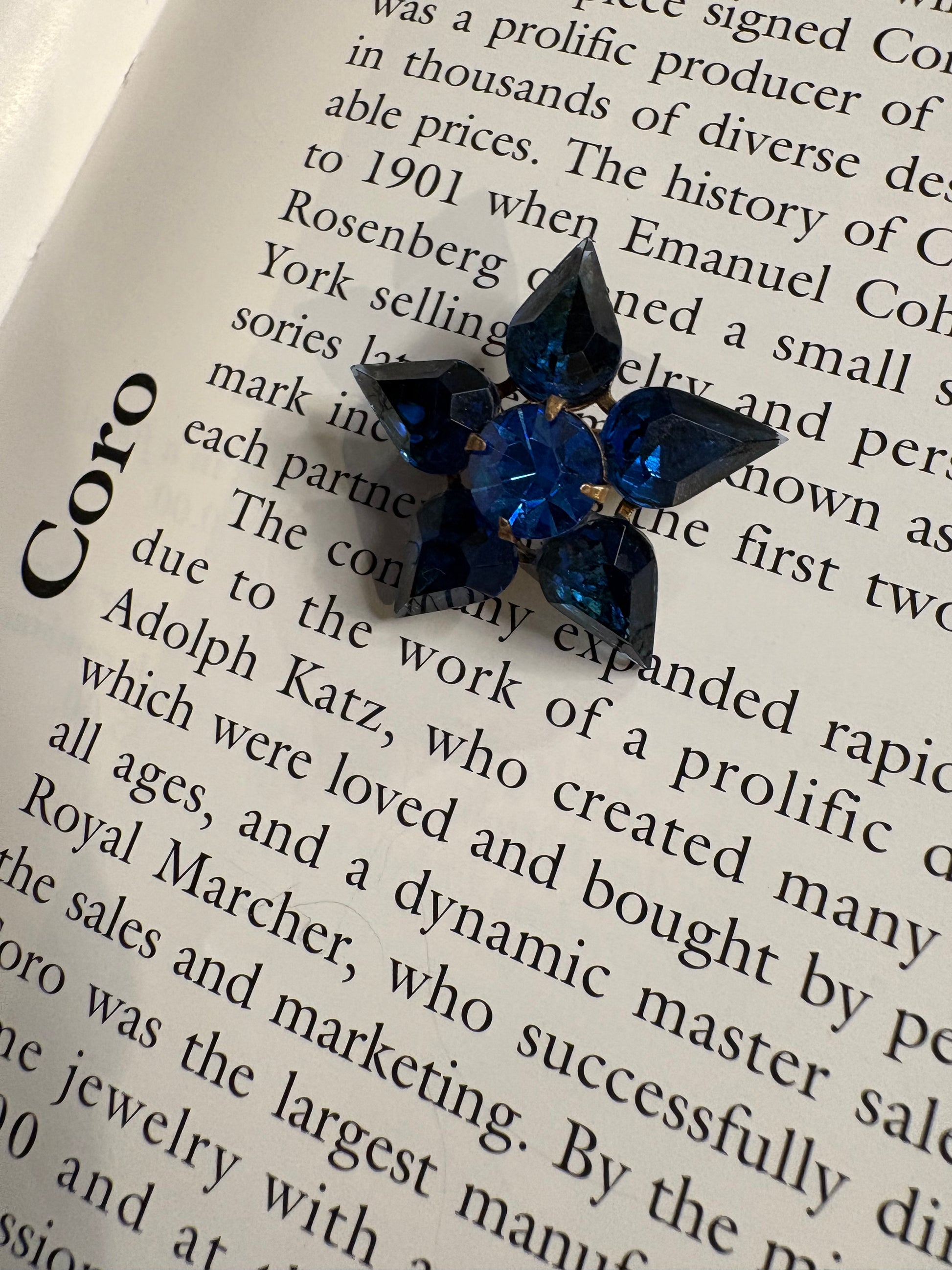 Deliziosa spilla vintage firmata Coro risalente agli anni ’40, esempio raffinato di bigiotteria americana d’epoca. Realizzata in una forma floreale stilizzata con petali a goccia in cristallo blu intenso e una grande pietra centrale rotonda coordinata, che cattura la luce con splendidi riflessi.