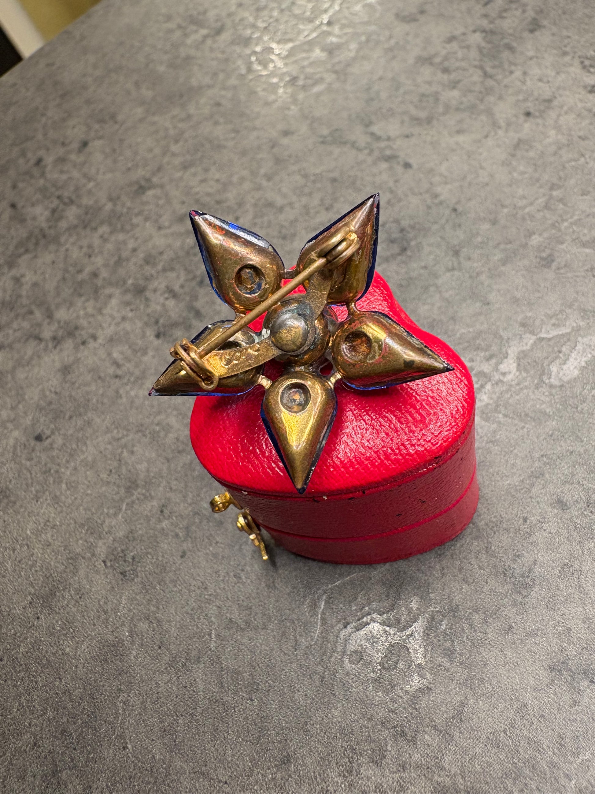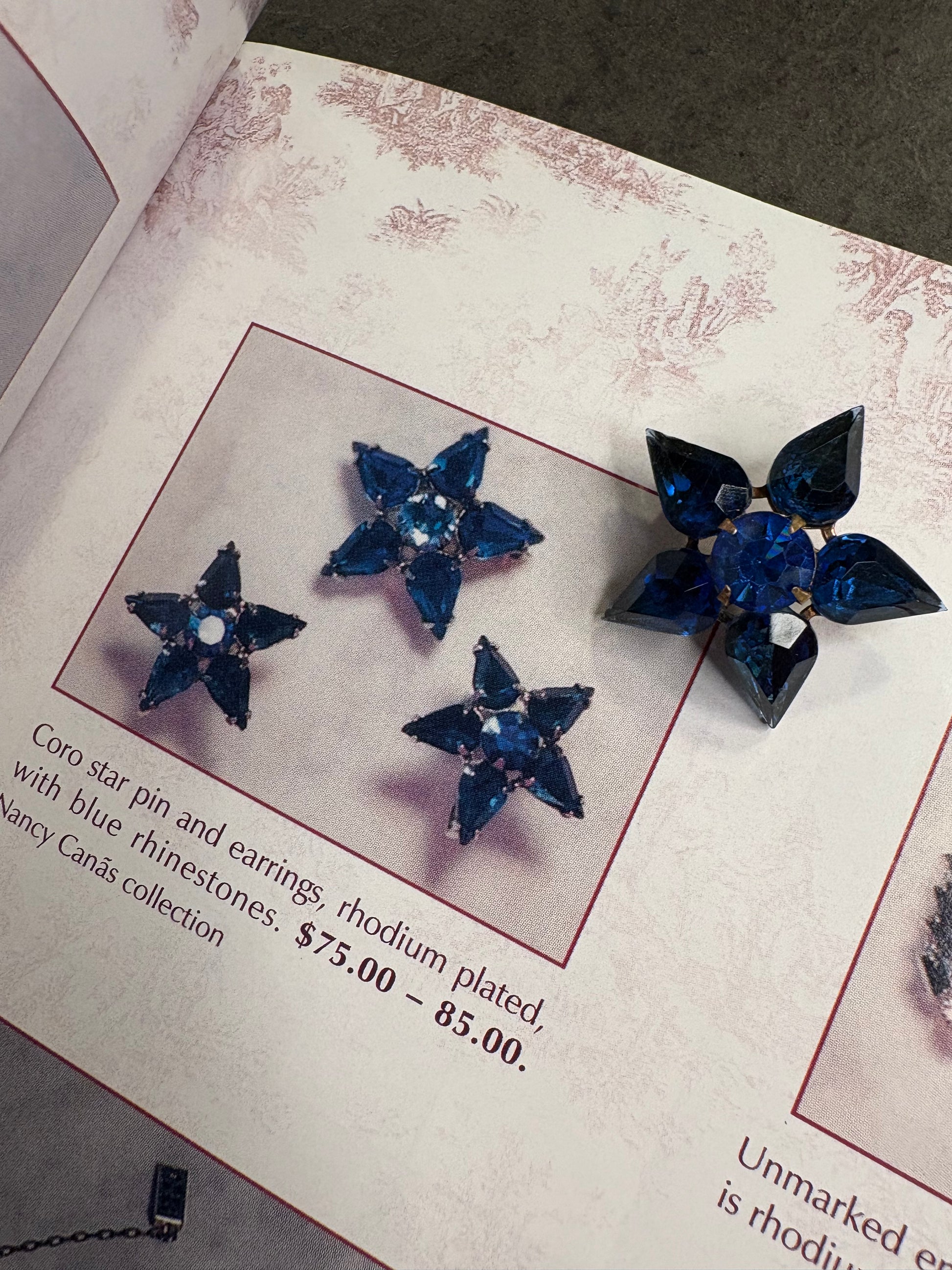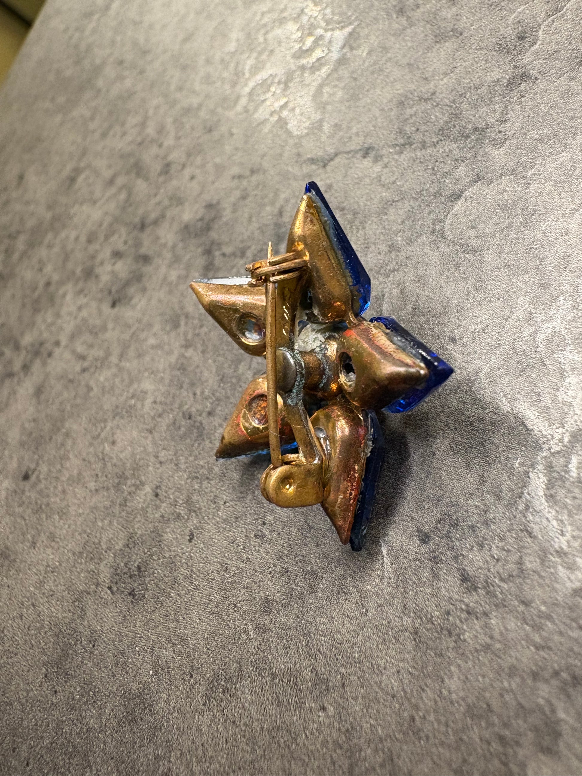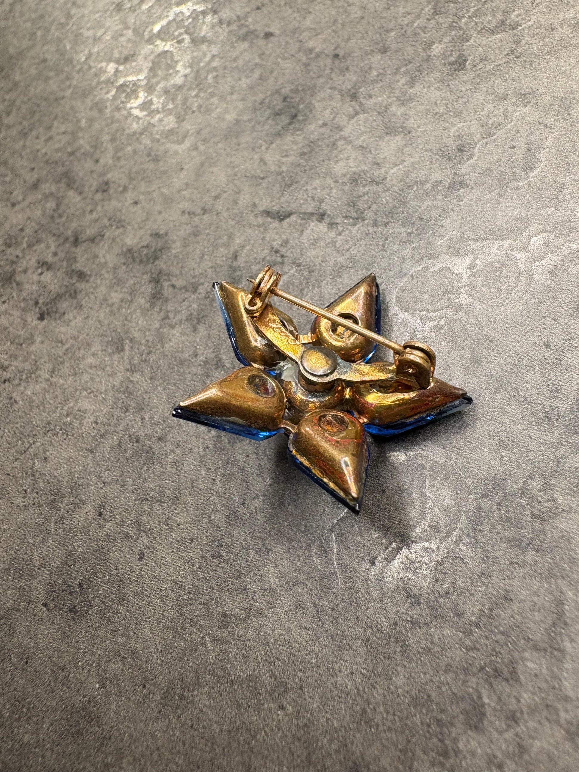 Deliziosa spilla vintage firmata Coro risalente agli anni ’40, esempio raffinato di bigiotteria americana d’epoca. Realizzata in una forma floreale stilizzata con petali a goccia in cristallo blu intenso e una grande pietra centrale rotonda coordinata, che cattura la luce con splendidi riflessi.
