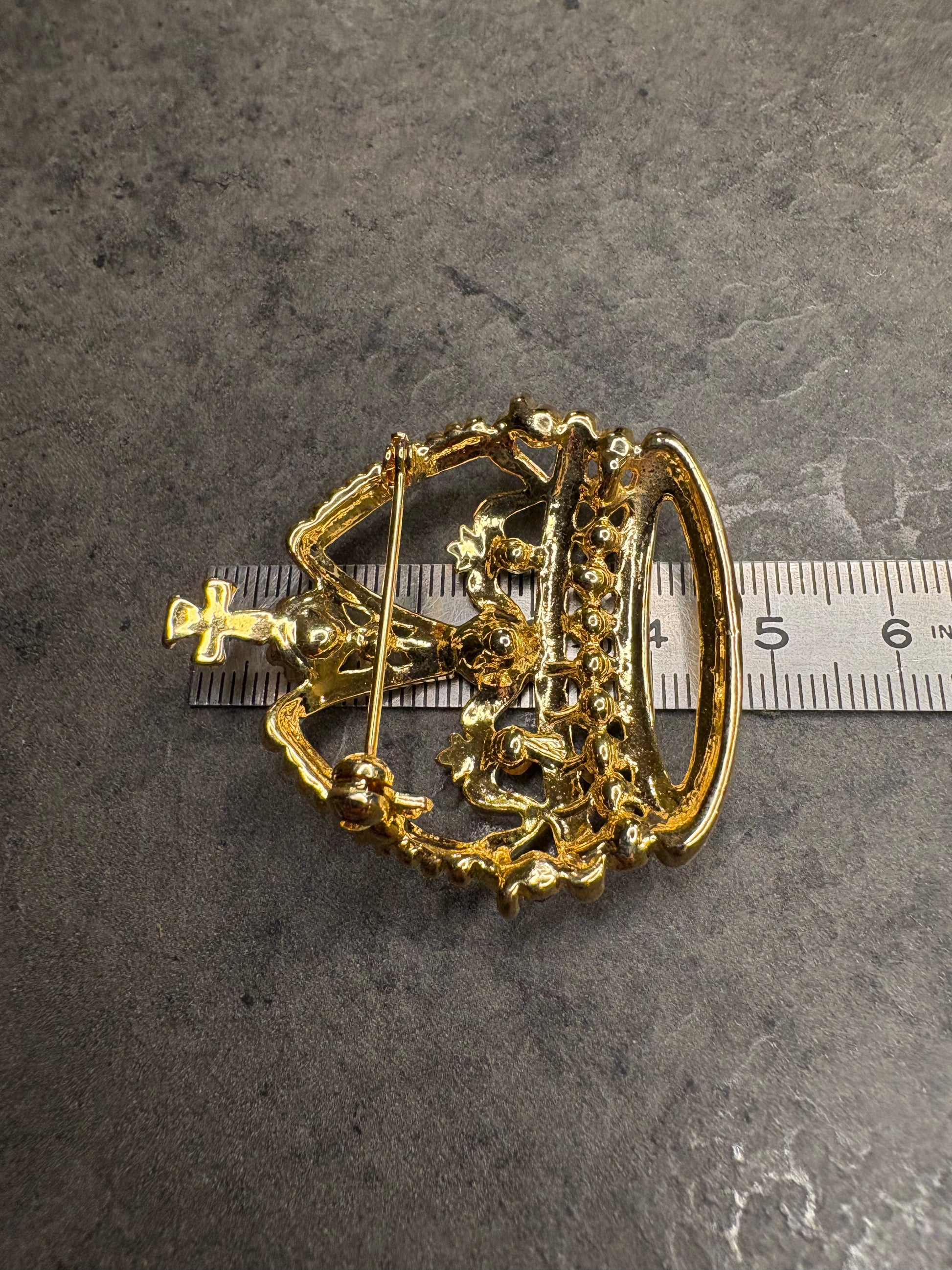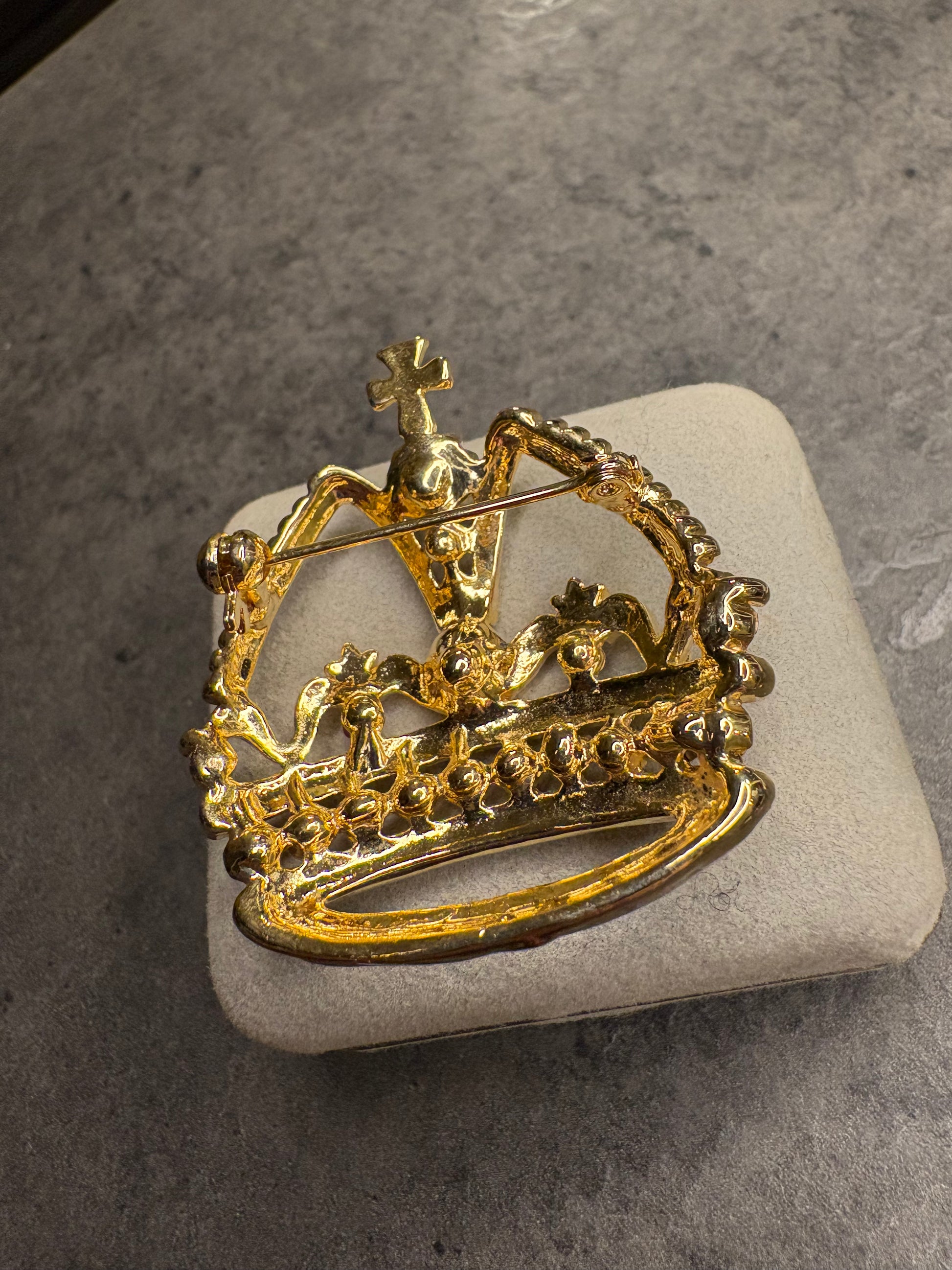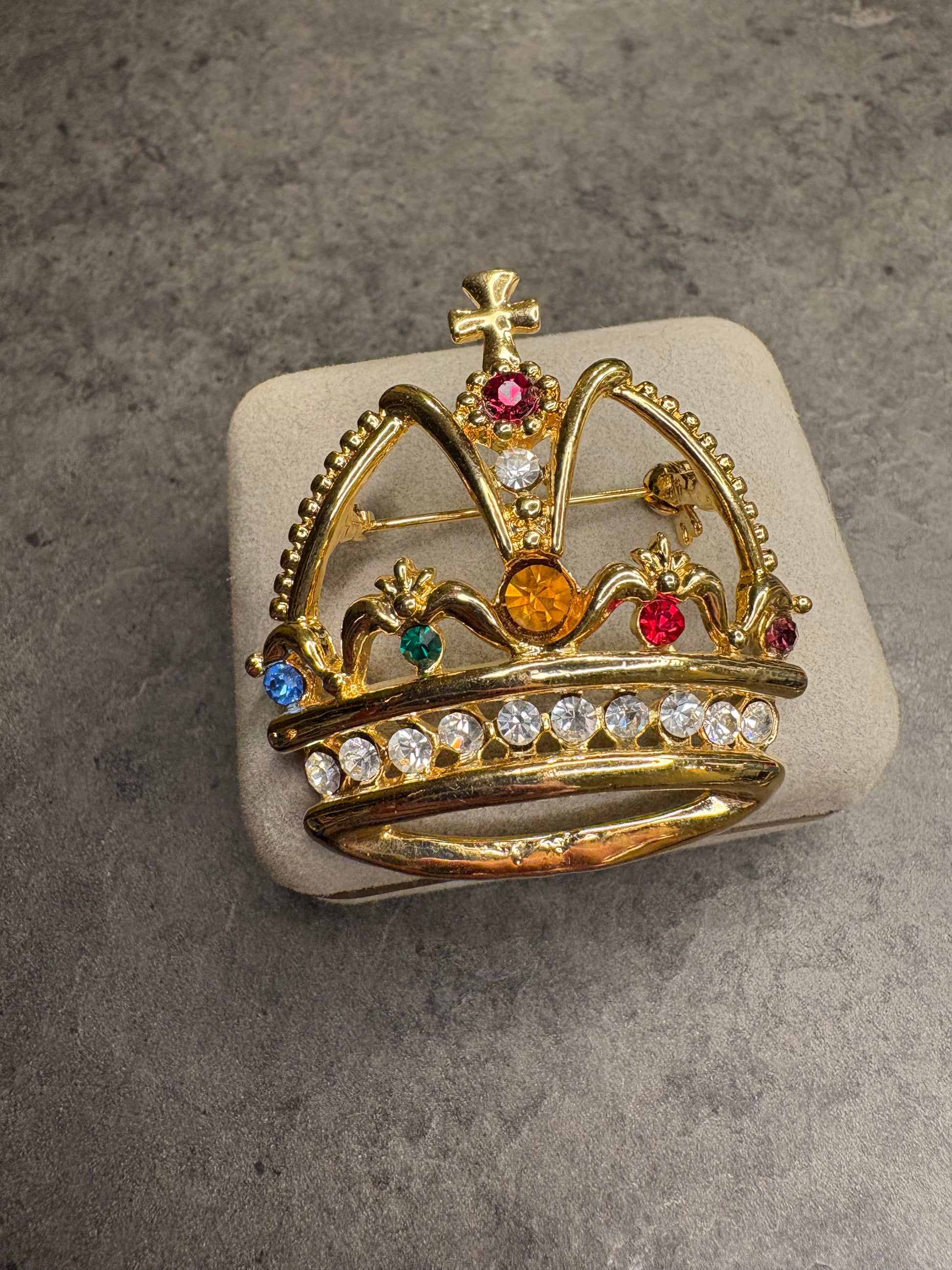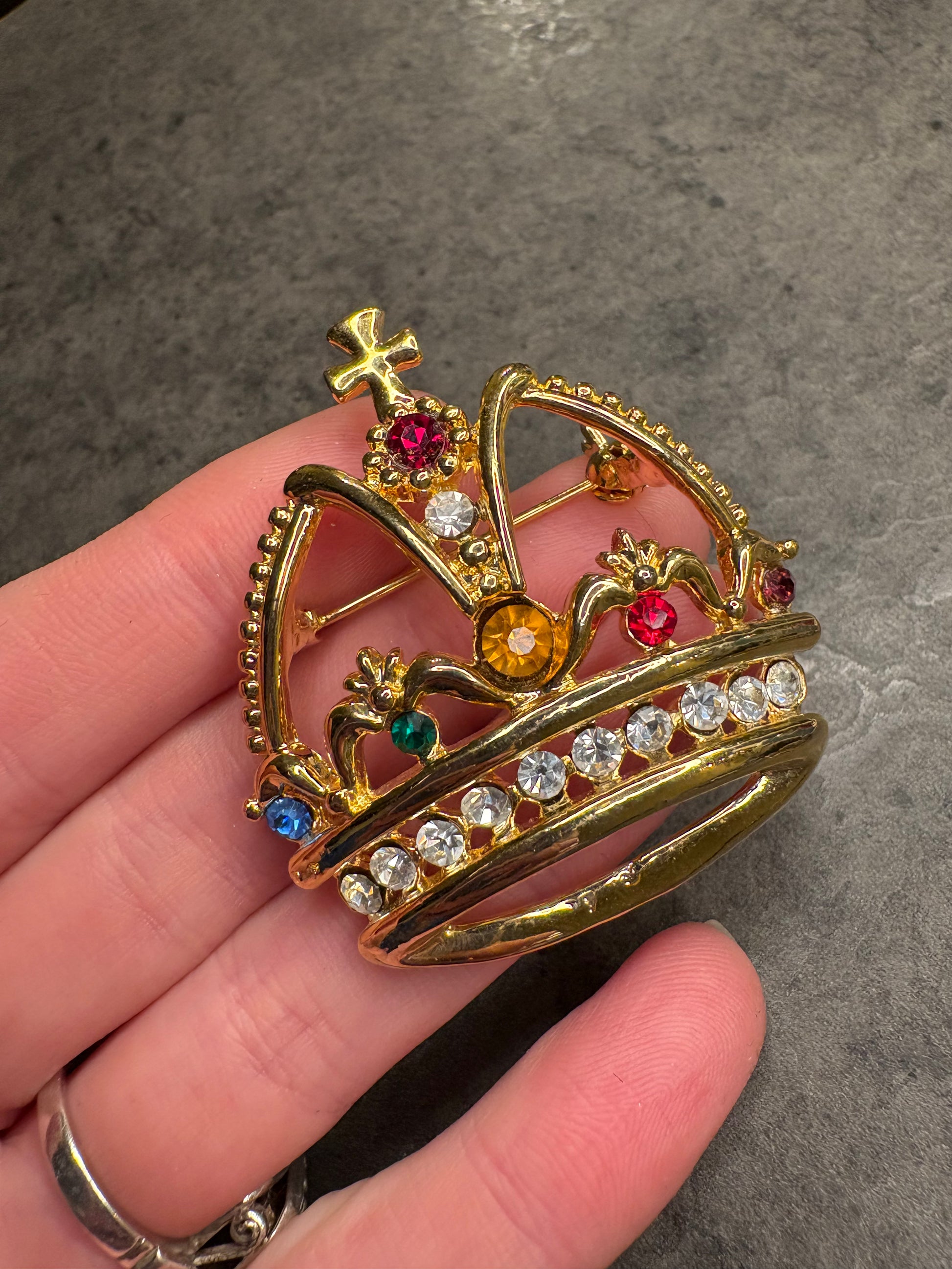 Elegante spilla vintage a forma di corona reale, realizzata in metallo dorato lucente e impreziosita da strass colorati di varie dimensioni e tonalità.