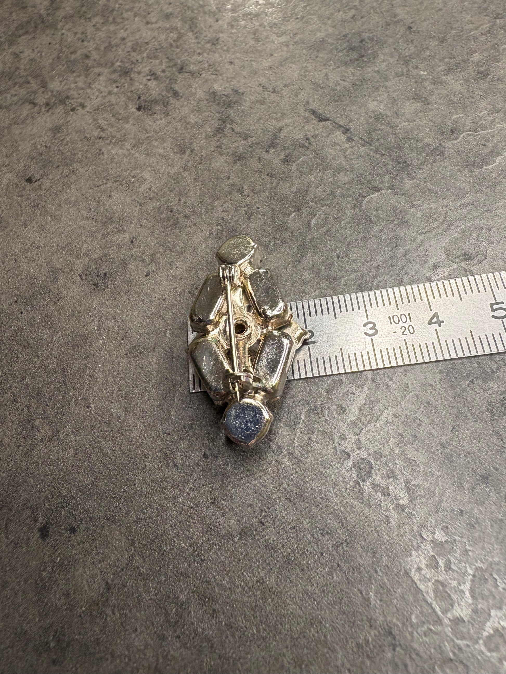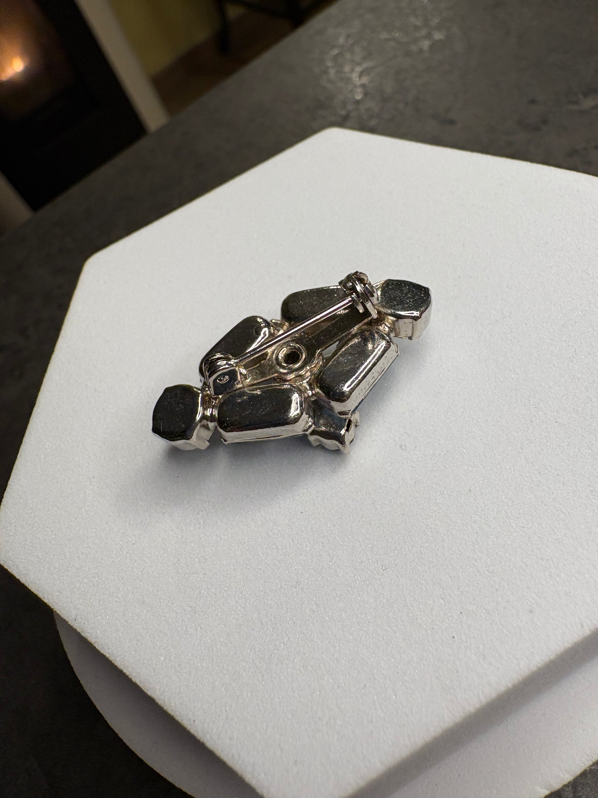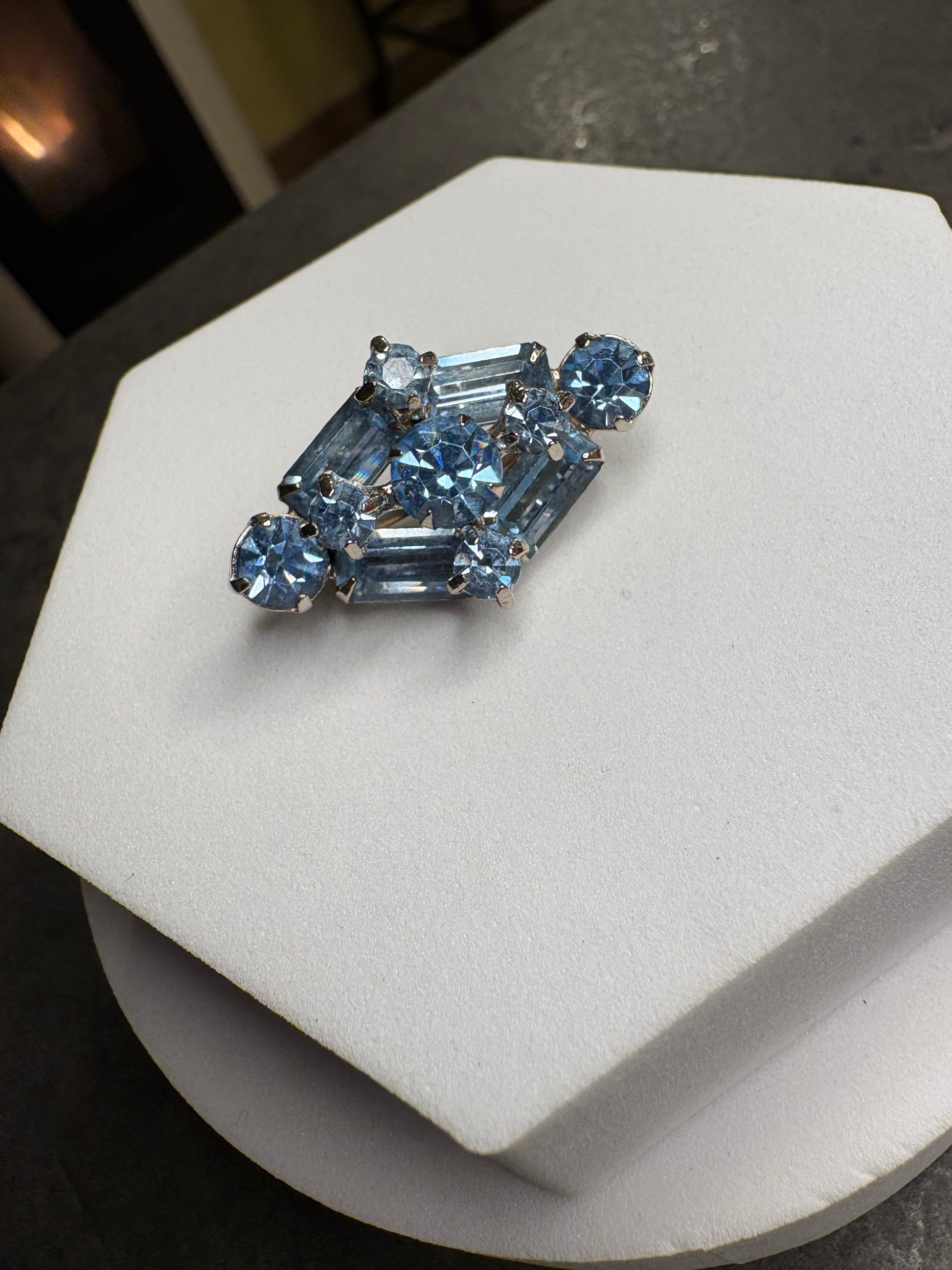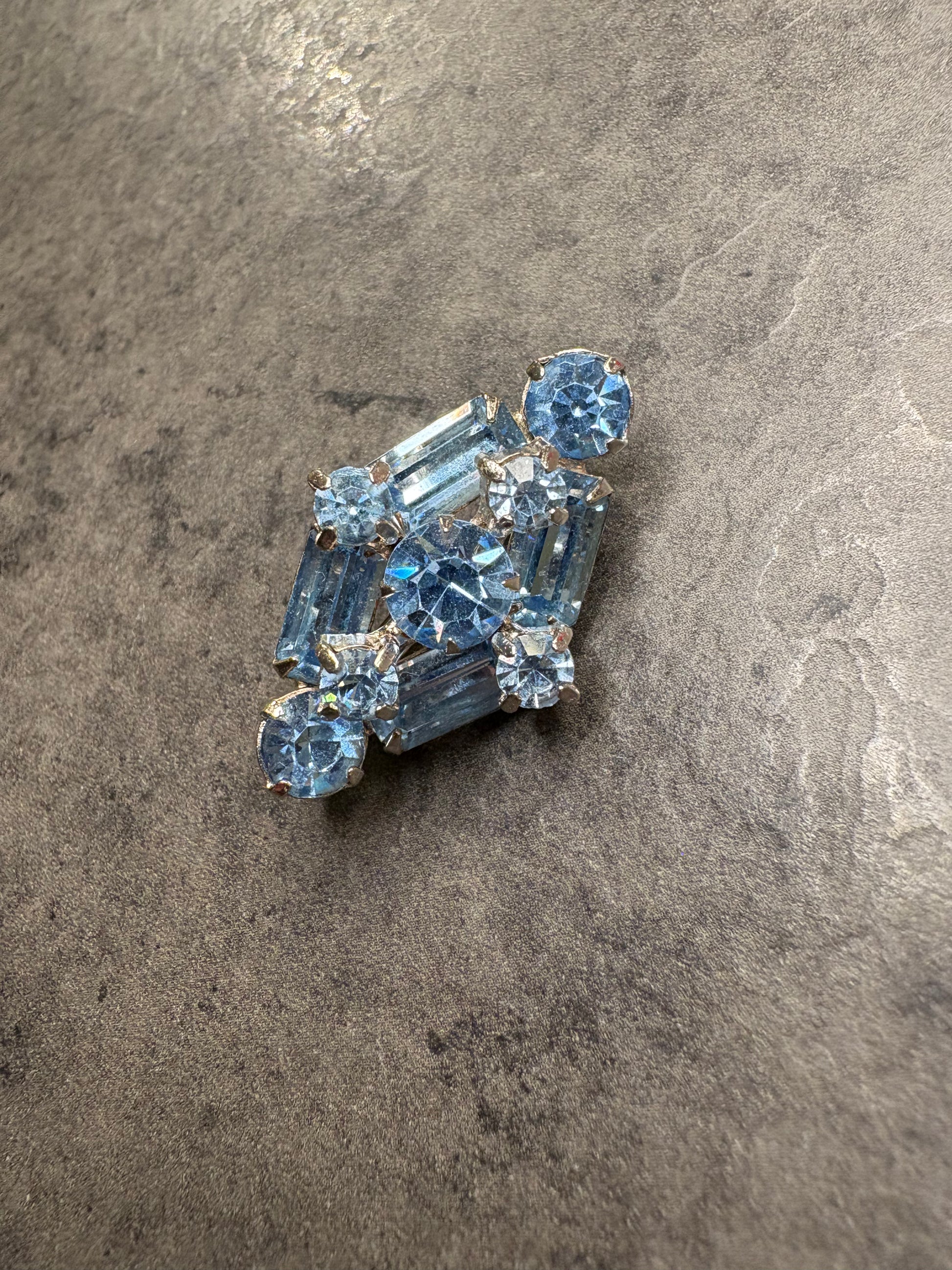 Questa meravigliosa spilla degli anni’60 con cristalli azzurri presenta un design compatto e geometrico, tipico dell’estetica mid-century. È composta da cristalli taglio baguette e tondi, disposti a creare una forma armoniosa e bilanciata. Le pietre, di un delicato azzurro ghiaccio, sono montate su base argentata e catturano la luce con grande brillantezza. Elegante e raffinata, è una spilla discreta ma preziosa, perfetta anche per un uso quotidiano chic.