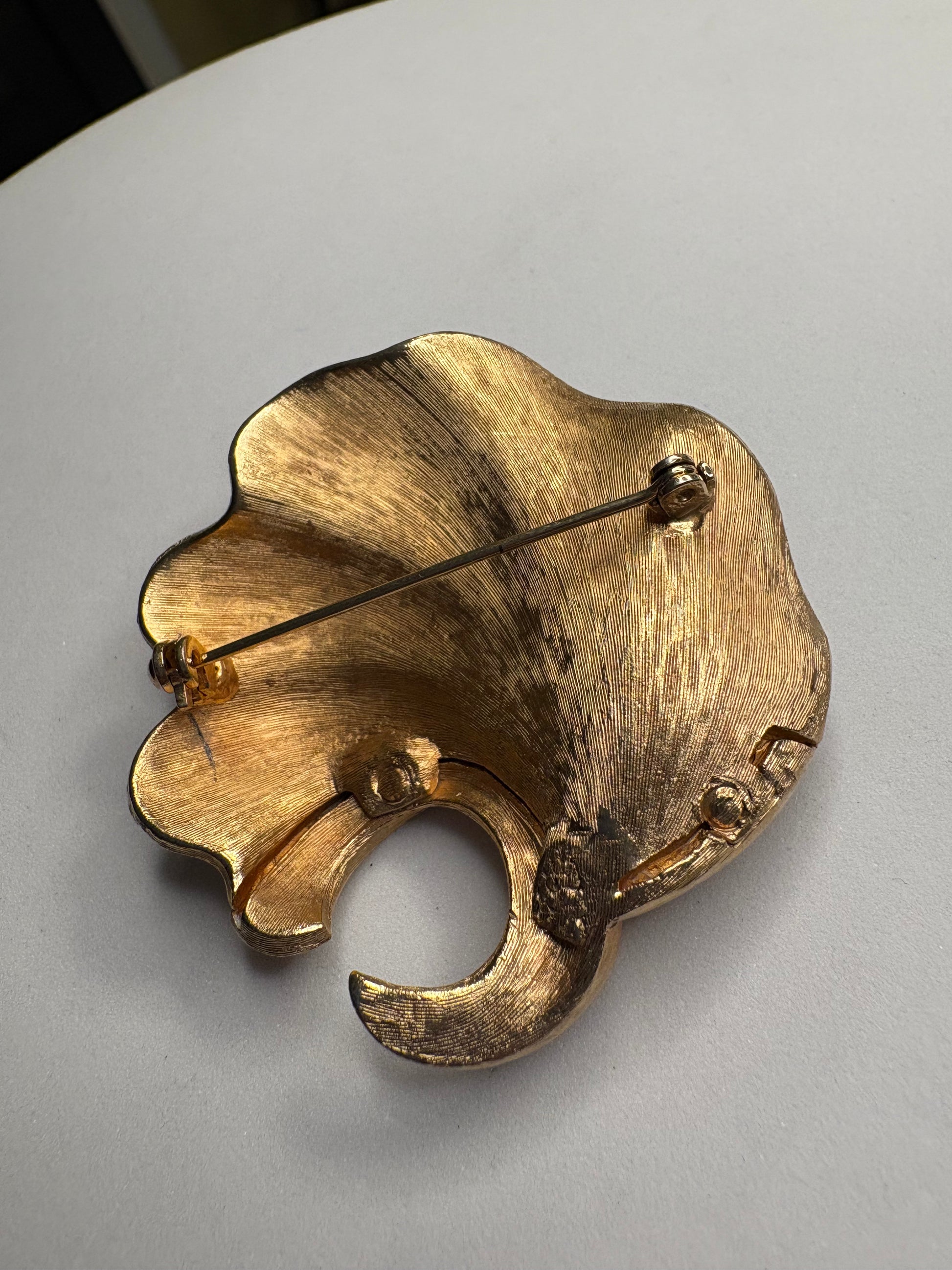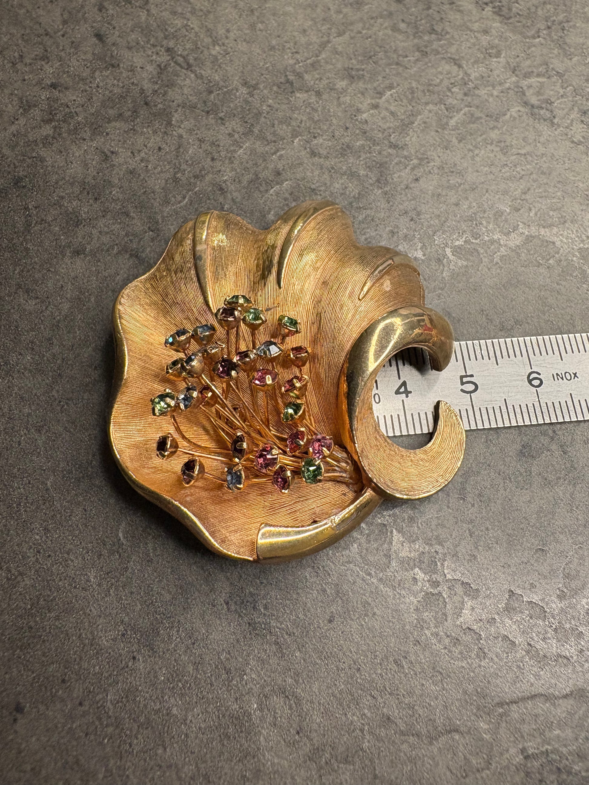 Meravigliosa spilla vintage in metallo color oro satinato con dettagli lucidi, modellata in una forma organica e avvolgente che richiama un grande petalo o una foglia stilizzata. Al centro è presente un ricco bouquet di piccoli cristalli multicolore incastonati che creano un vivace gioco di luce: tonalità rosa, verde, blu e ambra si intrecciano armoniosamente donando brillantezza e movimento. Il contrasto tra la superficie opaca satinata e i punti luce dei cristalli rende il pezzo elegante ma al tempo stesso scenografico. Ideale su cappotti, blazer o abiti da sera.