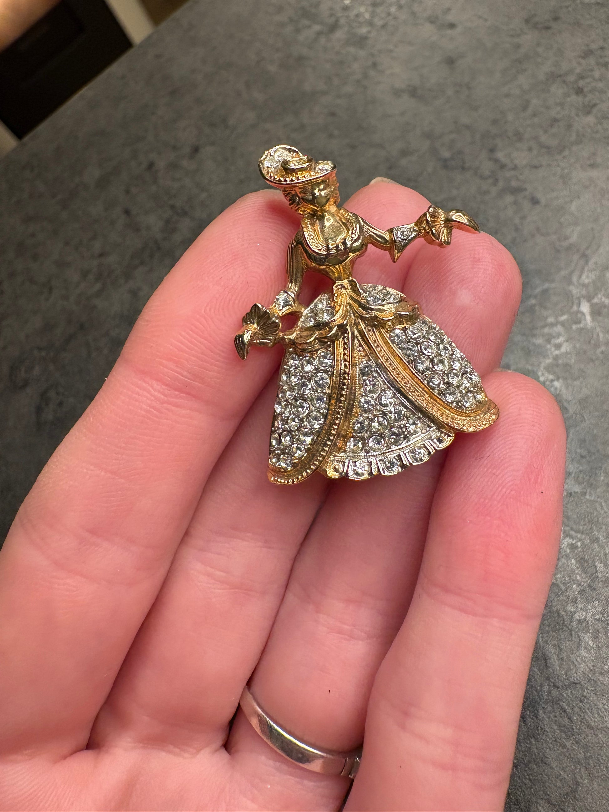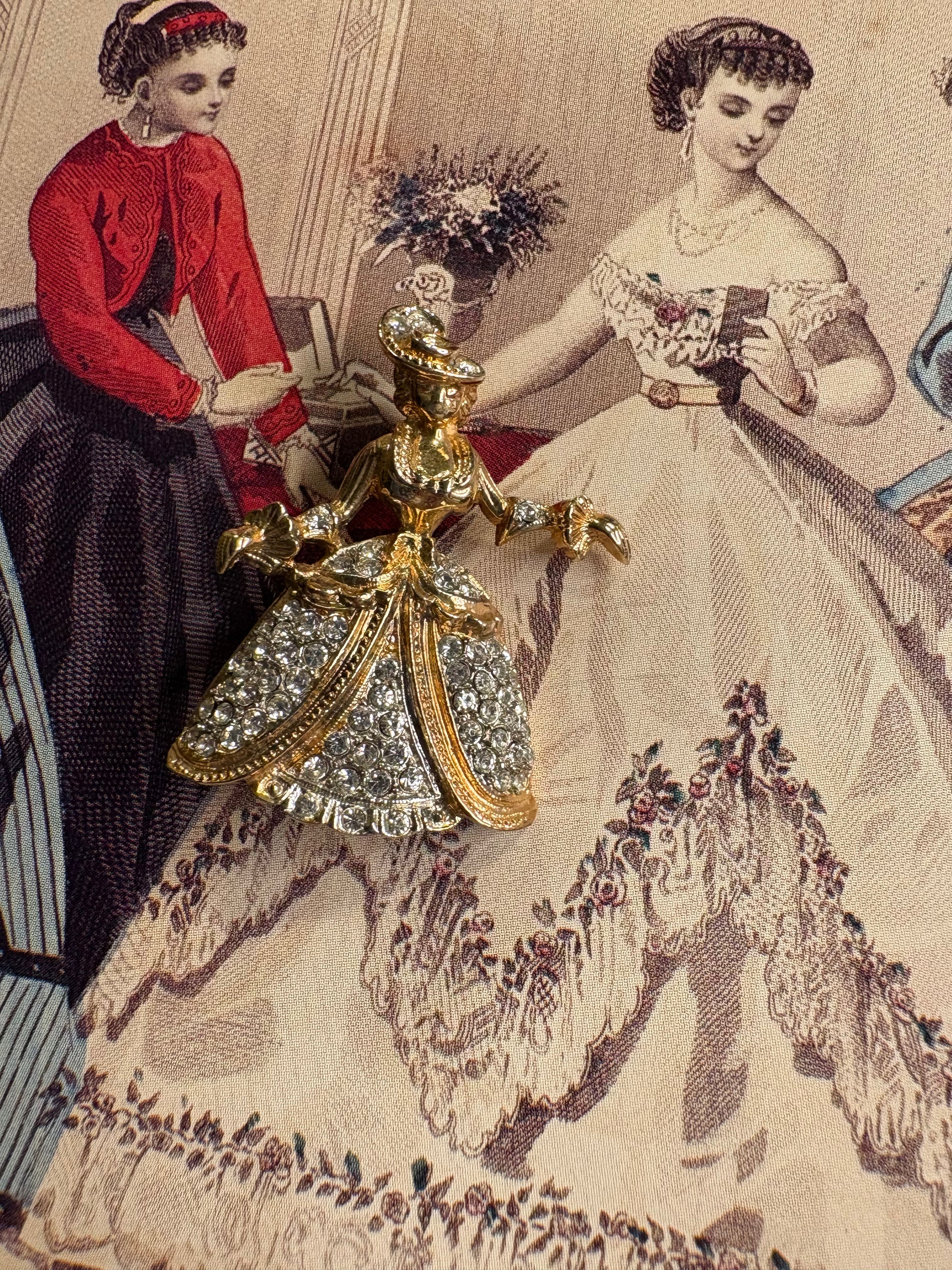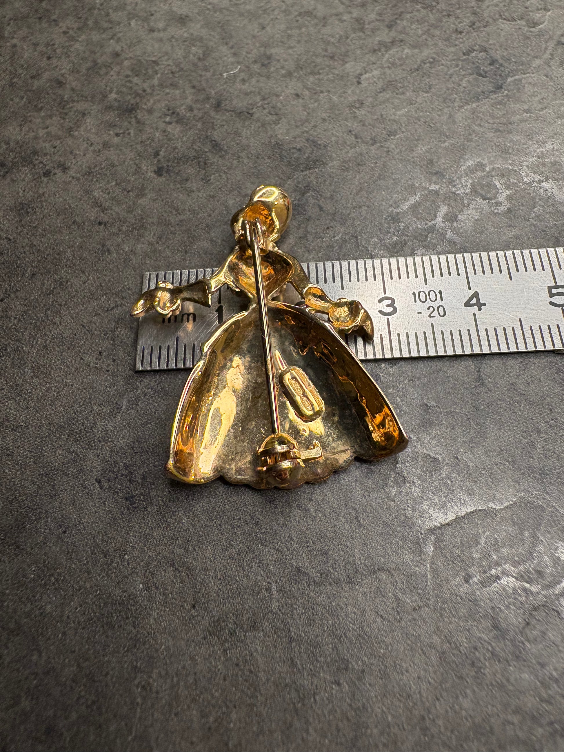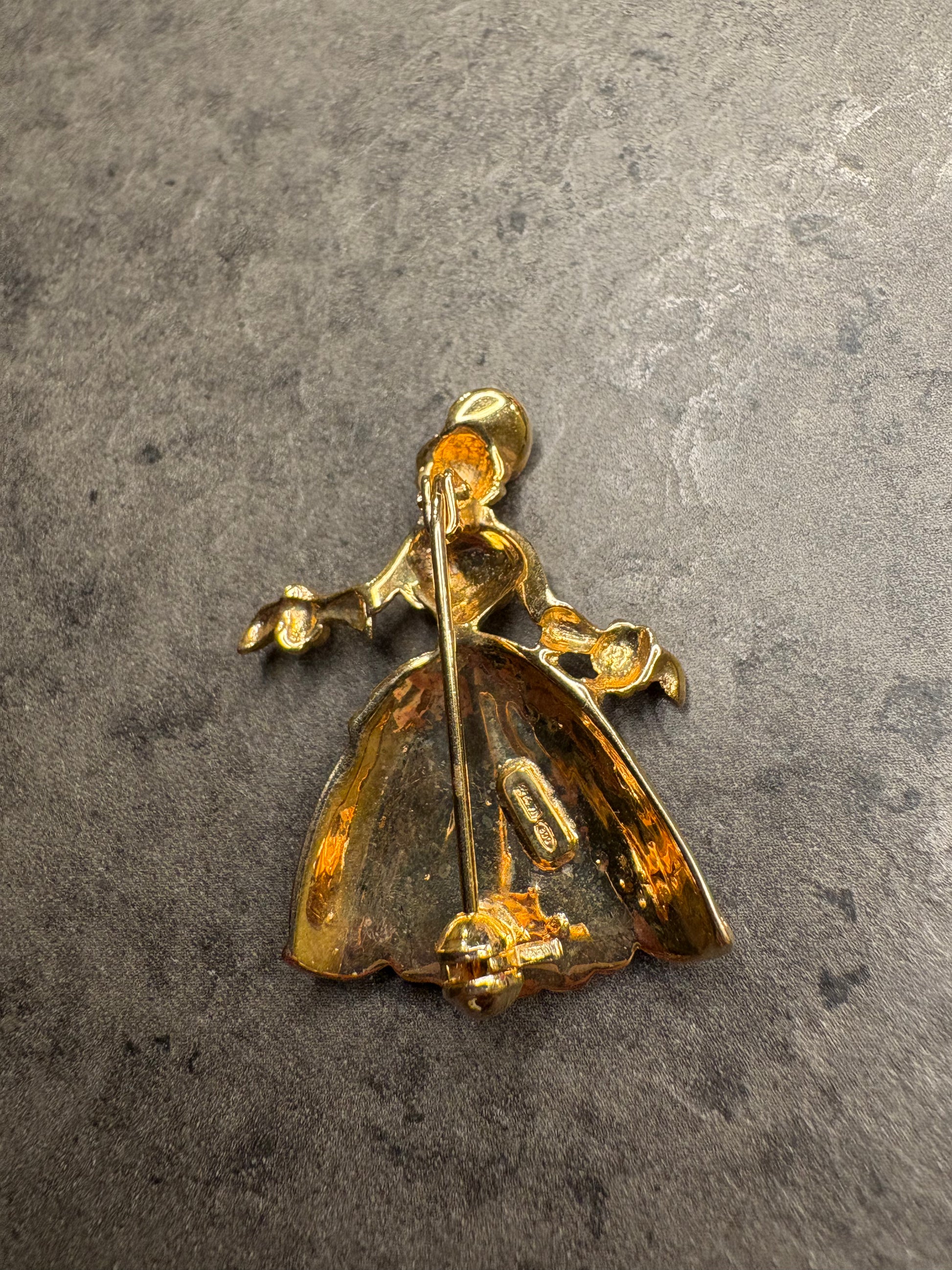 Raffinata spilla vintage in argento dorato 800, raffigurante una dama in abito d’epoca, dal fascino romantico e senza tempo.