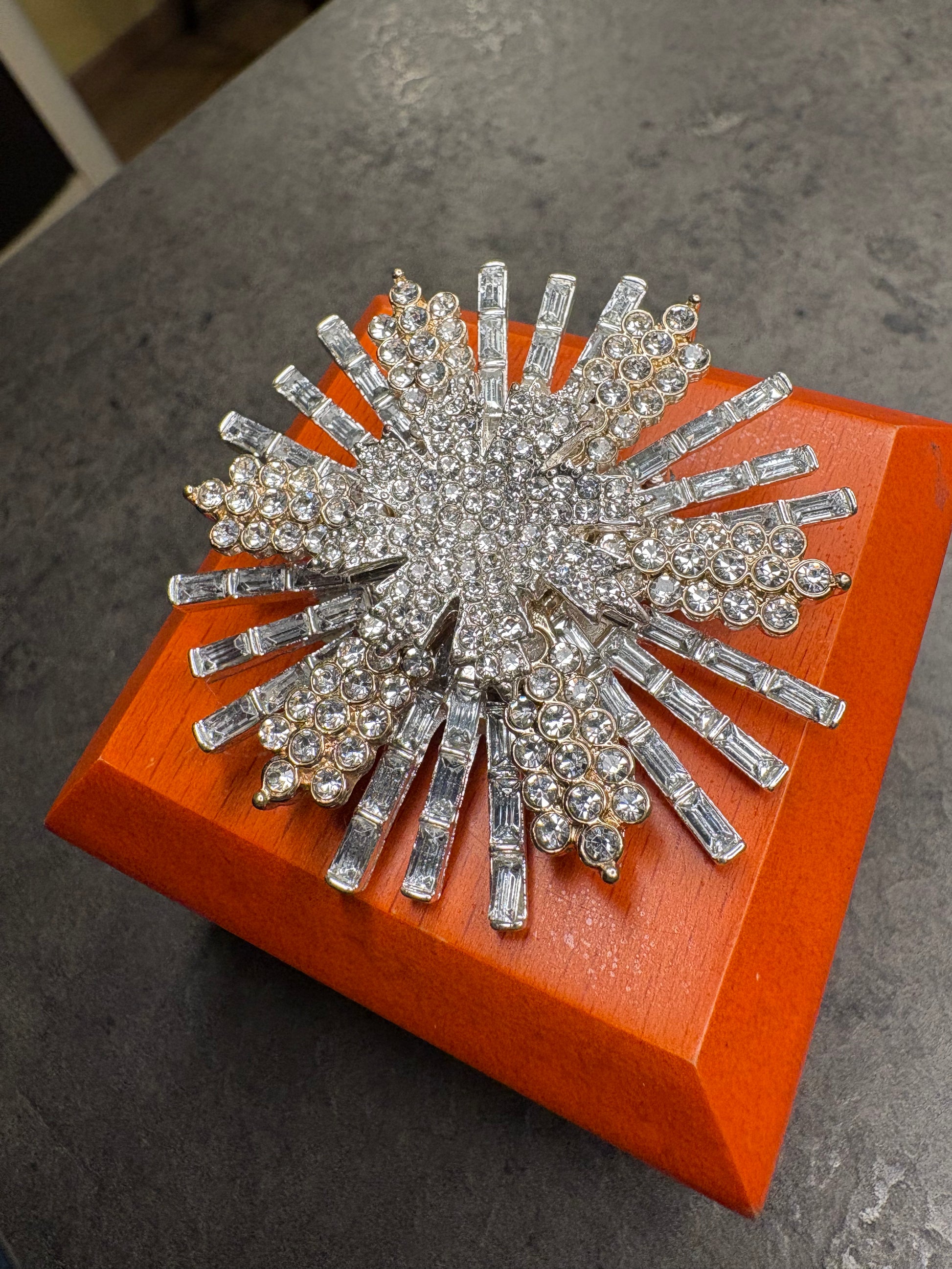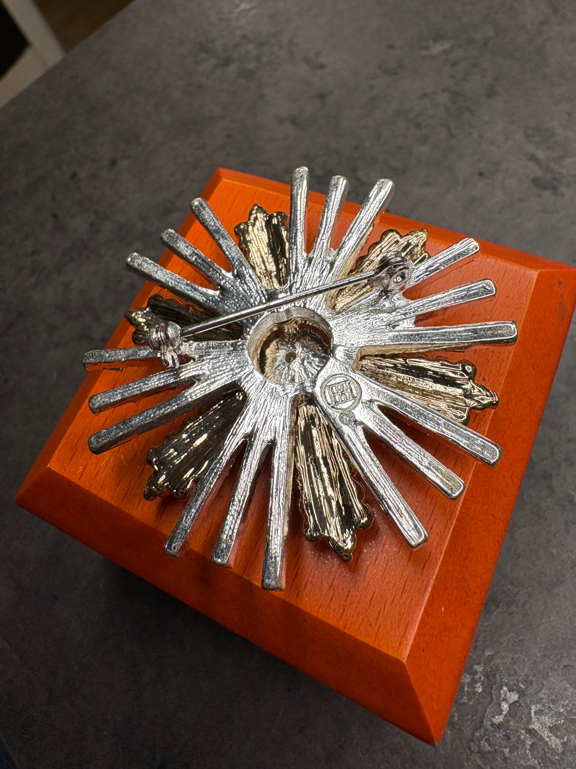 Splendida spilla vintage firmata Dana Buchman, dal design scenografico a forma di stella o fiocco di neve, emblema dello stile elegante e sofisticato della designer americana.