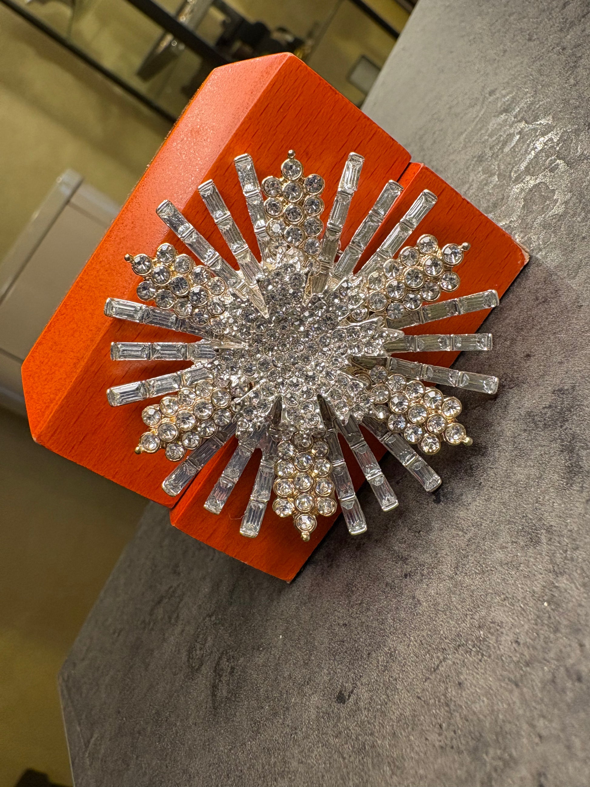 Realizzata in metallo argentato con dettagli dorati, è interamente ricoperta da cristalli luminosi taglio brillante e baguette, disposti a raggiera per creare un effetto tridimensionale di grande impatto.