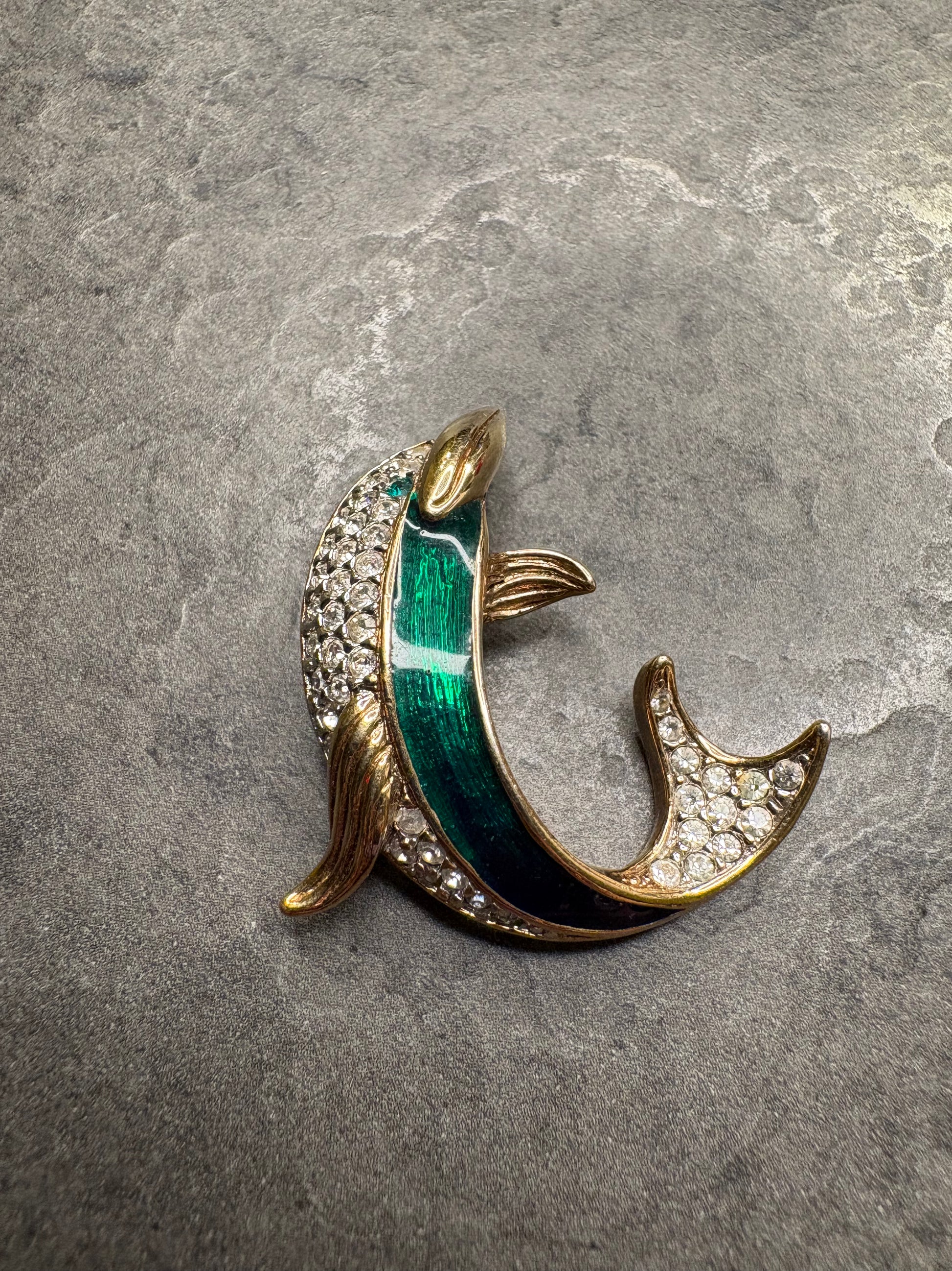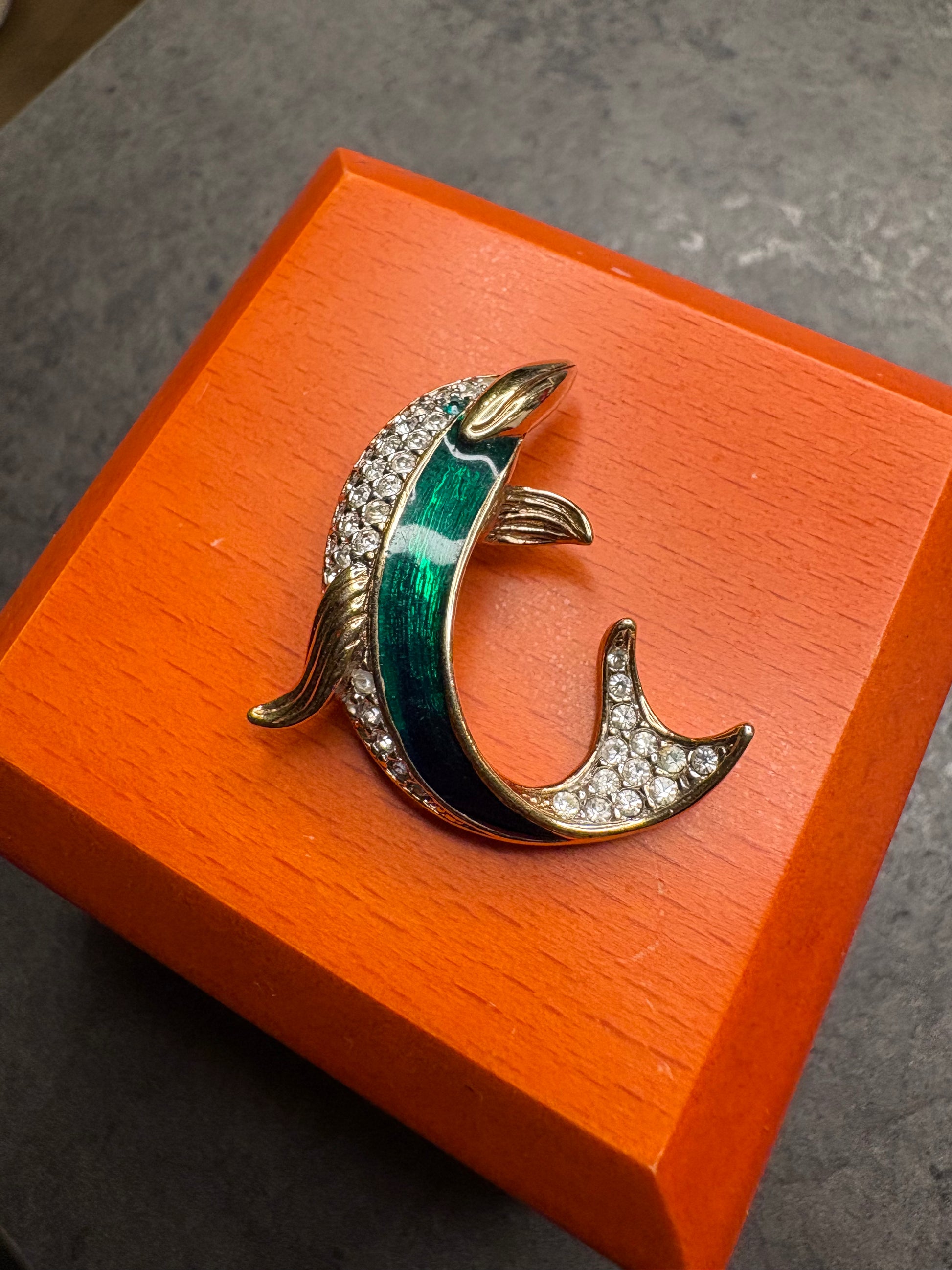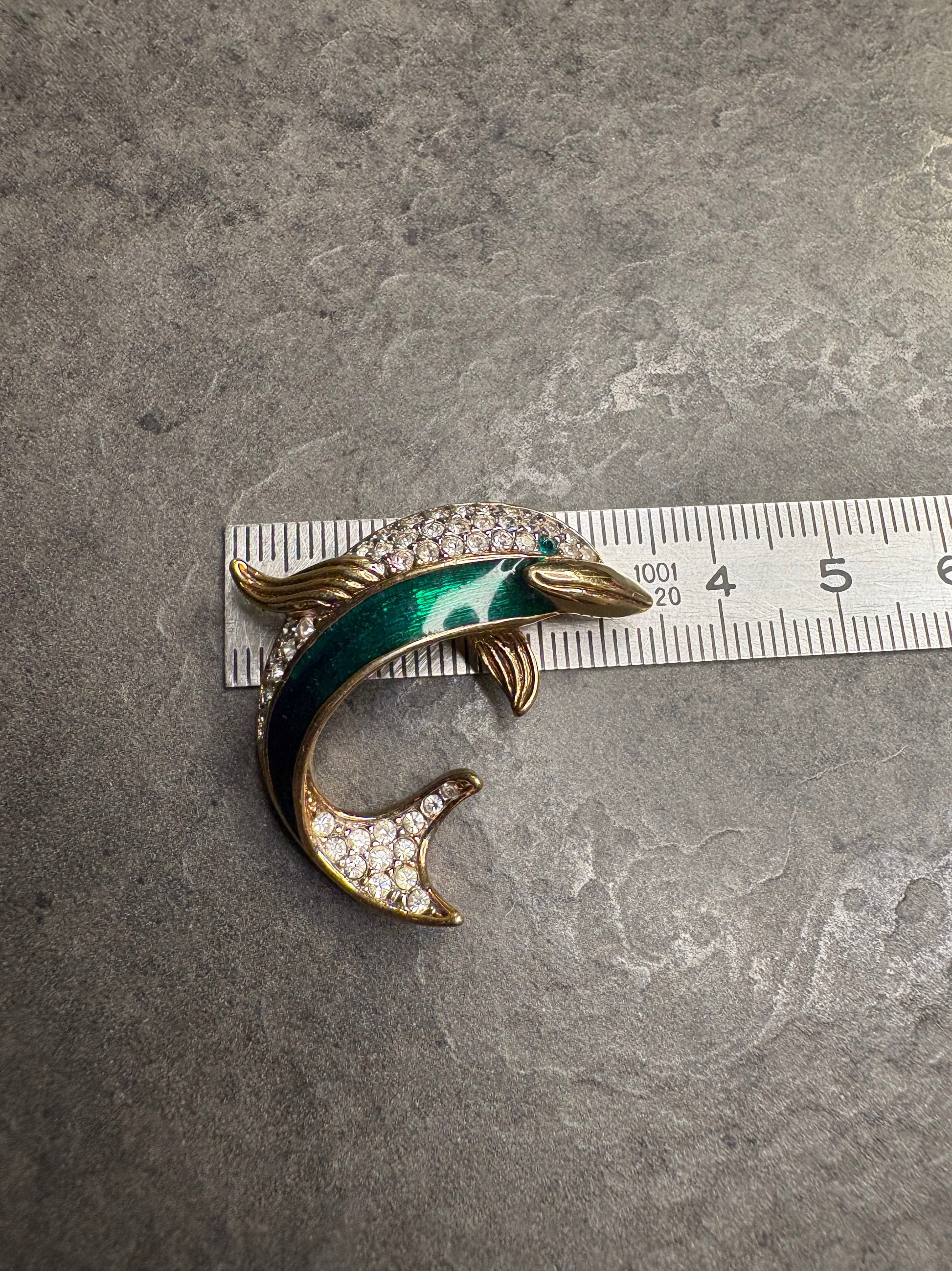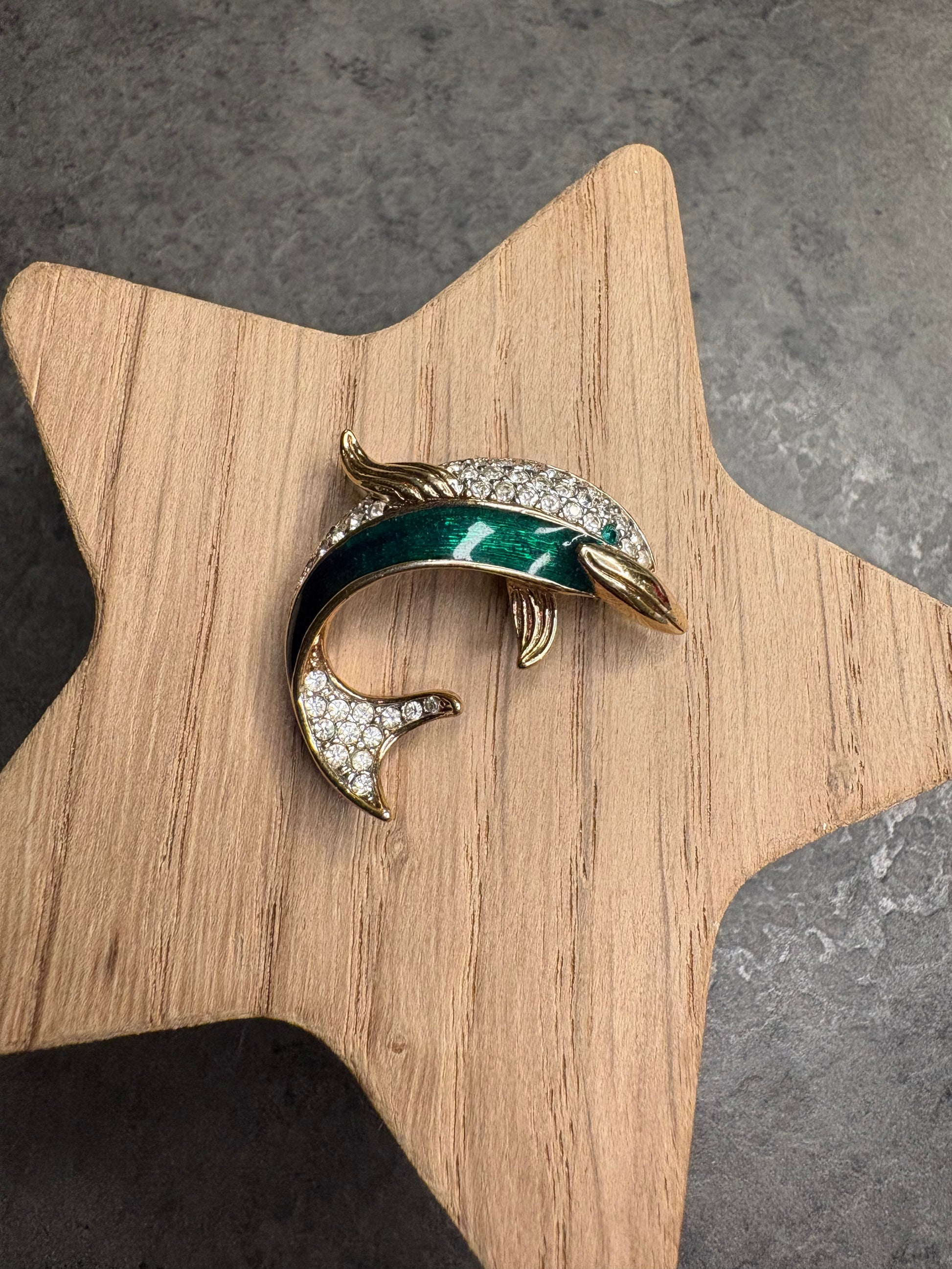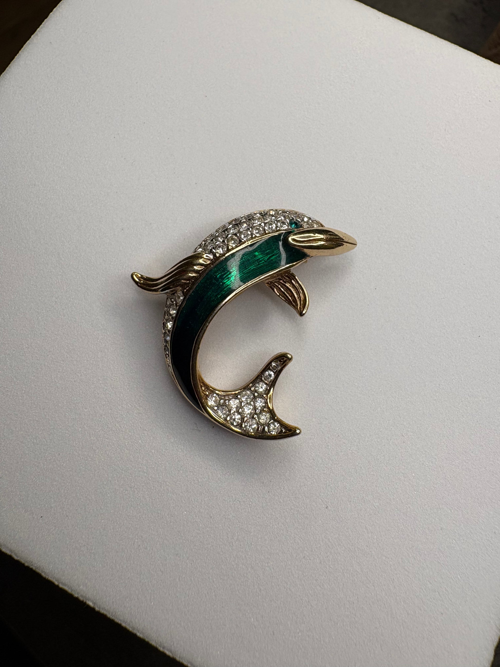 Questo splendido delfino da collezione è firmato Attwood & Sawyer, maison britannica nota per l’alta qualità delle sue creazioni. Il corpo del delfino è decorato con smalto sfumato dal verde al blu, che richiama i riflessi dell’acqua, mentre la coda e parte del dorso sono impreziositi da cristalli Swarovski che aggiungono brillantezza e movimento. La linea fluida e la resa tridimensionale trasmettono un forte senso di eleganza e leggerezza. Un gioiello di grande impatto visivo e valore collezionistico.