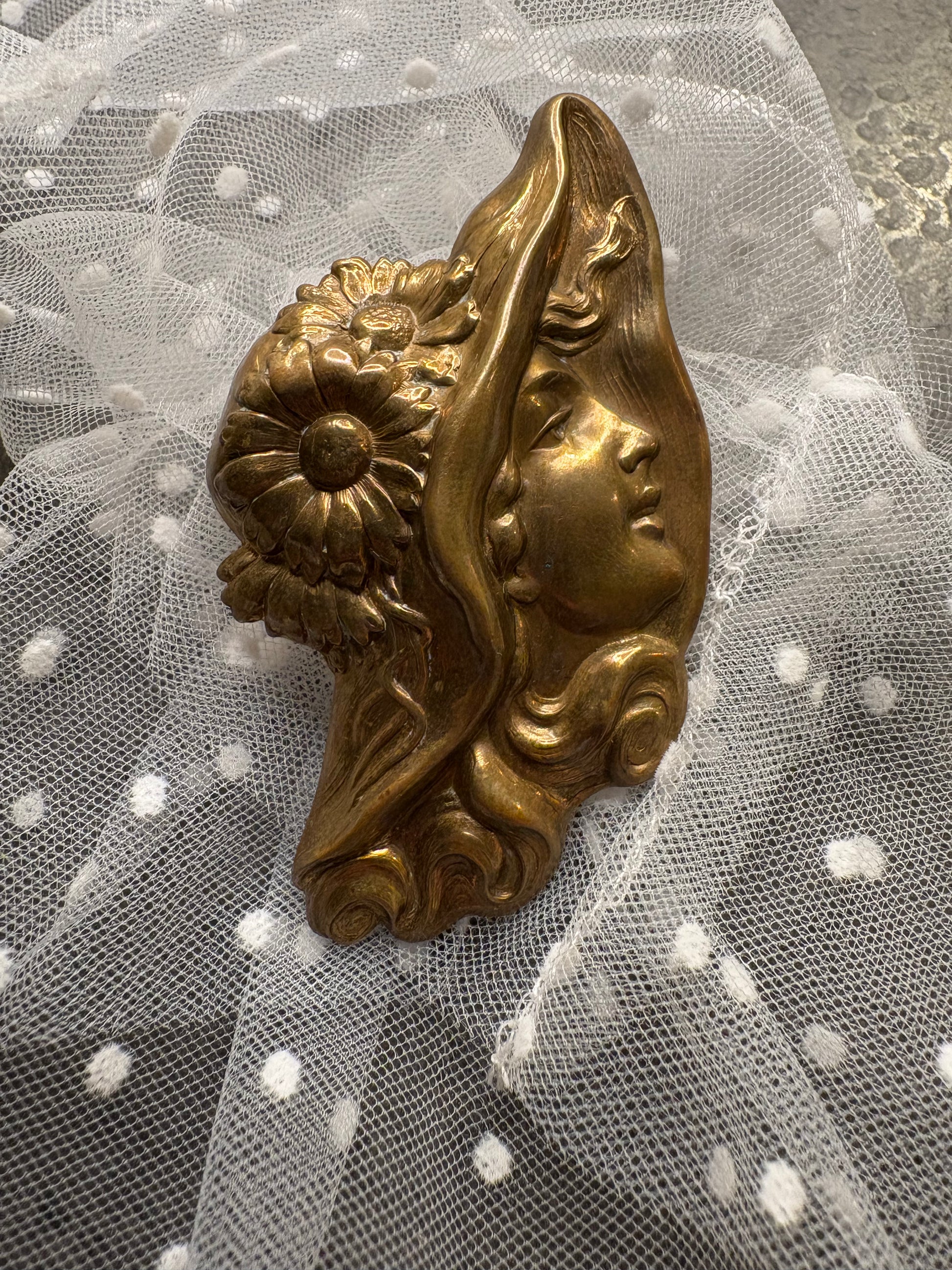 Realizzata in ottone dorato con finitura lucida anticata, è un pezzo in rilievo che dà tridimensionalità al viso delicato, agli occhi socchiusi, alle labbra morbide e al cappello che avvolge la figura come un’aureola floreale.