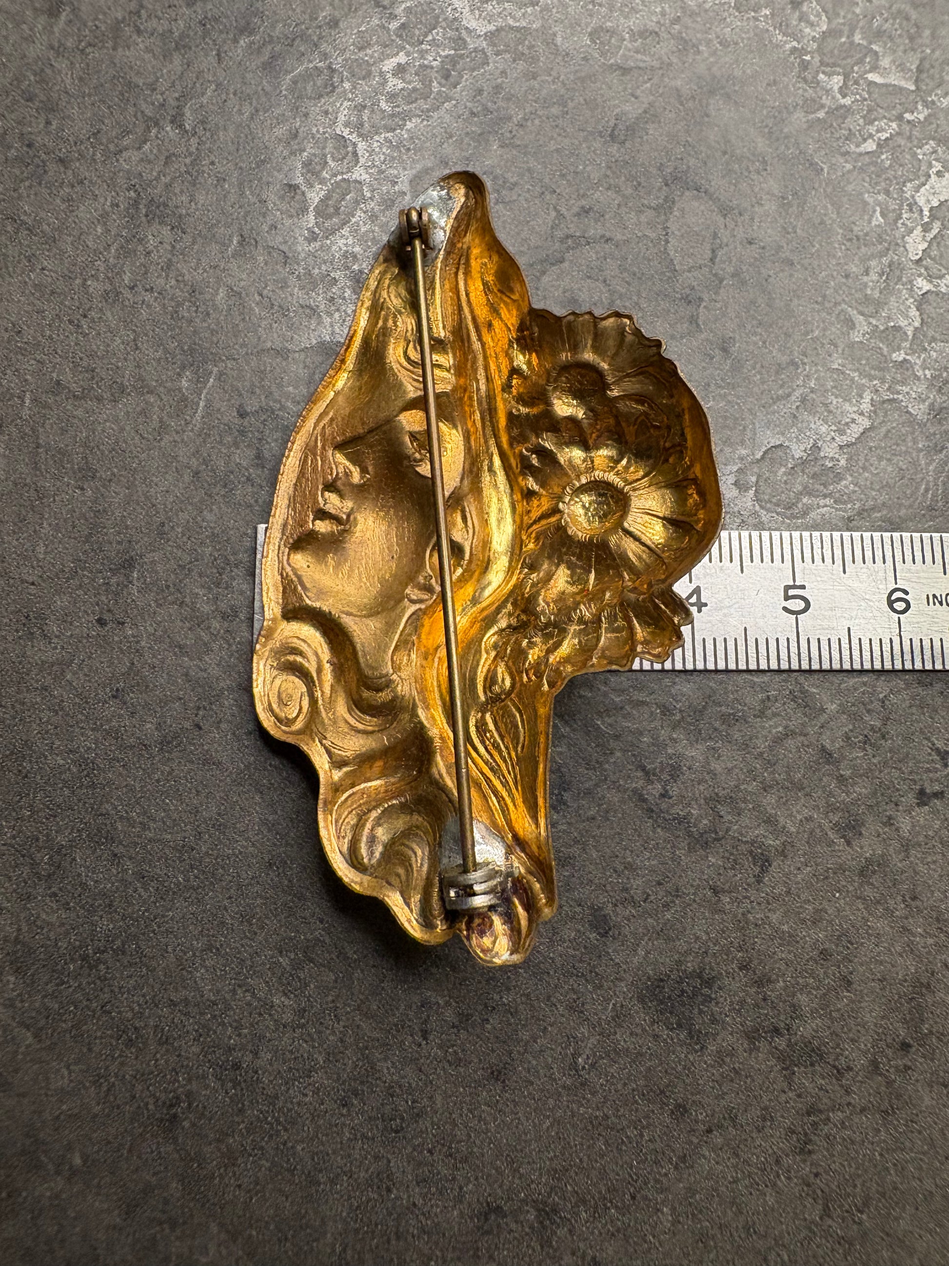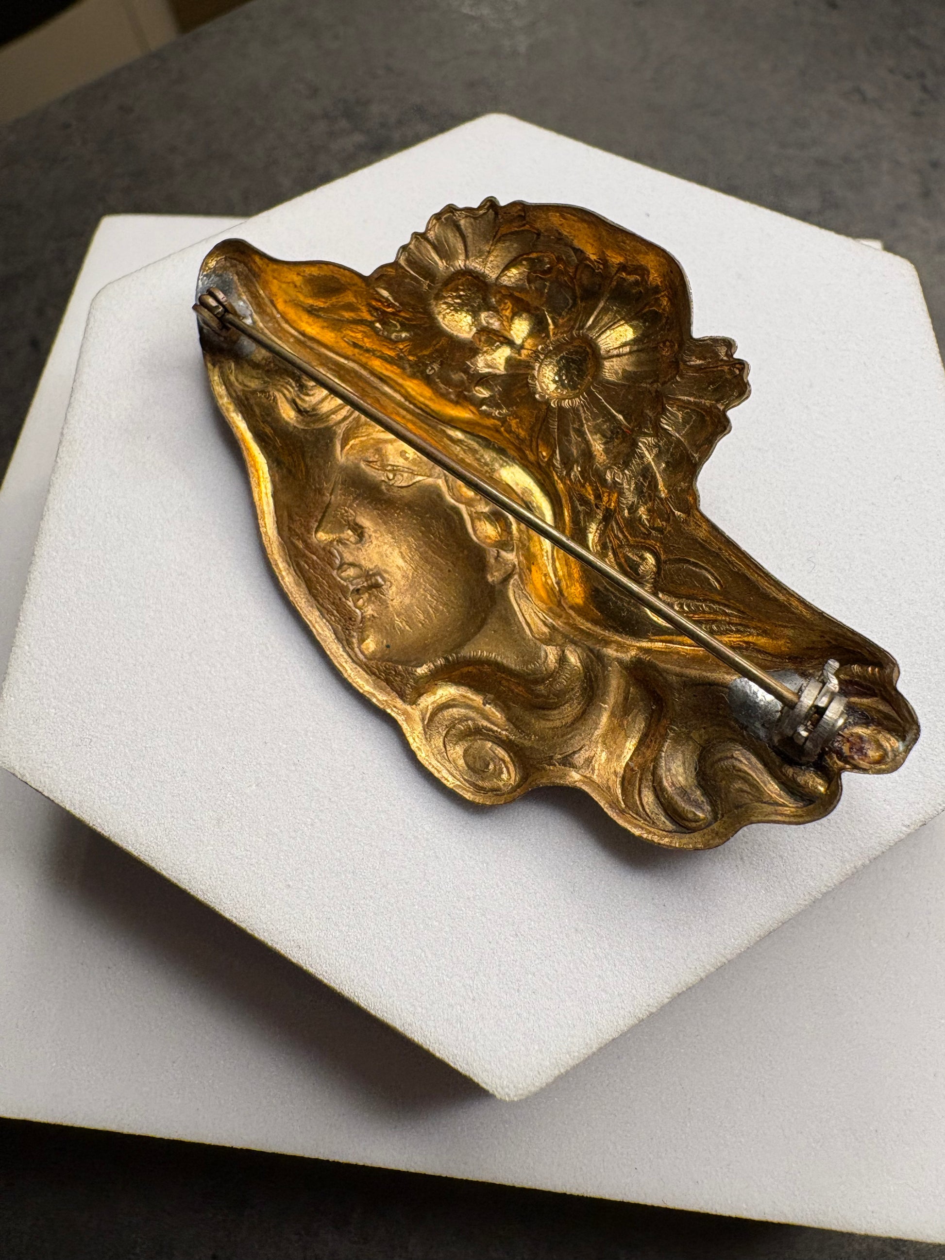 Questa bellissima spilla Art Nouveau raffigura il profilo di una donna serena e sognante, con capelli fluenti e ondulati che si intrecciano armonicamente con un grande cappello a falda larga. Sul cappello spiccano importanti fiori margherite con petali ampi e dettagliati, tipici del periodo: linee sinuose, asimmetrie organiche e un senso di movimento fluido.