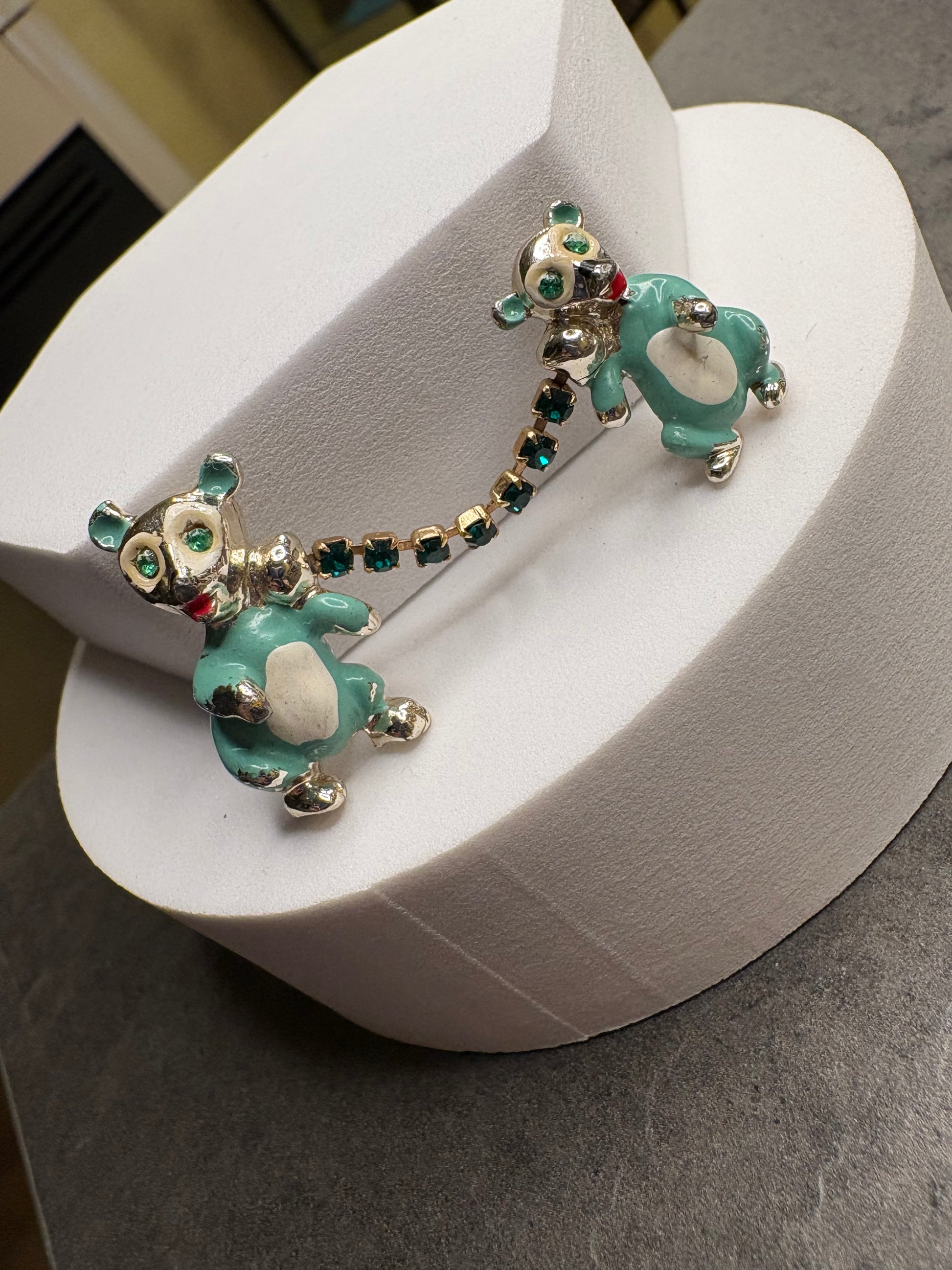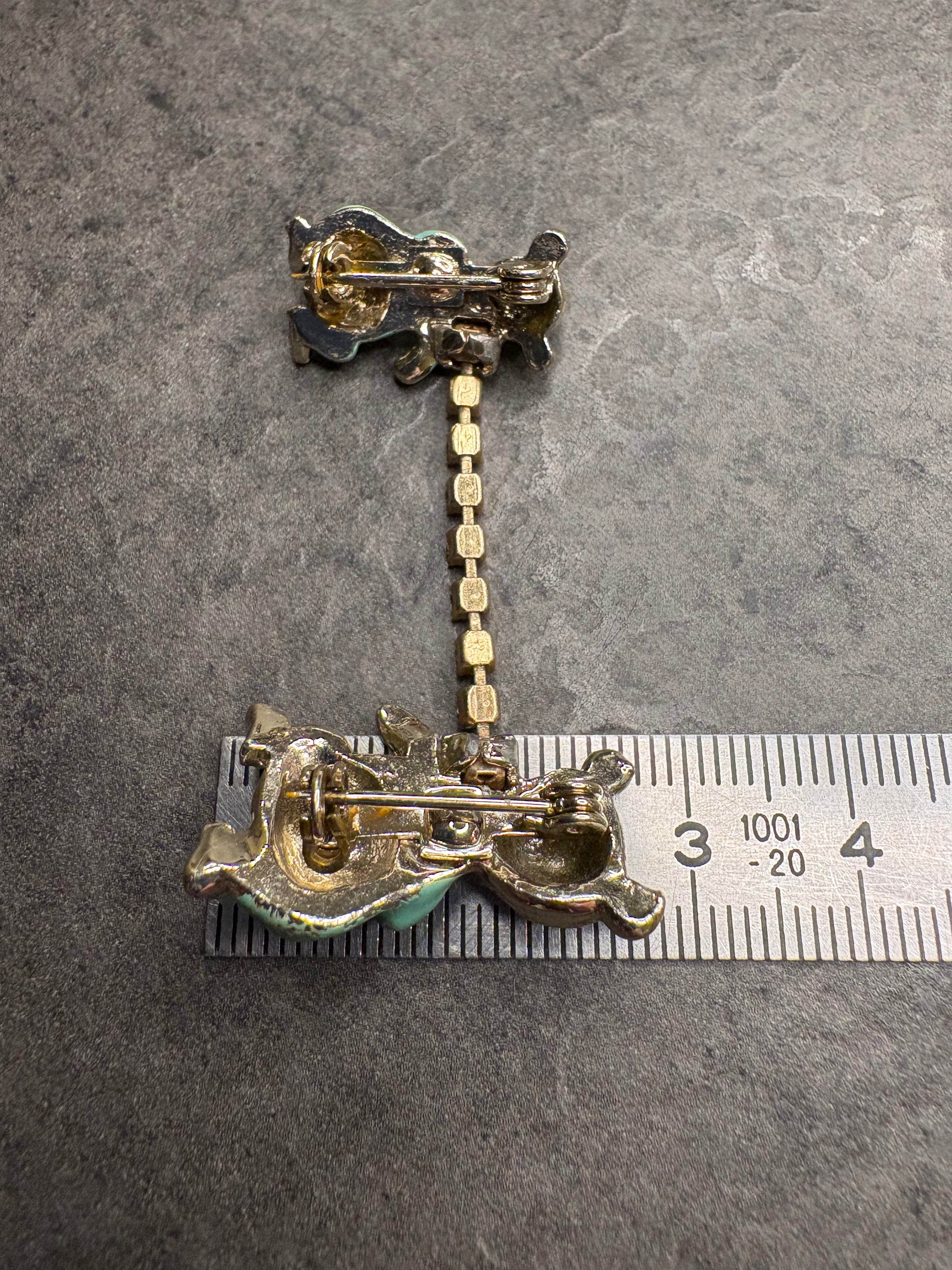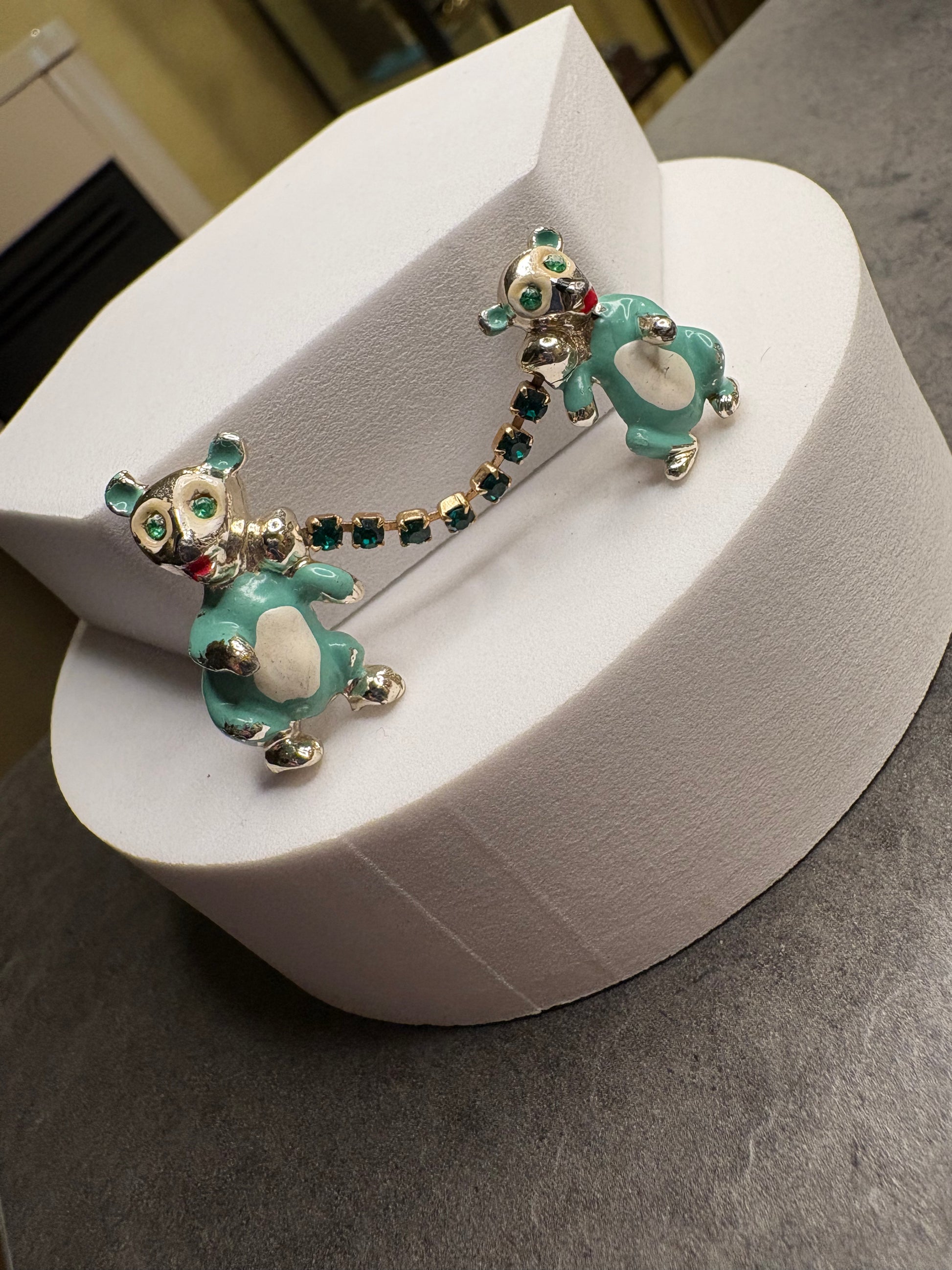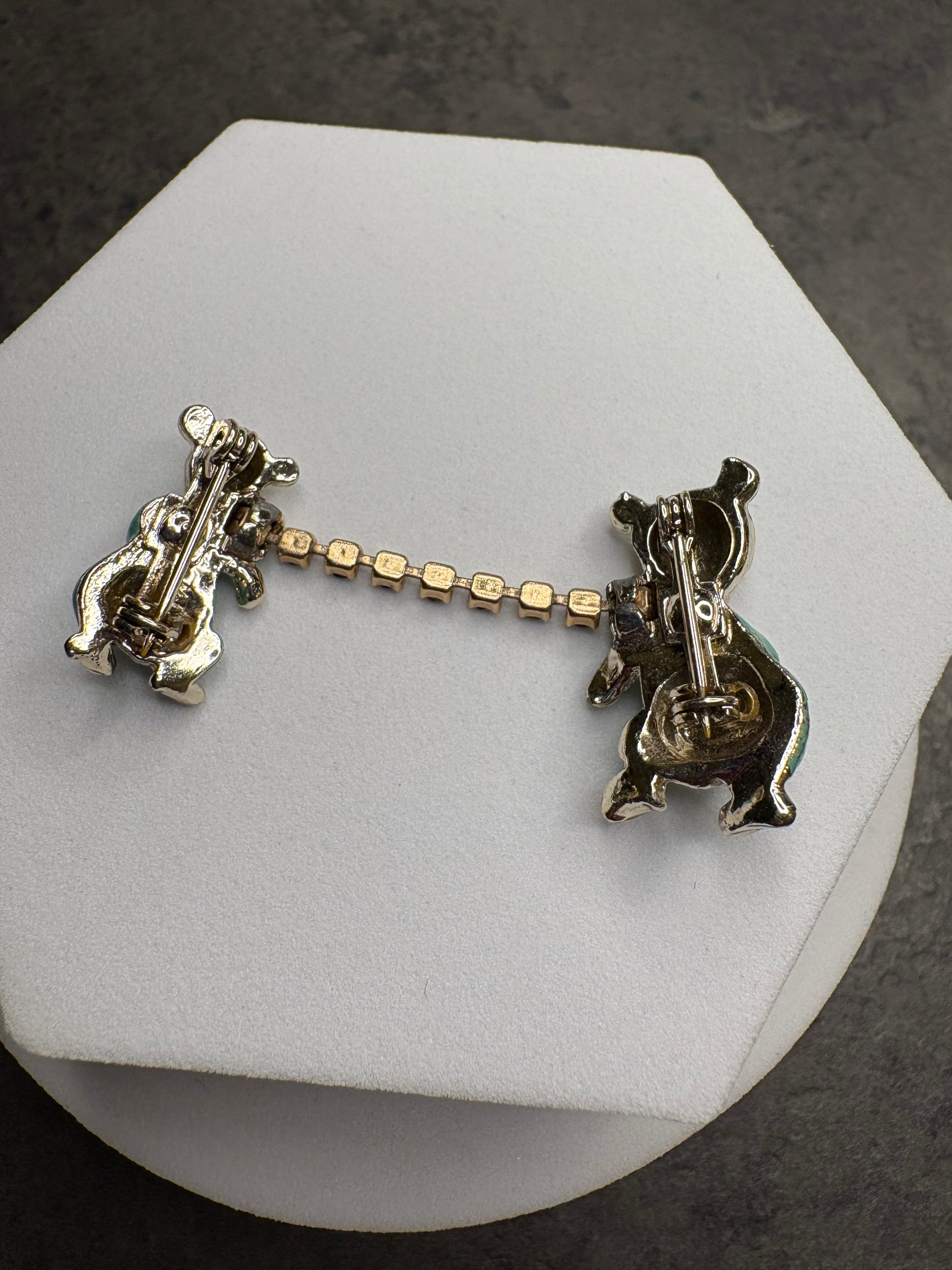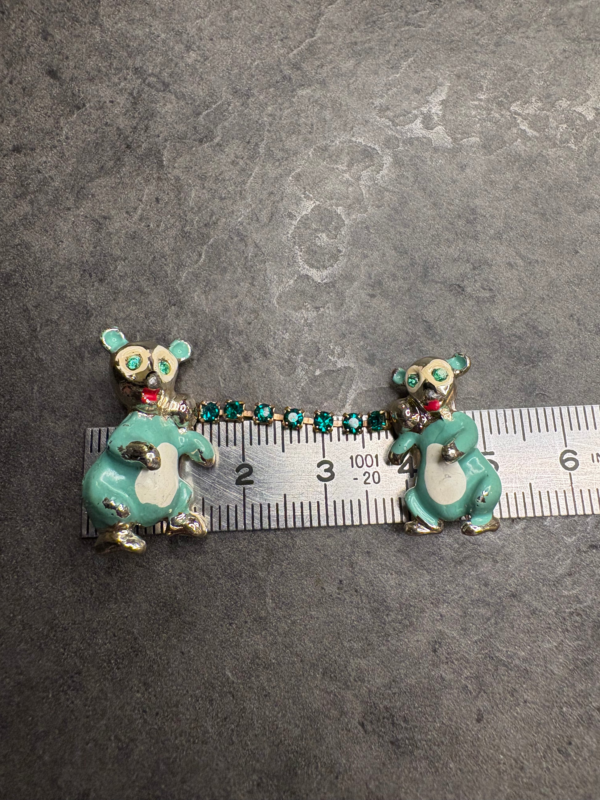 Deliziosa e rara doppia spilla raffigurante due piccoli animali stilizzati (tipo orsetti / cuccioli), realizzati in metallo smaltato verde acqua, collegati tra loro da una catena decorata con cristalli verdi.