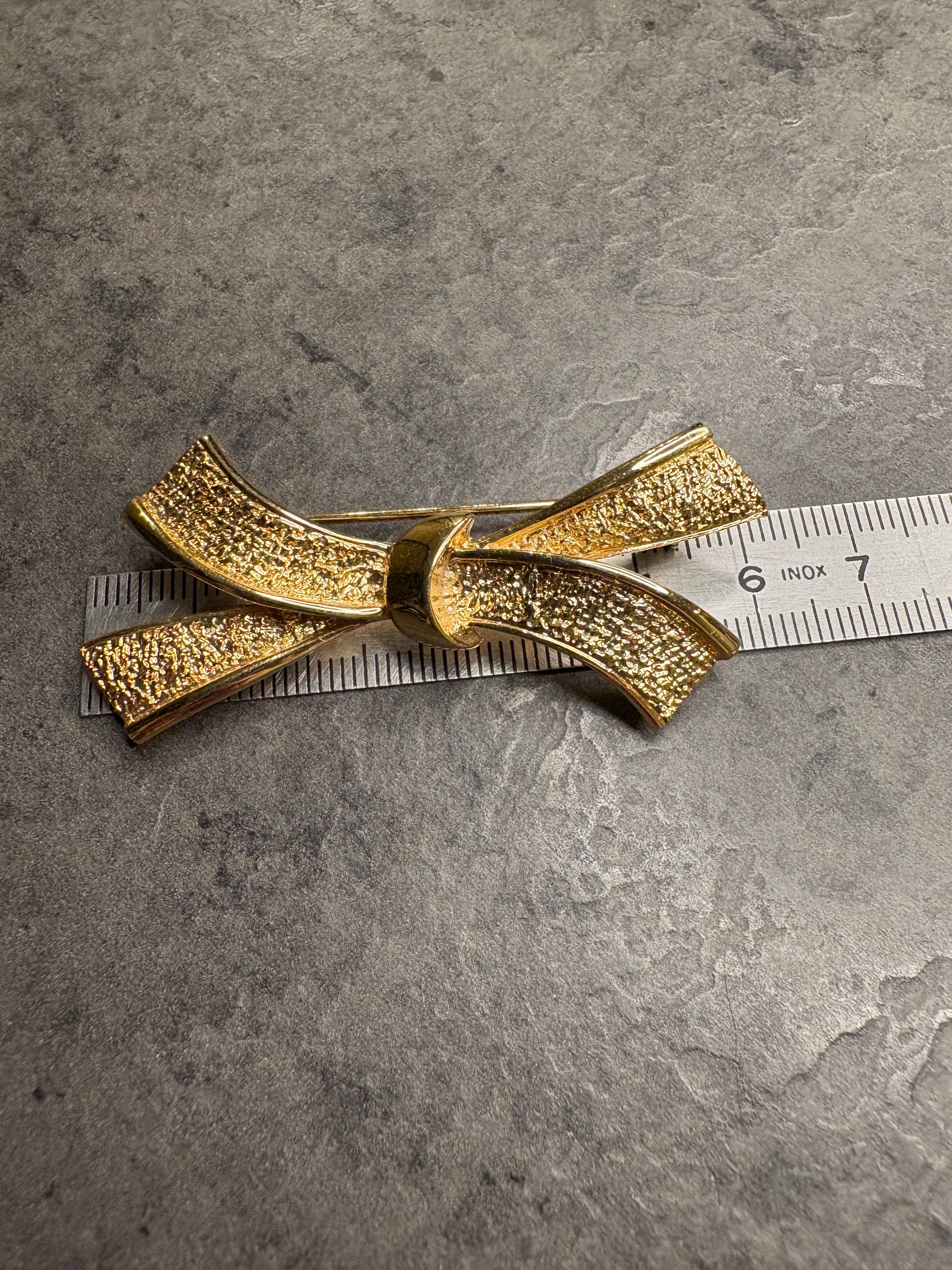 Raffinata spilla a fiocco dal design stilizzato ed elegante, realizzata in metallo color oro con particolare finitura effetto “sabbioso” che dona una texture opaca e vellutata. Le superfici leggermente incurvate catturano la luce in modo delicato, mentre il nodo centrale lucido crea un piacevole contrasto. Femminile e versatile, ideale per giacche, cardigan o abiti eleganti.
