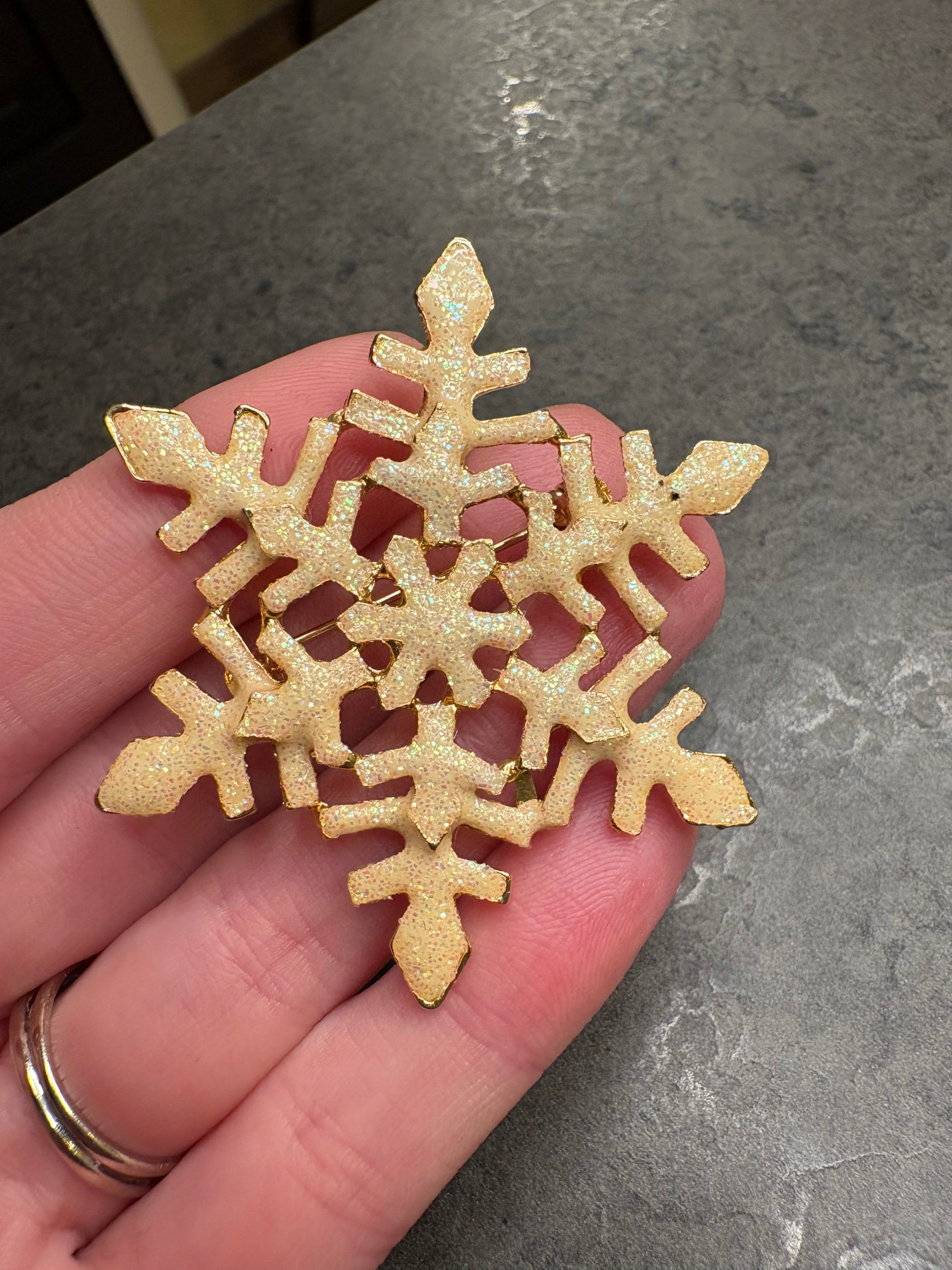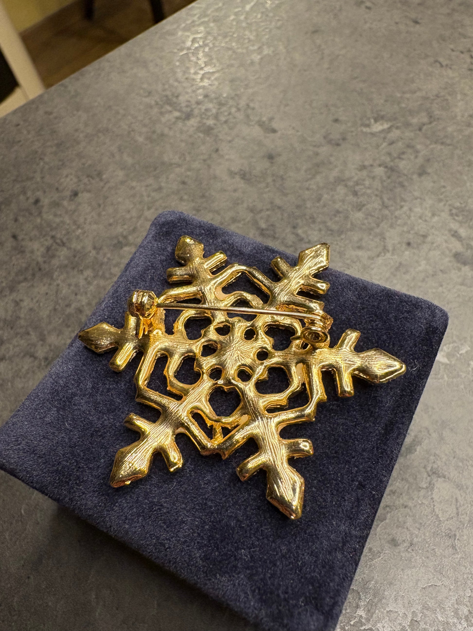 Questa splendida spilla natalizia a forma di fiocco di neve è un raffinato esempio di gioiello decorativo d’epoca, perfetto per le festività invernali.