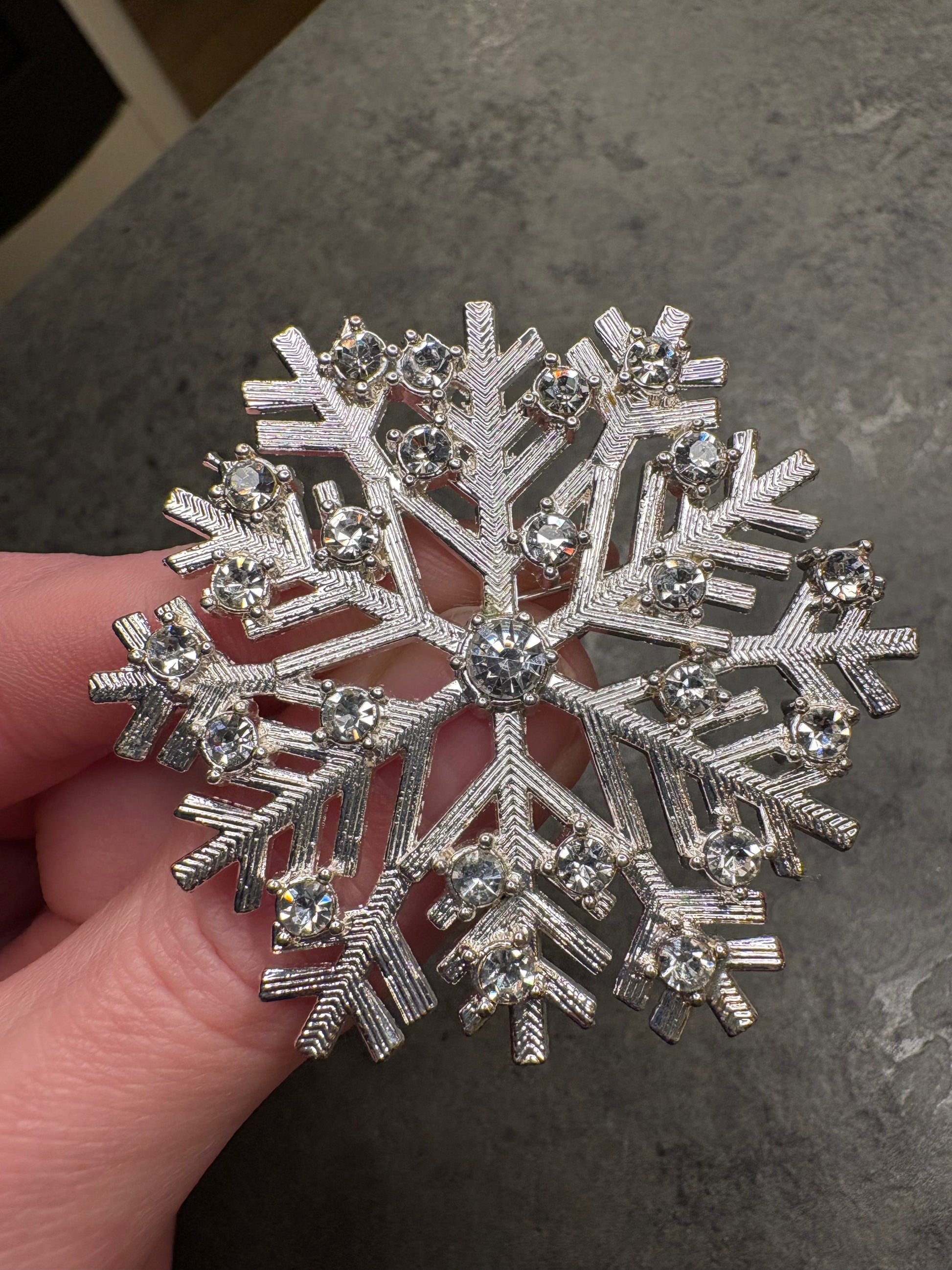 Questa incantevole spilla natalizia a forma di fiocco di neve cattura tutta la magia e la luminosità dell’inverno.