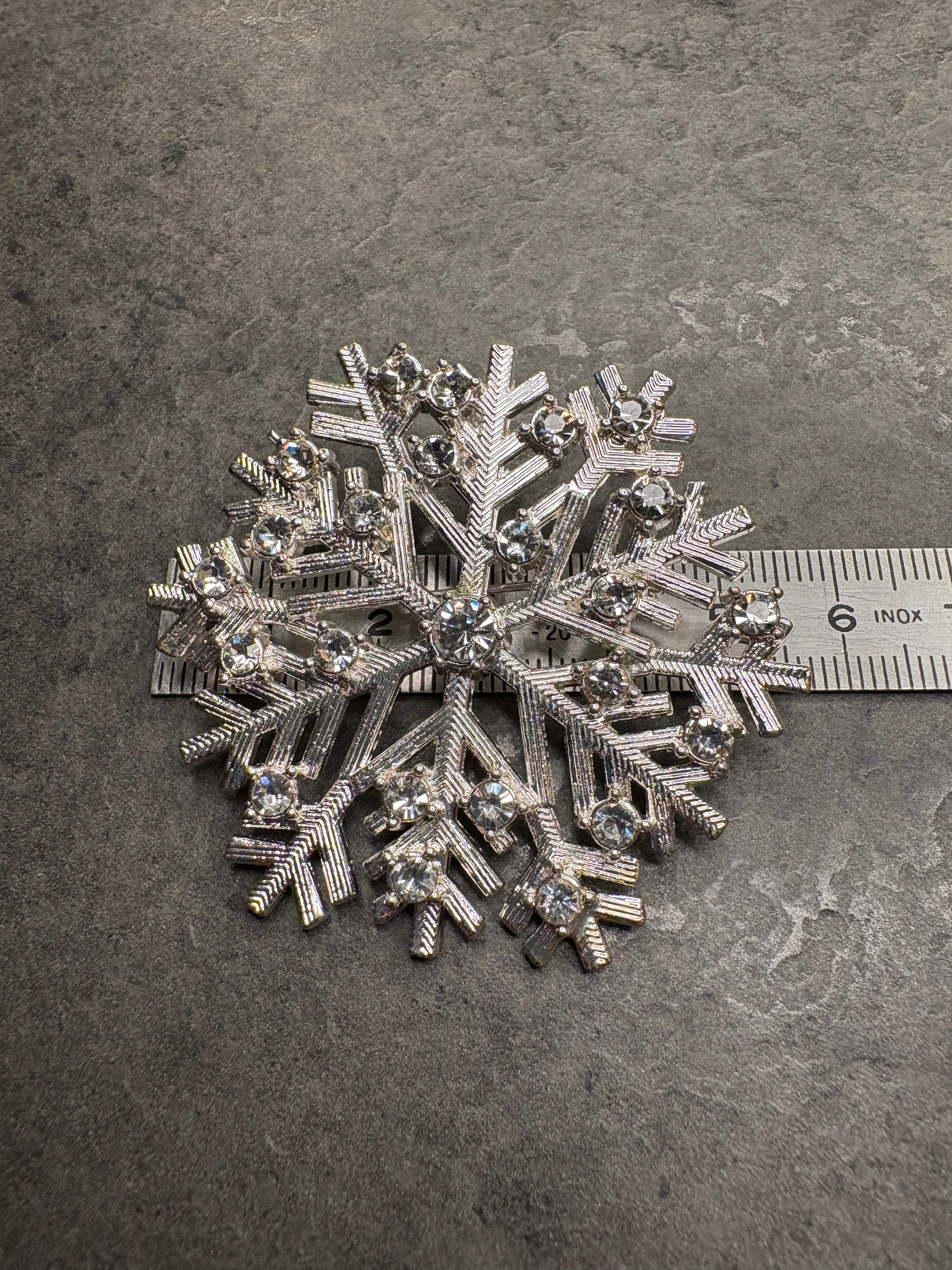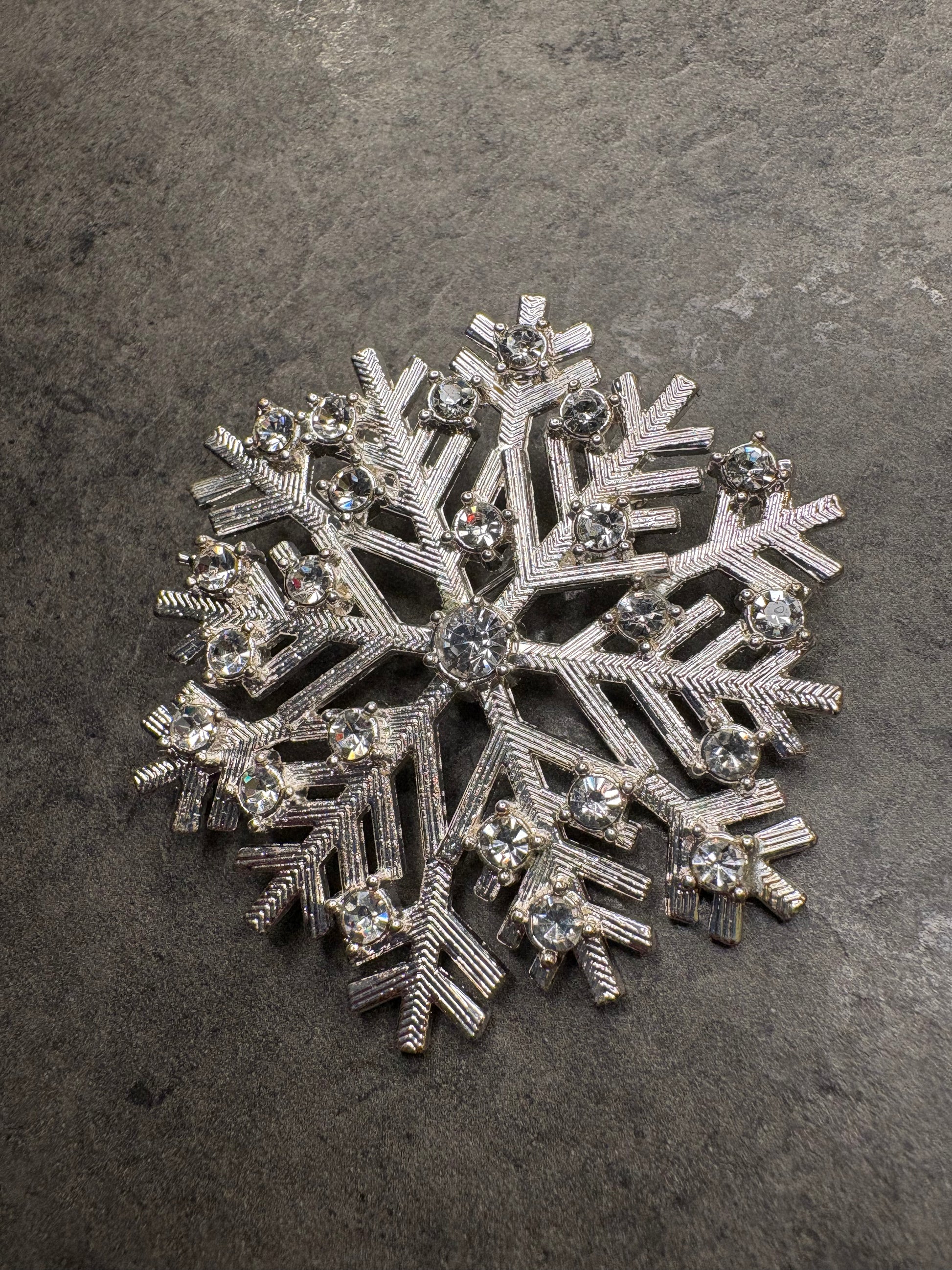 Realizzata in metallo argentato lucente, presenta un disegno geometrico elegante e ben definito, che riproduce con precisione le delicate ramificazioni di un cristallo di ghiaccio. Ogni punta è impreziosita da brillanti strass trasparenti, mentre al centro risplende una pietra più grande che accentua la luce e dona profondità alla composizione.