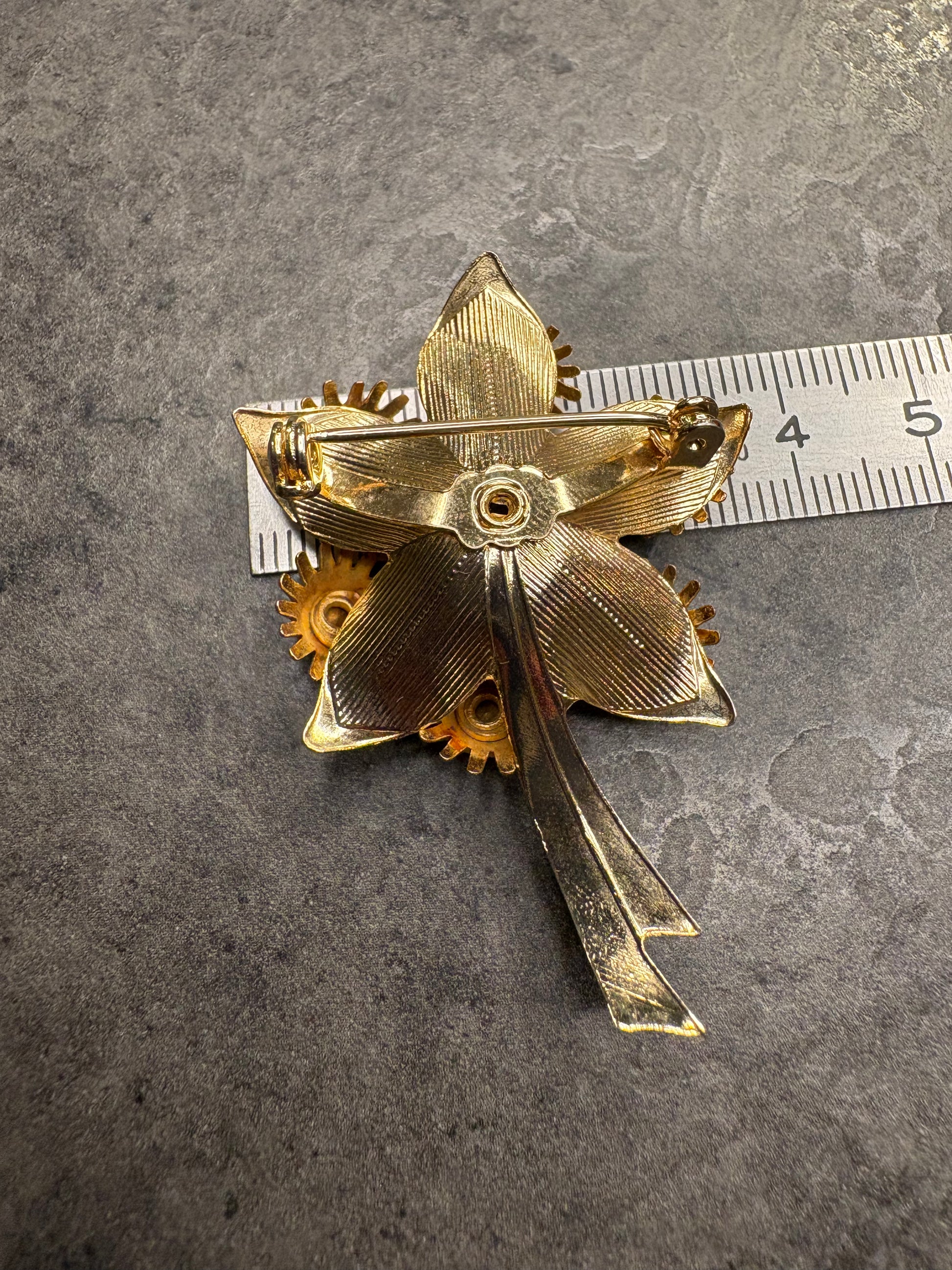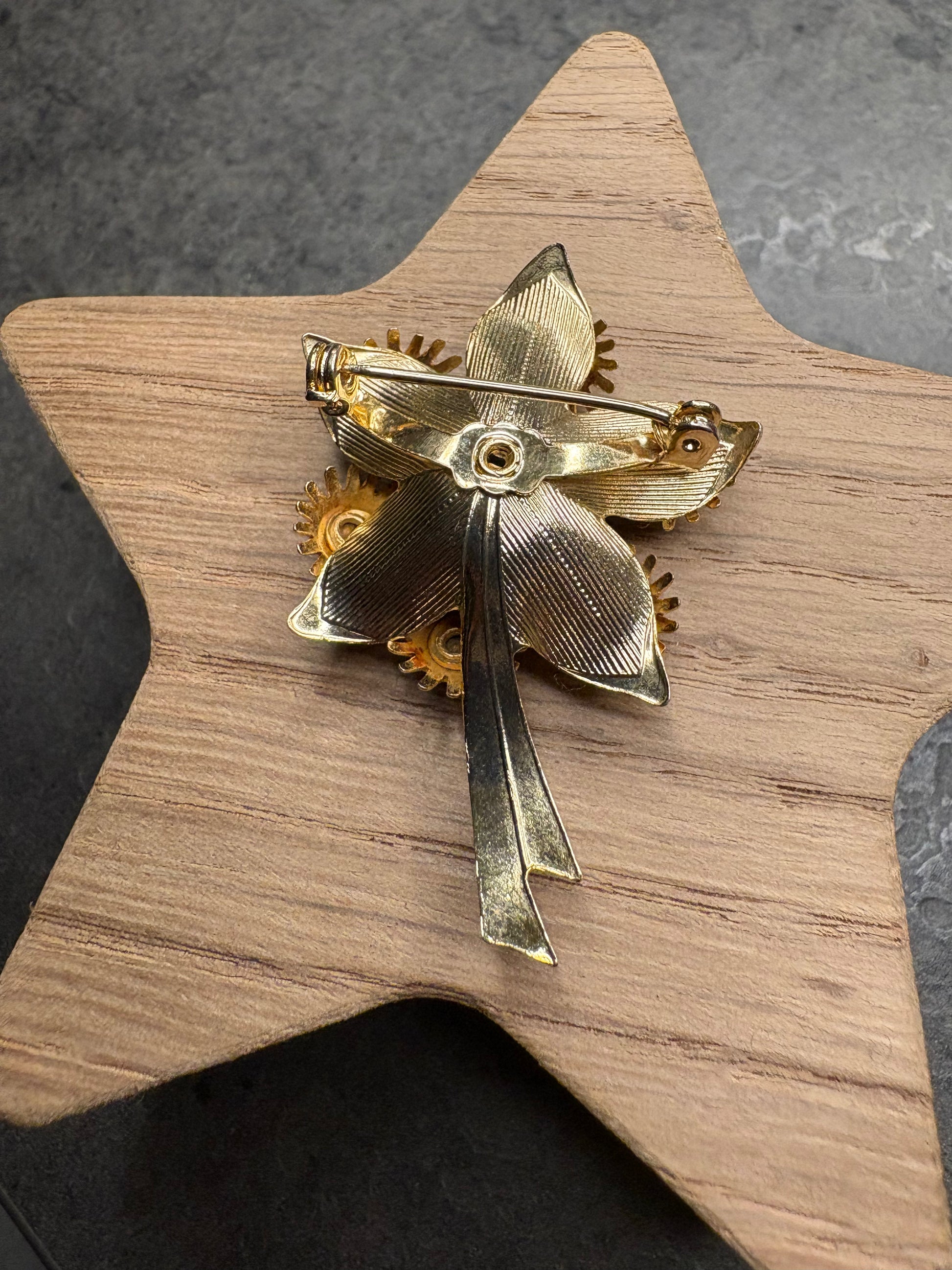 Meravigliosa spilla vintage tridimensionale a forma di fiore, realizzata in metallo color oro con una struttura ricca e stratificata. I petali sono lavorati con movimento e profondità, creando un effetto 3D molto scenografico. Al centro spicca un grande cristallo marrone dalle tonalità calde e profonde, circondato da cristalli più piccoli coordinati che amplificano la luminosità dell’insieme. Il gioco di luci tra metallo dorato e cristalli dona alla spilla un aspetto prezioso ed elegante, perfetto per impreziosire qualsiasi outfit.