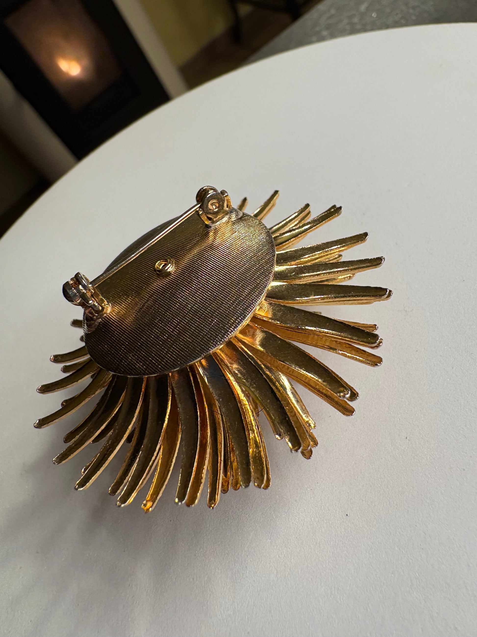 Meravigliosa spilla vintage tridimensionale in metallo color oro, dal design scenografico e ricco di movimento. La composizione è formata da numerosissimi petali sottili e allungati, disposti radialmente come un’esplosione floreale. I petali alternano finitura lucida e satinata, creando un raffinato gioco di luce e texture che dona profondità e brillantezza. La struttura è ben costruita, con volume importante ma armonioso. Pezzo molto decorativo e d’impatto, perfetto su cappotti, blazer o abiti eleganti.