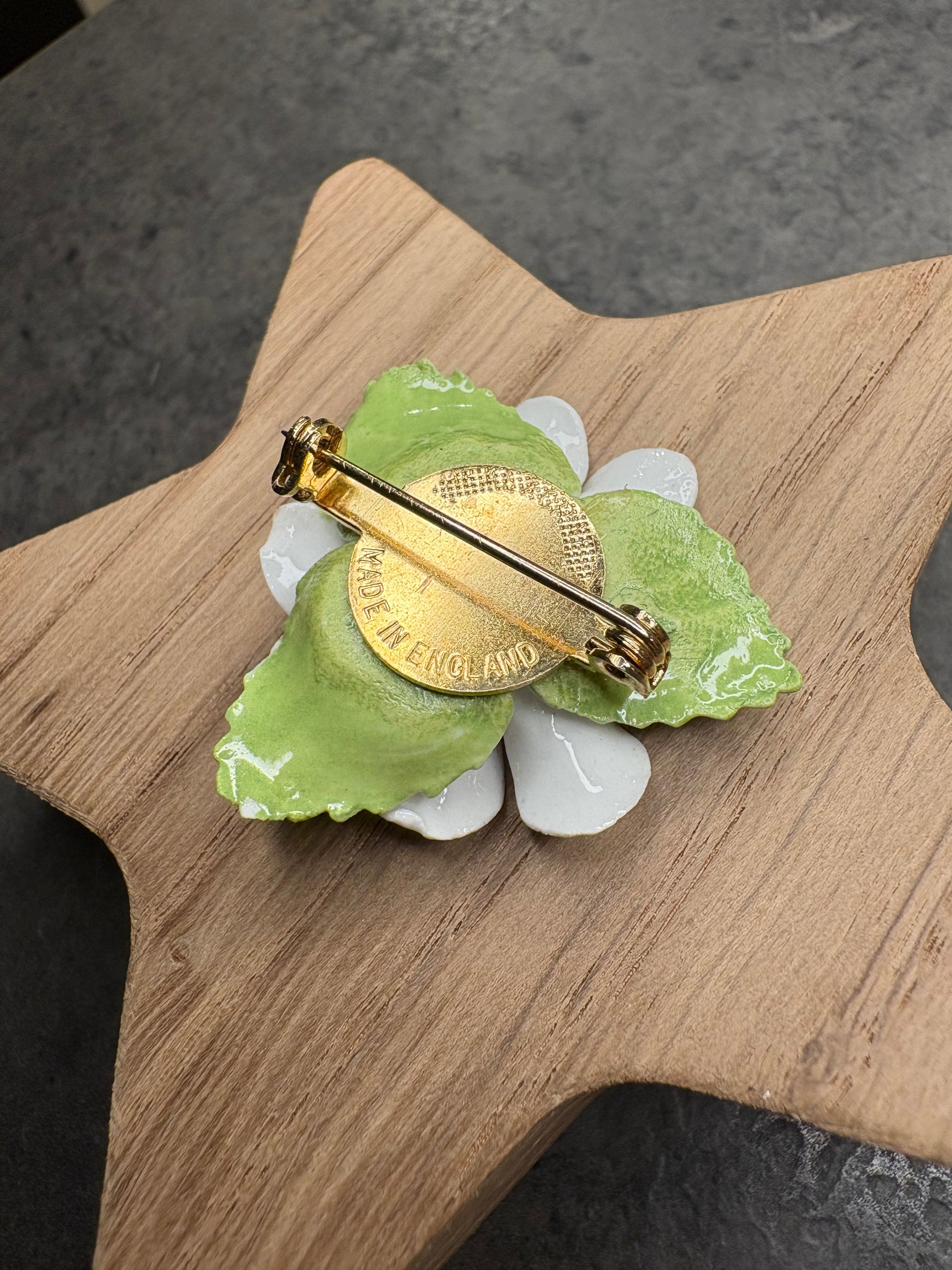 Deliziosa spilla a forma di fiore in porcellana inglese, marcata “Made in England”, finemente modellata e dipinta a mano. I petali bianchi sono leggermente mossi e luminosi, con un centro giallo in rilievo e foglie verde tenue che completano la composizione.