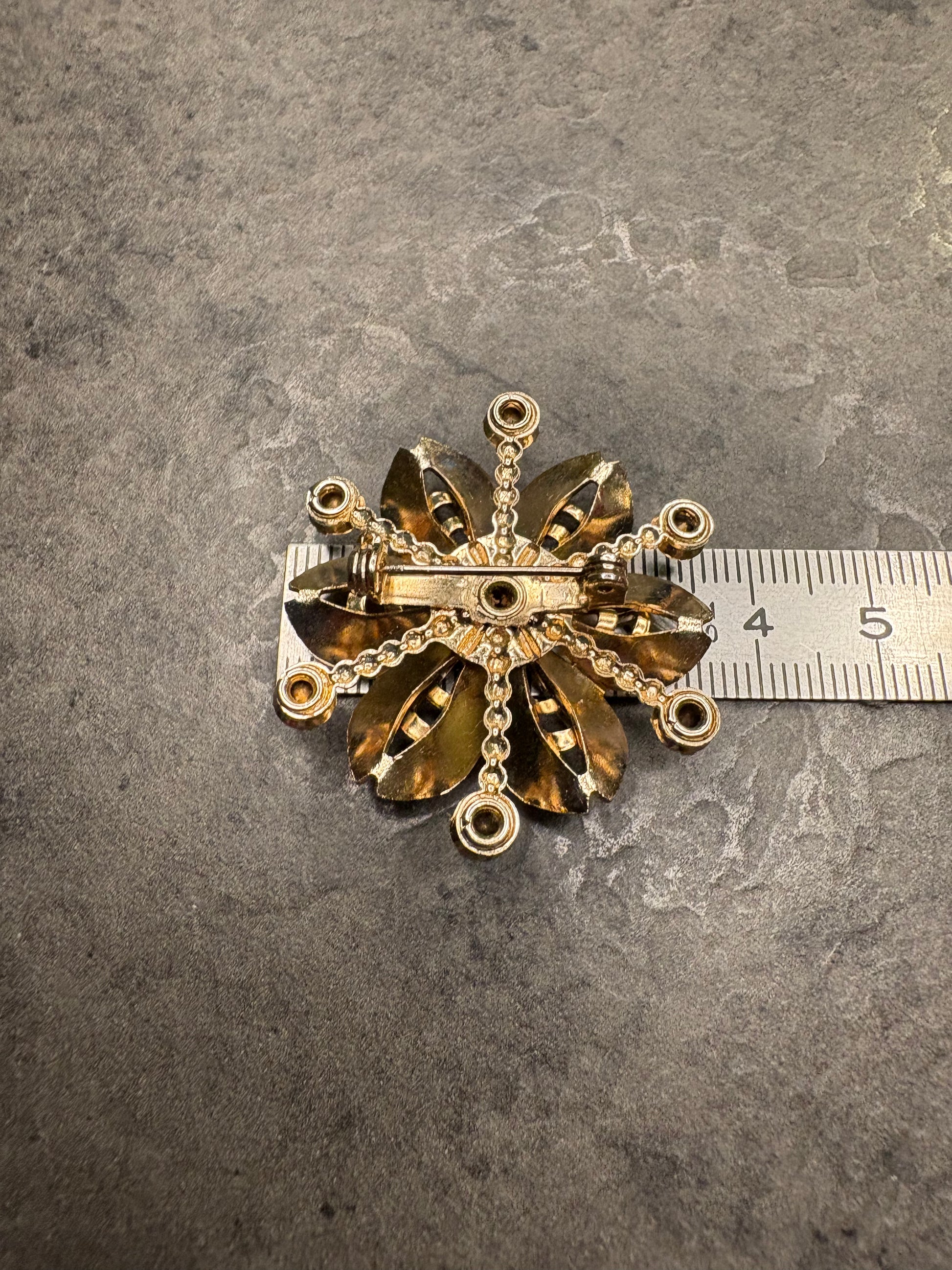 Raffinata spilla vintage realizzata in metallo color oro, dal design floreale tridimensionale. I petali, elegantemente modellati e lucenti, incorniciano un grande cristallo verde smeraldo centrale, circondato da piccoli strass verdi che donano luce e profondità alla composizione.