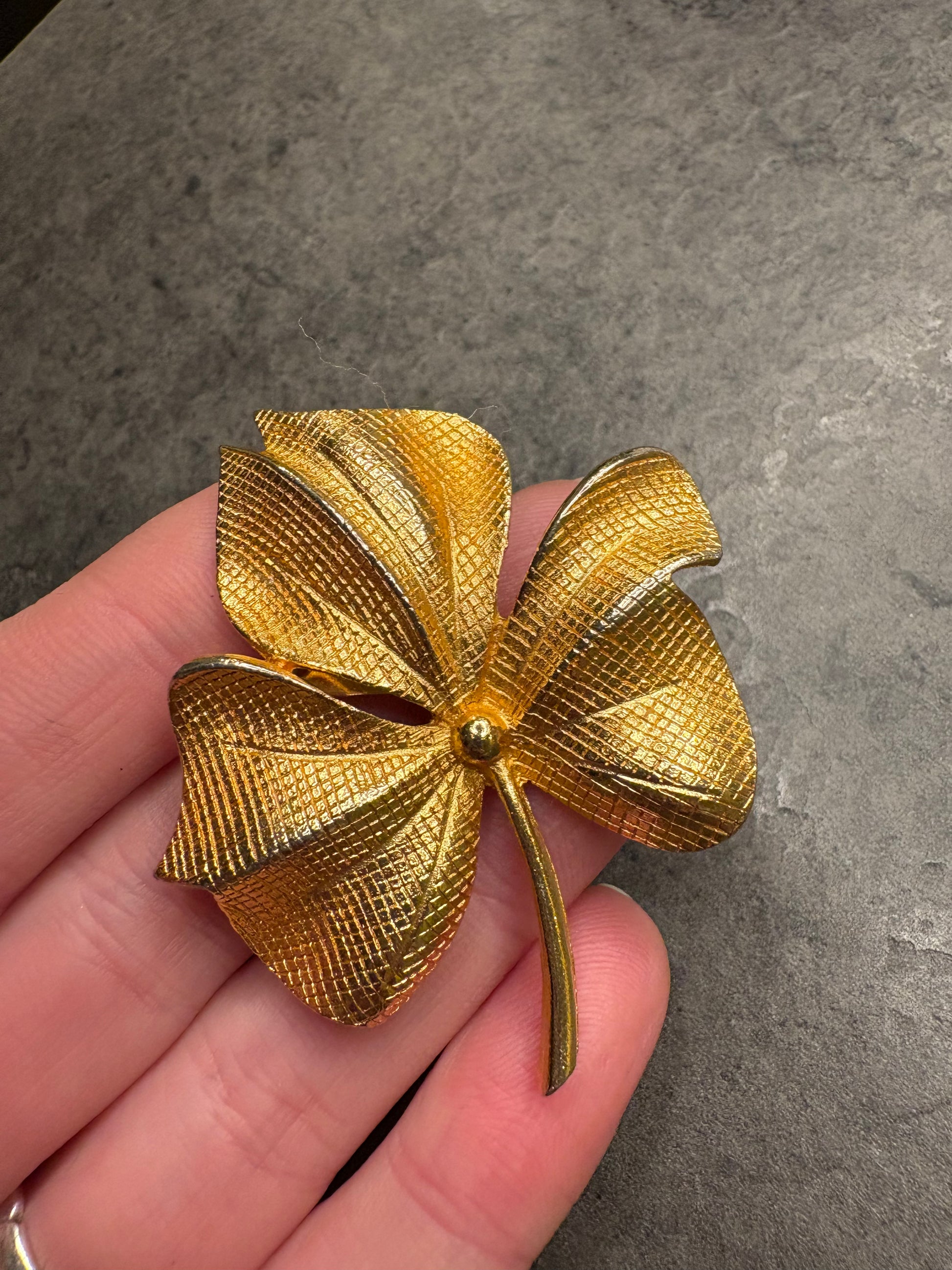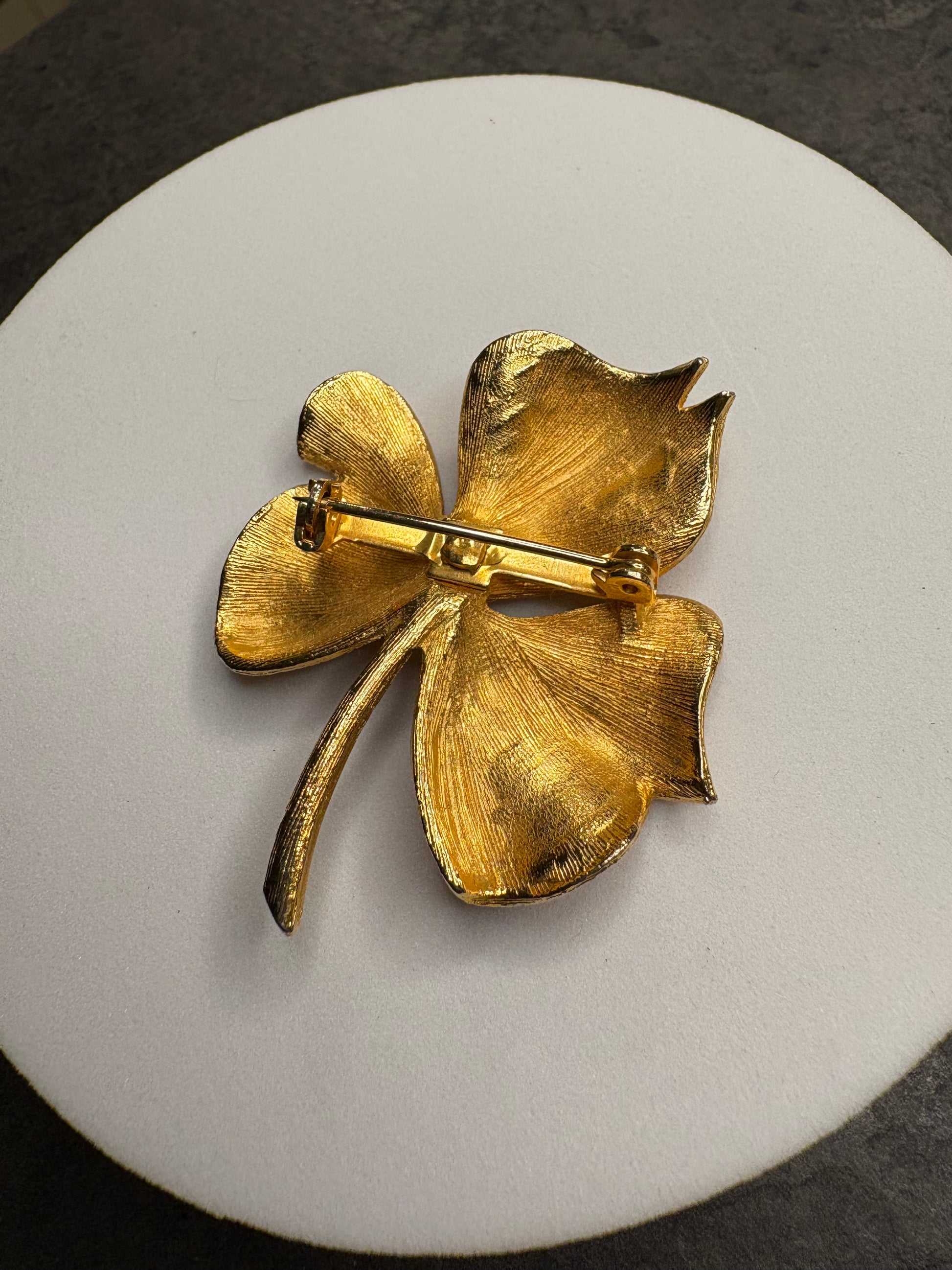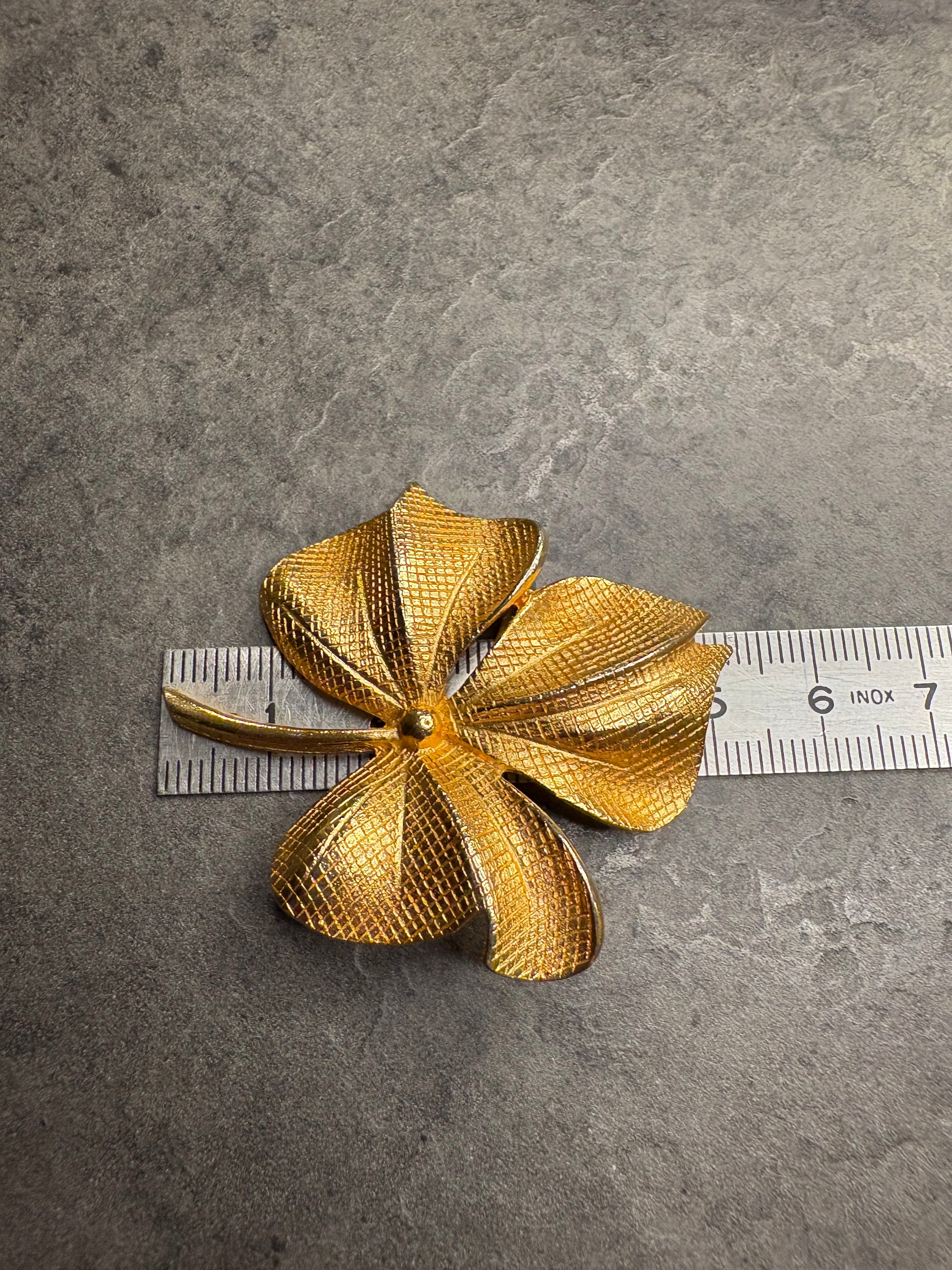 Elegante spilla a forma di foglia stilizzata in metallo dorato con una raffinata lavorazione a trama incisa che riproduce le nervature della foglia. Il design è mosso e leggermente tridimensionale, con superfici curve che riflettono splendidamente la luce.
