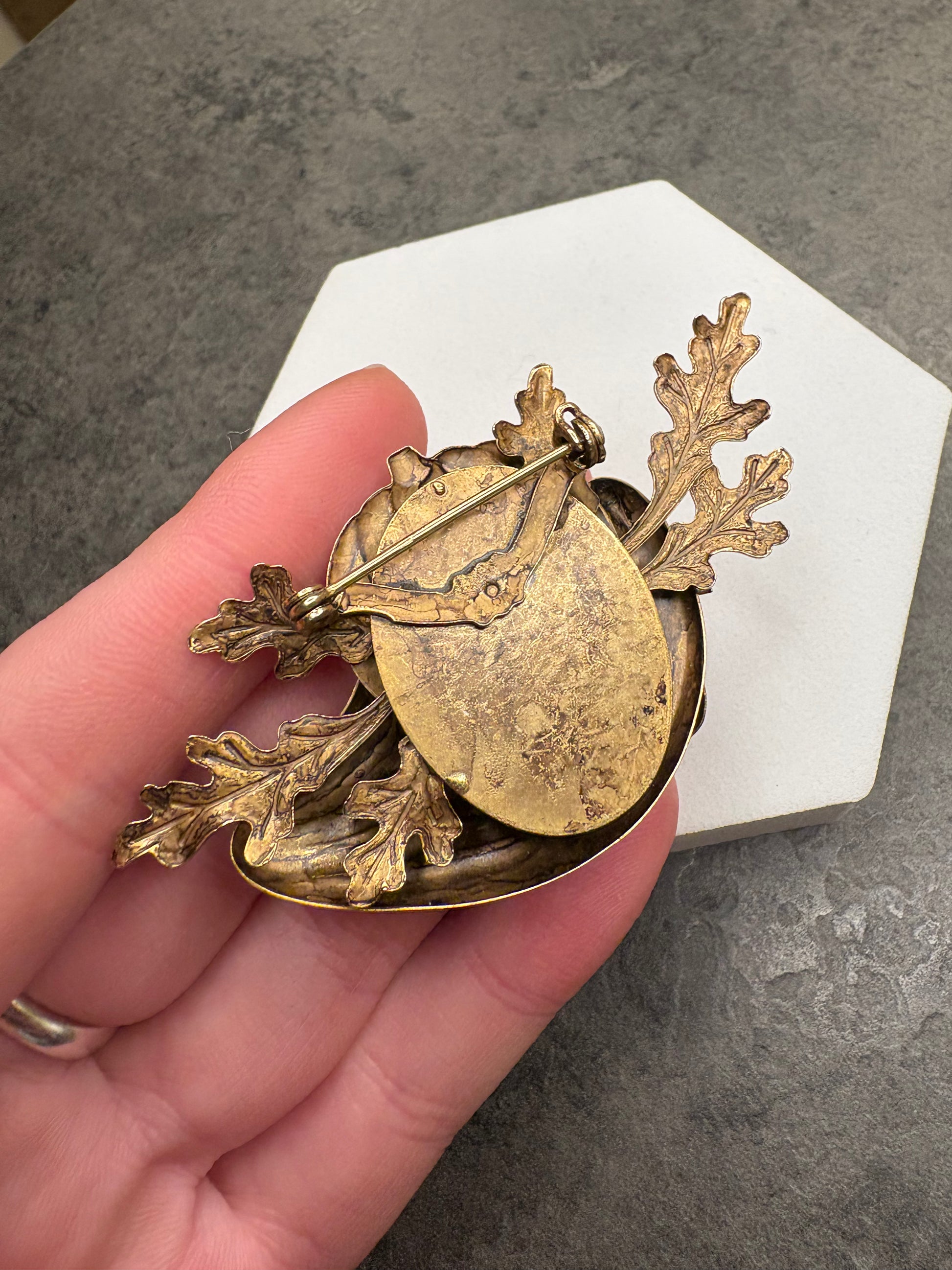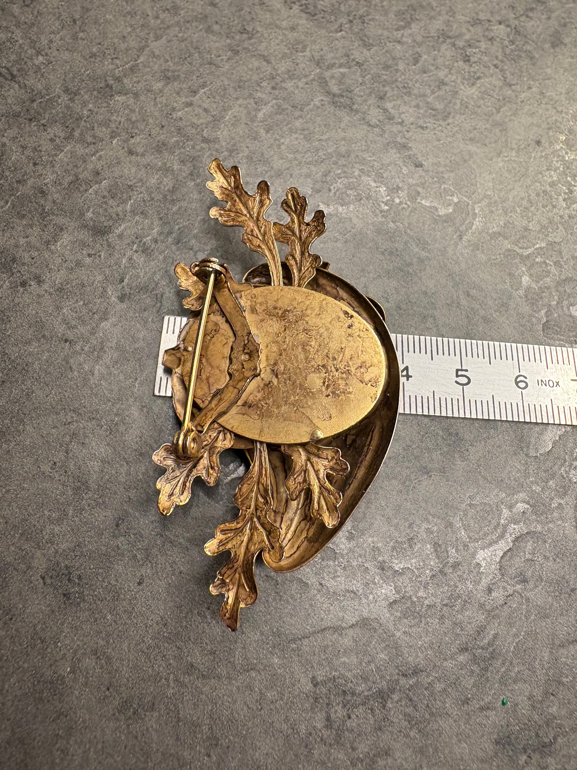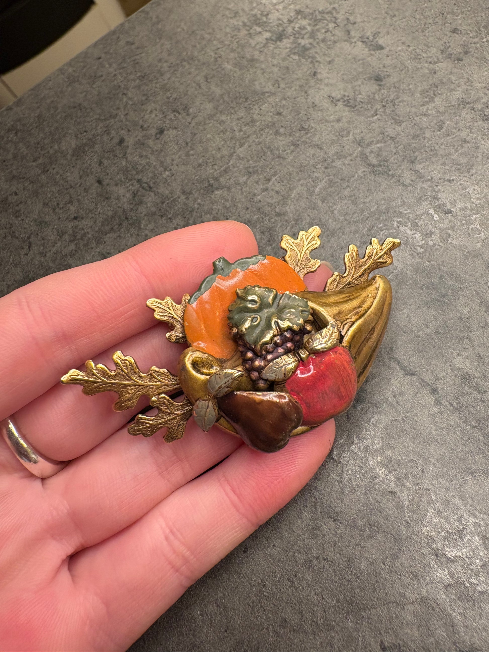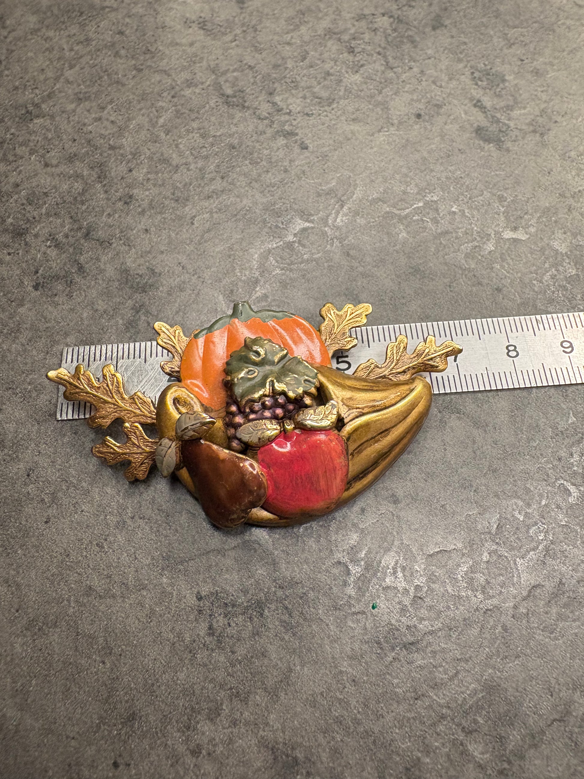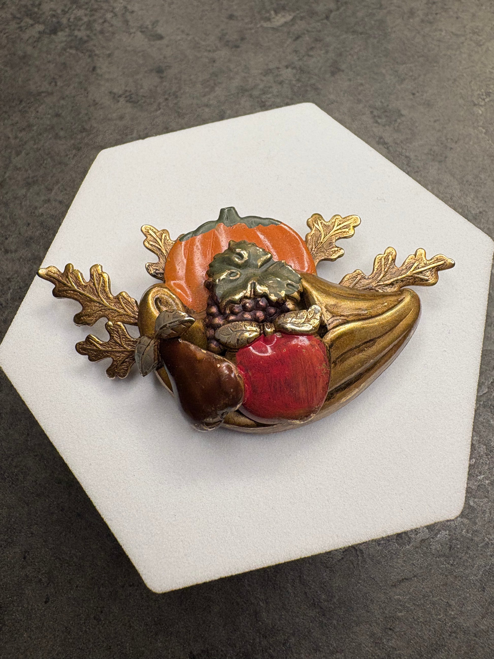 Questa spilla è una composizione ricca e decorativa ispirata ai motivi naturalistici e del raccolto, molto apprezzati nella bigiotteria vintage americana. Realizzata in metallo color oro brunito, presenta una lavorazione tridimensionale che raffigura frutta e verdura autunnali – come mela, pera, uva, zucca, foglie e bacche – arricchite da smalti policromi dai toni caldi e profondi. Le superfici leggermente patinate e la resa materica delle foglie donano al gioiello un carattere caldo e rustico, tipico delle creazioni decorative di metà Novecento. Una spilla scenografica, ideale come pezzo statement.