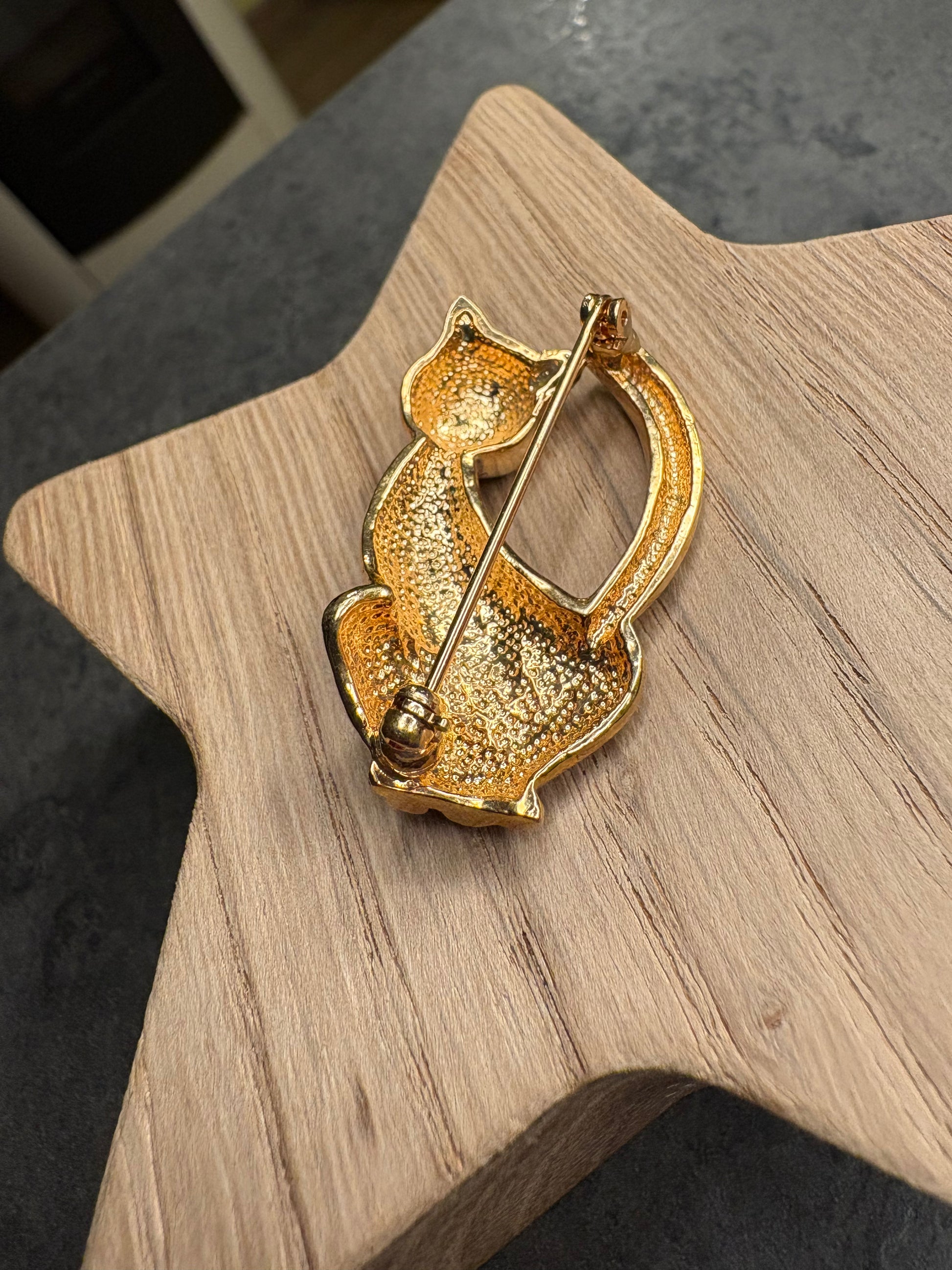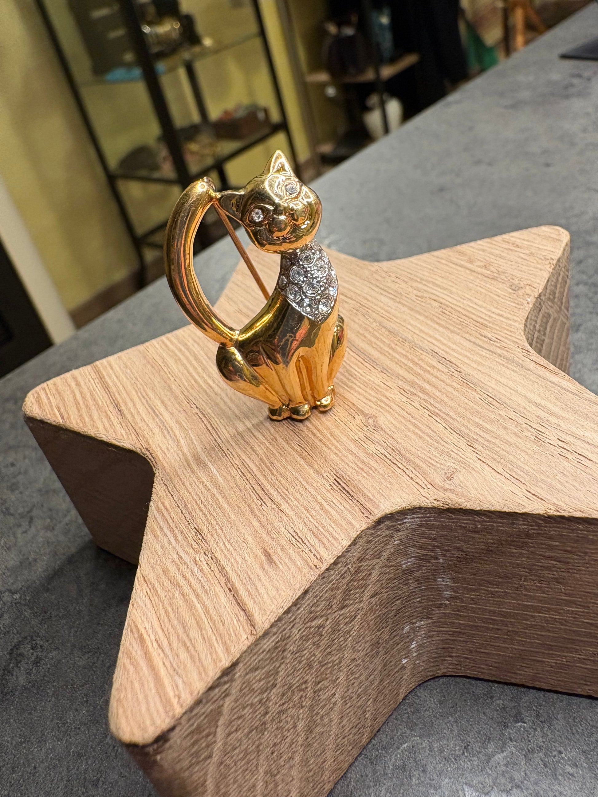 La spilla raffigura un gatto seduto, realizzato interamente in metallo dorato con una superficie liscia e lucida che riflette la luce in modo uniforme. La silhouette è snella e leggermente allungata, con linee morbide che conferiscono al soggetto un’aria elegante e un po’ aristocratica. La testa è piccola rispetto al corpo, con orecchie appuntite e ben sagomate, mentre il muso è stilizzato: non ci sono tratti incisi nel dettaglio, ma la forma essenziale suggerisce un’espressione calma e vigile.