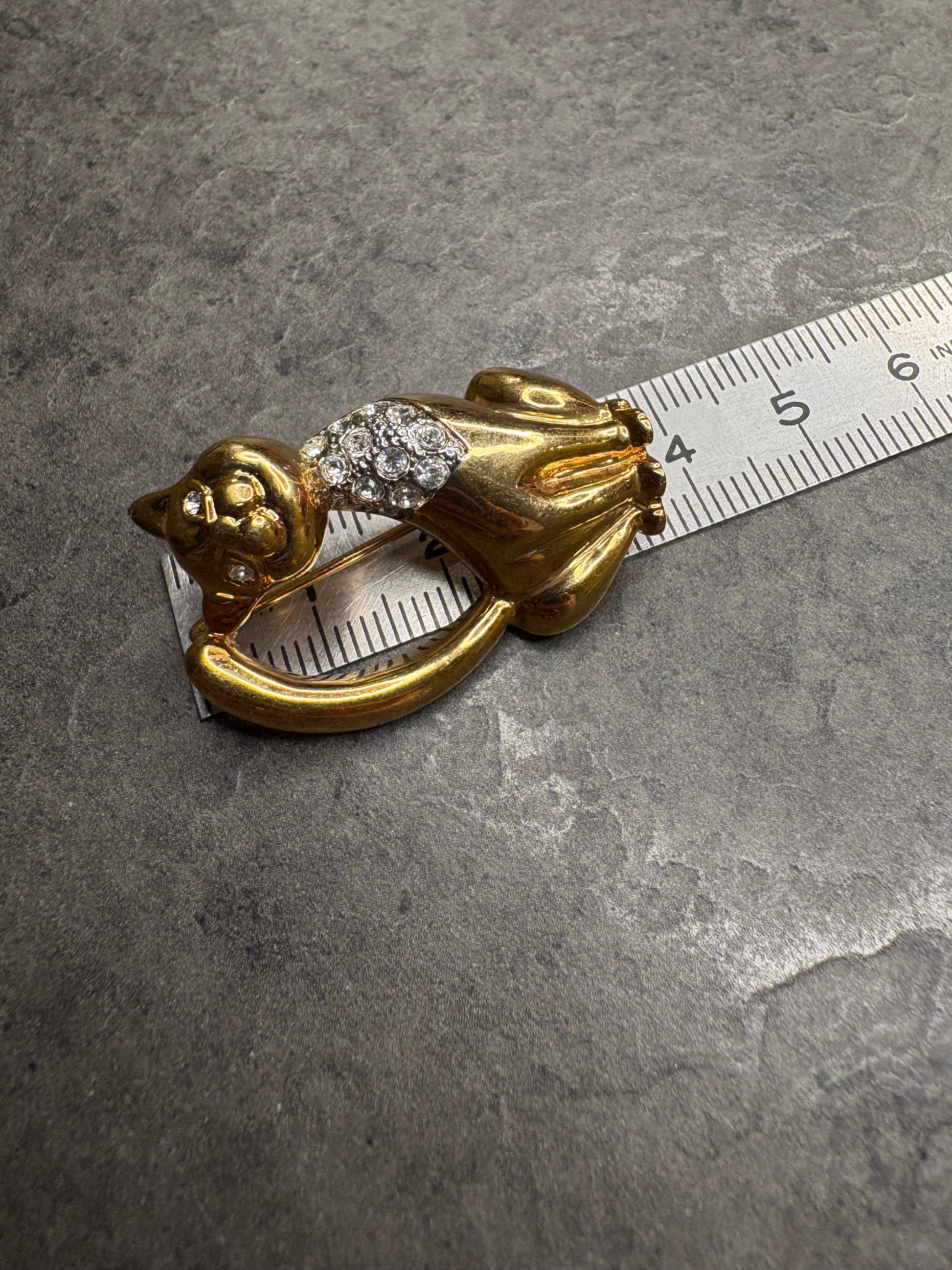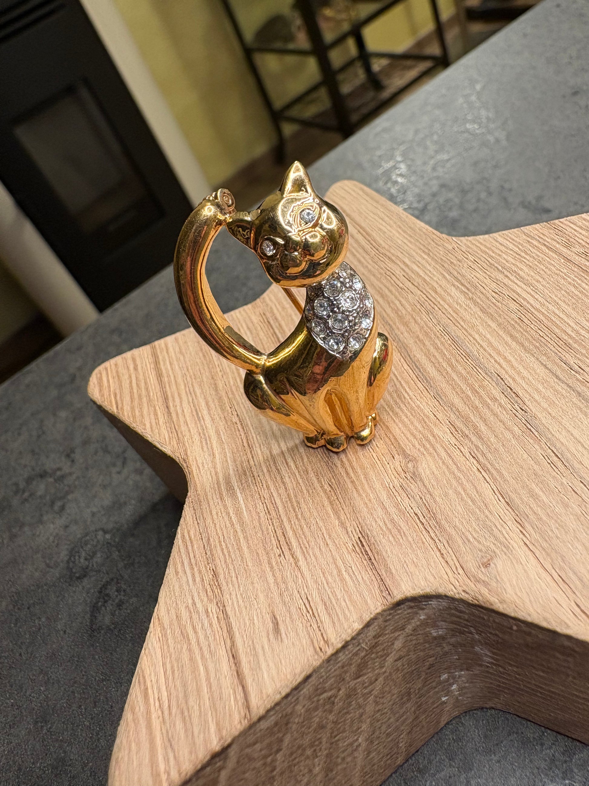 L’elemento che più caratterizza la spilla è il petto del gatto, impreziosito da una fascia scintillante di piccoli strass trasparenti. Le pietre sono incastonate una accanto all’altra, creando un effetto di collare gioiello o di pettorina decorata. Il contrasto tra la lucentezza fredda degli strass e la calda tonalità dorata del metallo rende il dettaglio particolarmente luminoso e raffinato.