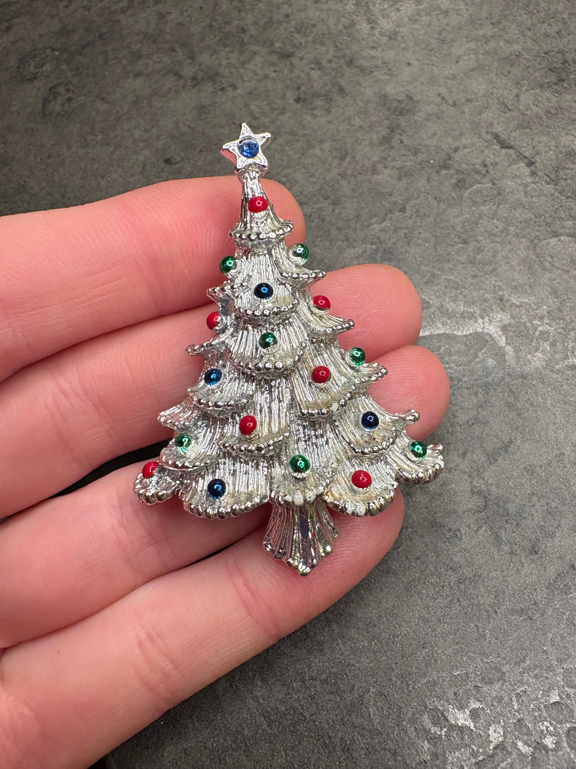 Deliziosa spilla natalizia firmata Gerry’s, realizzata in metallo argentato lucido e modellata a forma di albero di Natale.