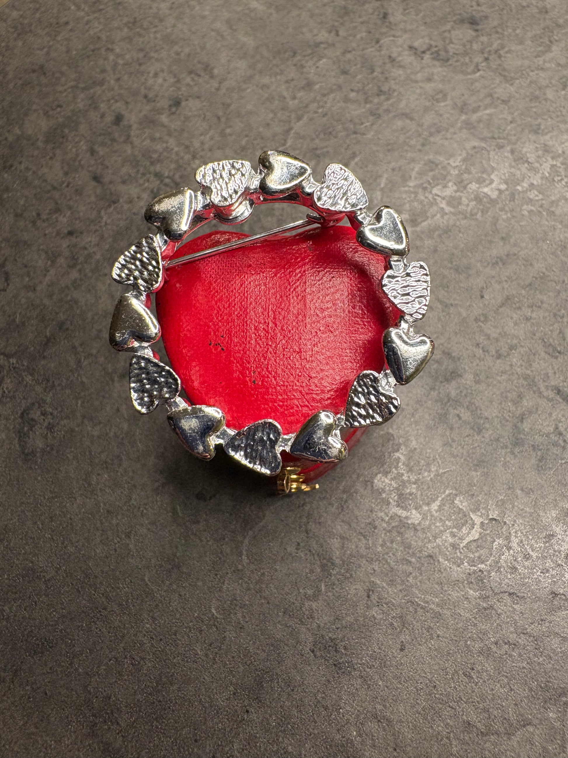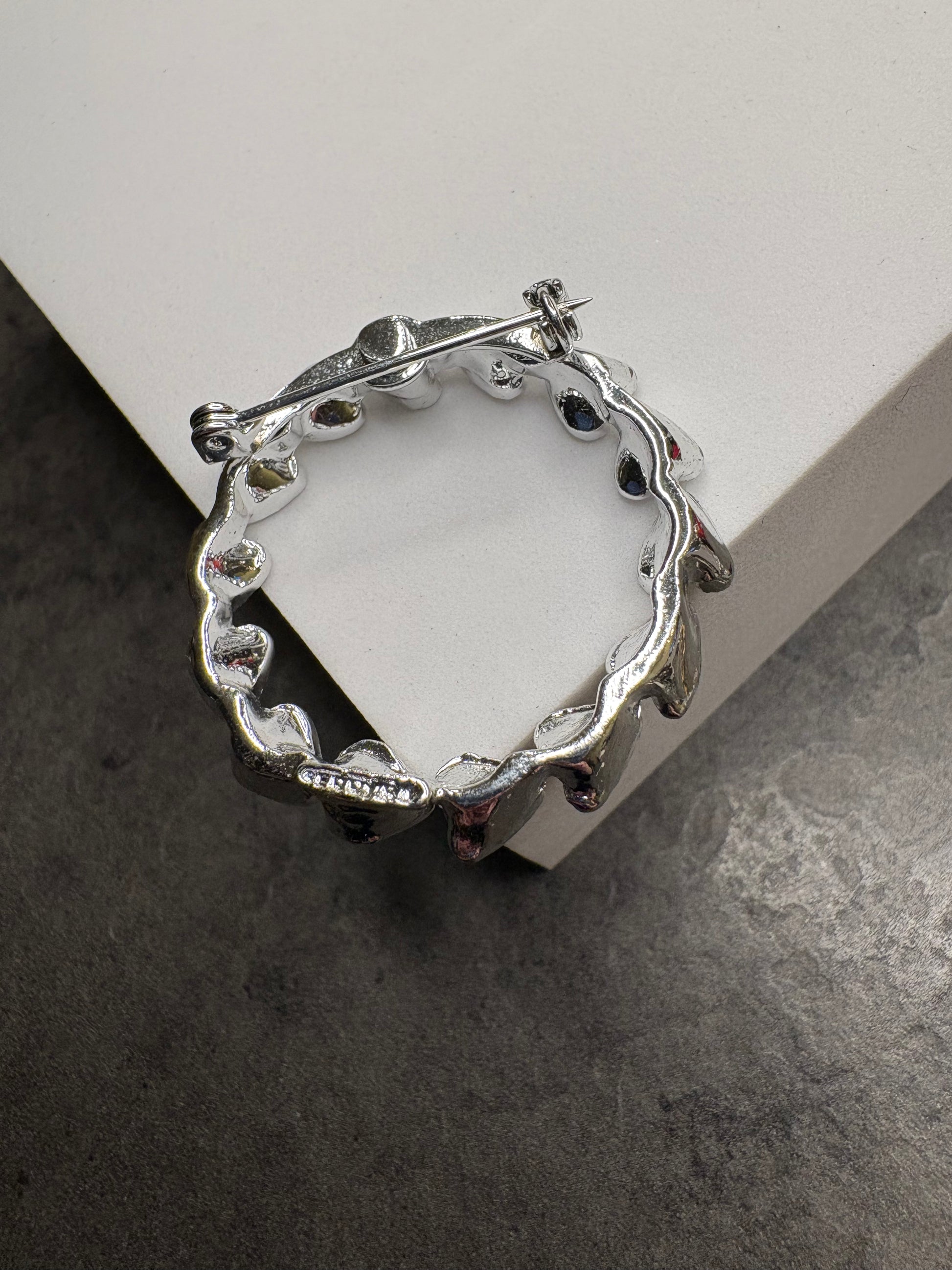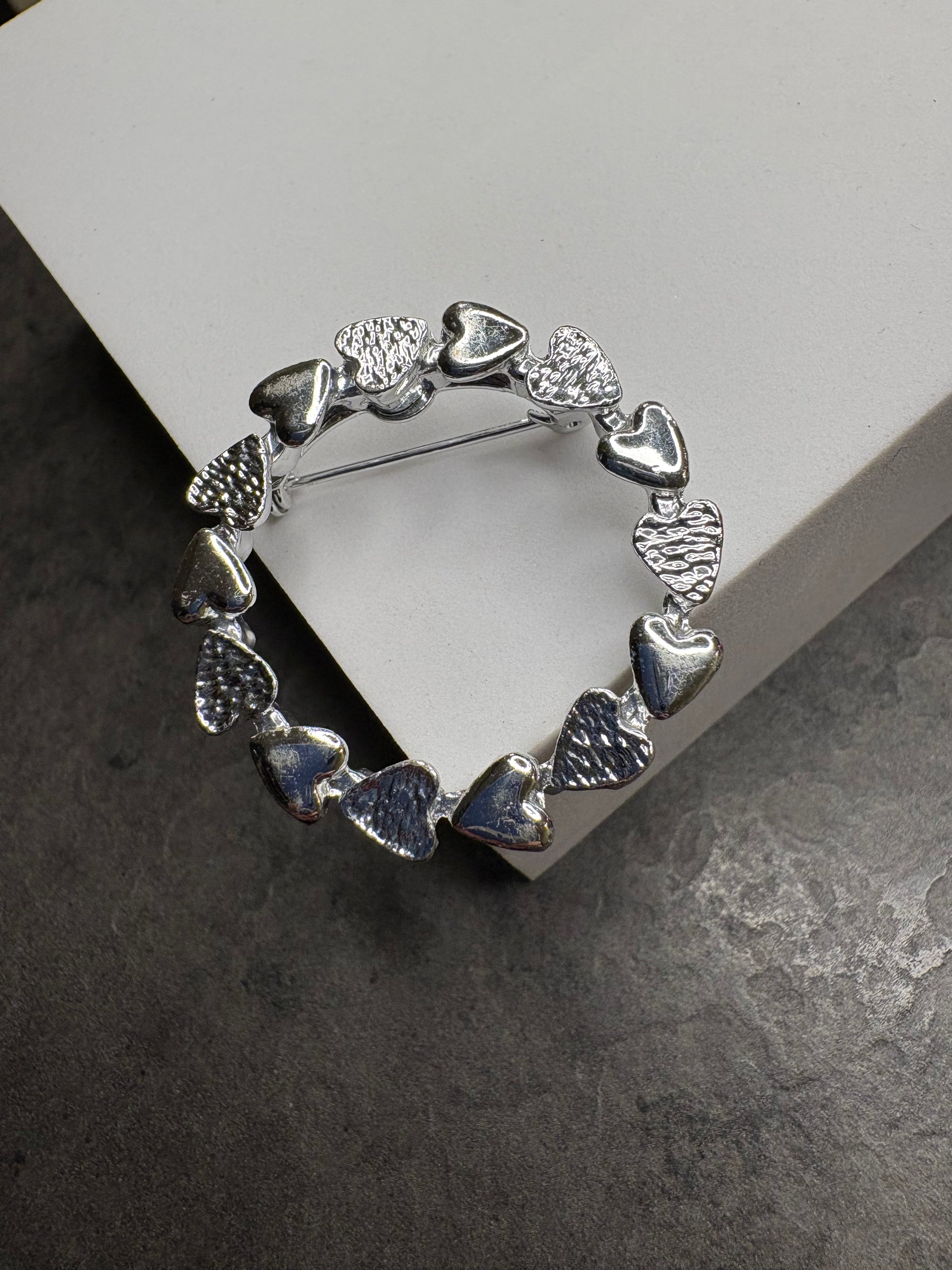 Delicata spilla in metallo color argento dalla forma circolare, composta da una corona di piccoli cuori stilizzati collegati tra loro. I cuori presentano una superficie leggermente martellata o texturizzata che alterna zone lucide e opache, creando profondità e riflessi morbidi. Il disegno è armonioso, leggero e molto femminile, ideale sia per un uso quotidiano che per occasioni speciali. La struttura è ben rifinita e la chiusura posteriore è stabile.