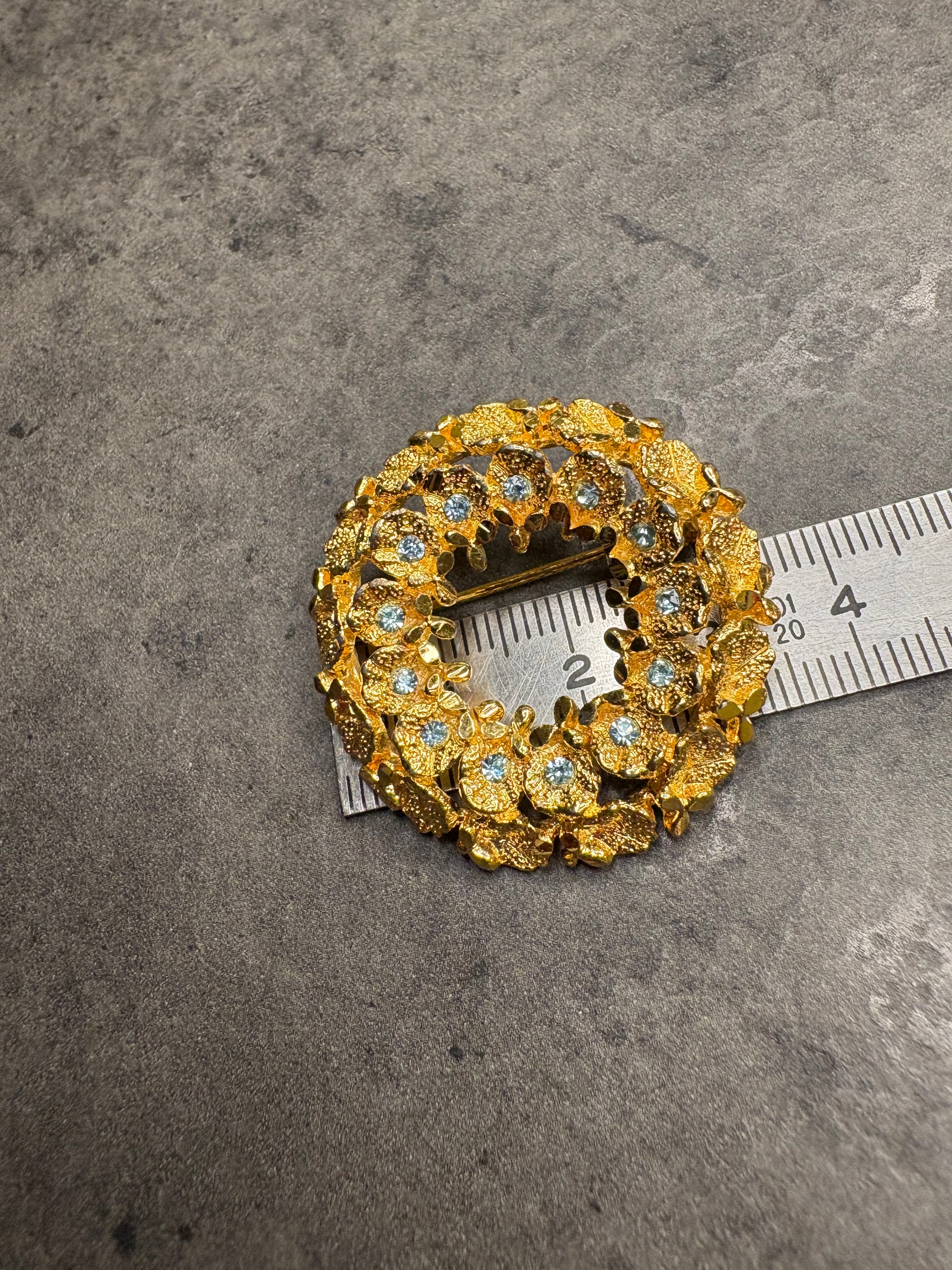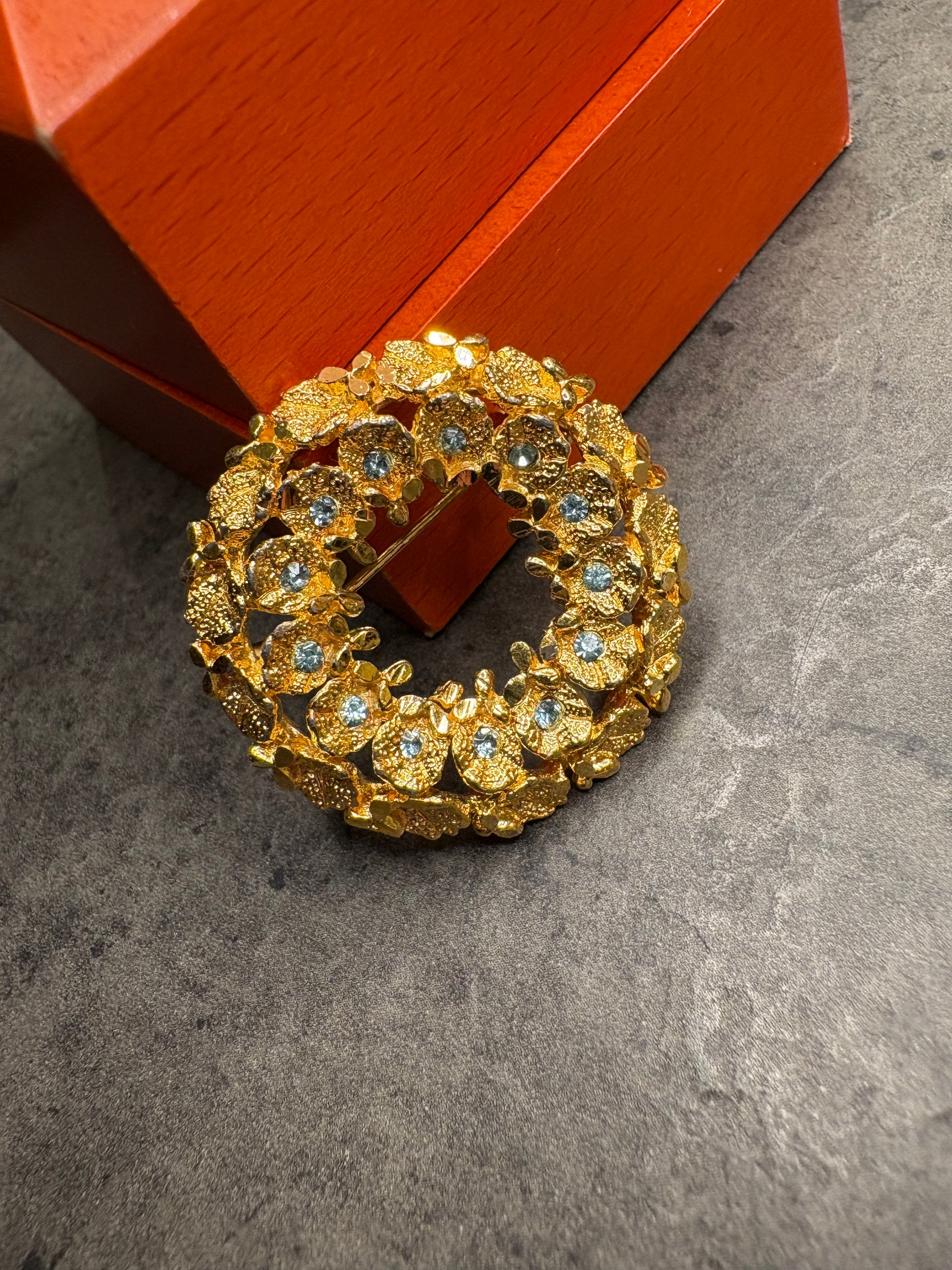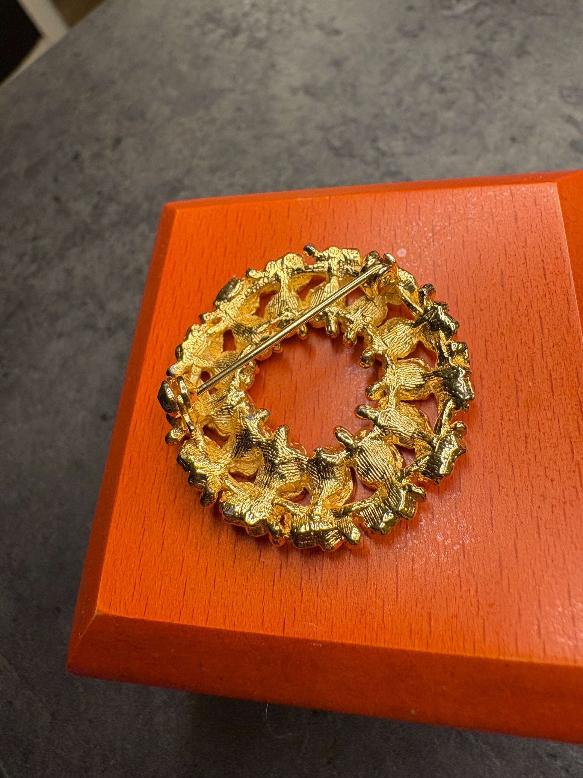 Splendida spilla vintage a ghirlanda floreale, realizzata in metallo dorato con una raffinata lavorazione a rilievo che alterna petali satinati e dettagli lucidi.