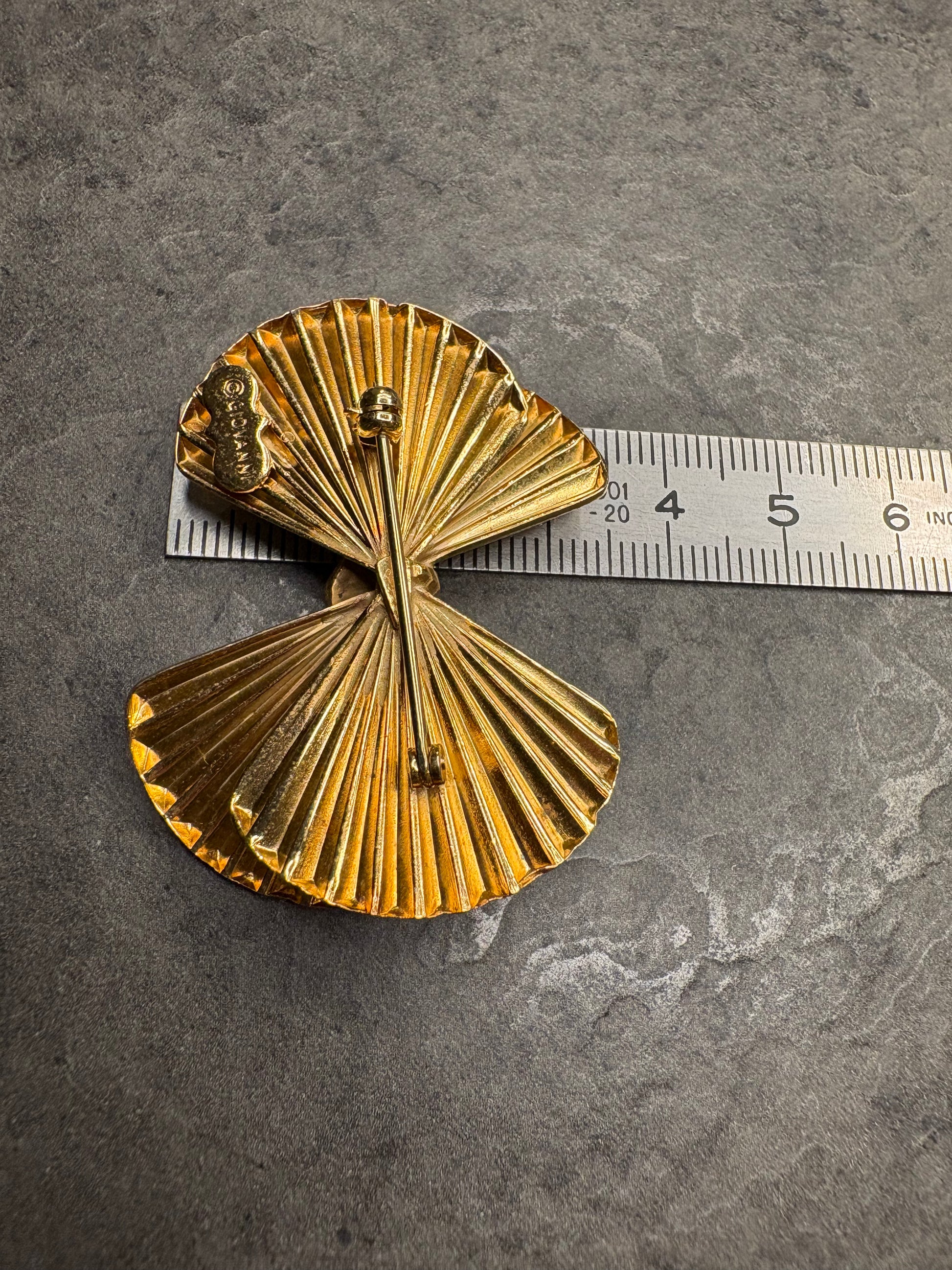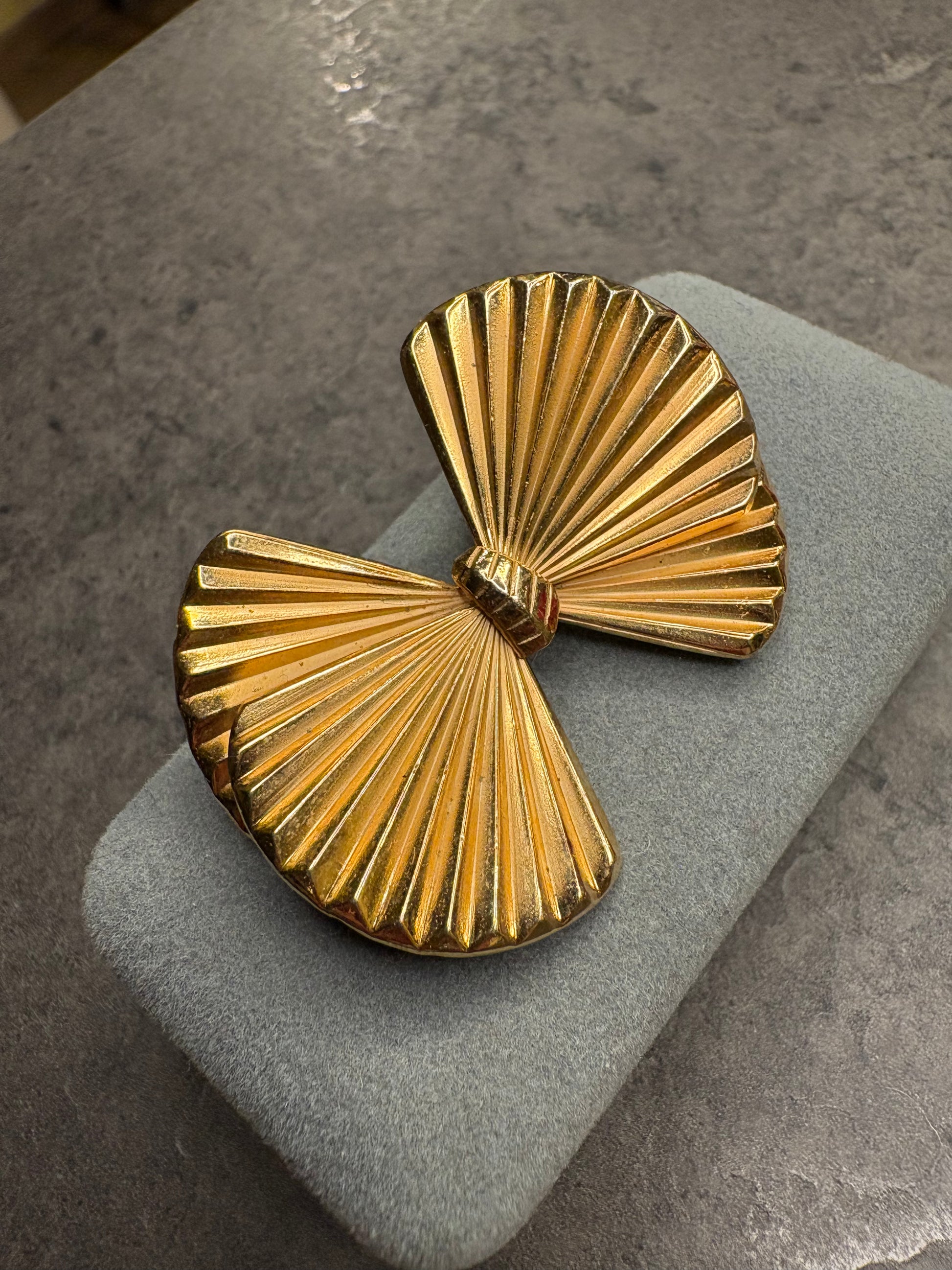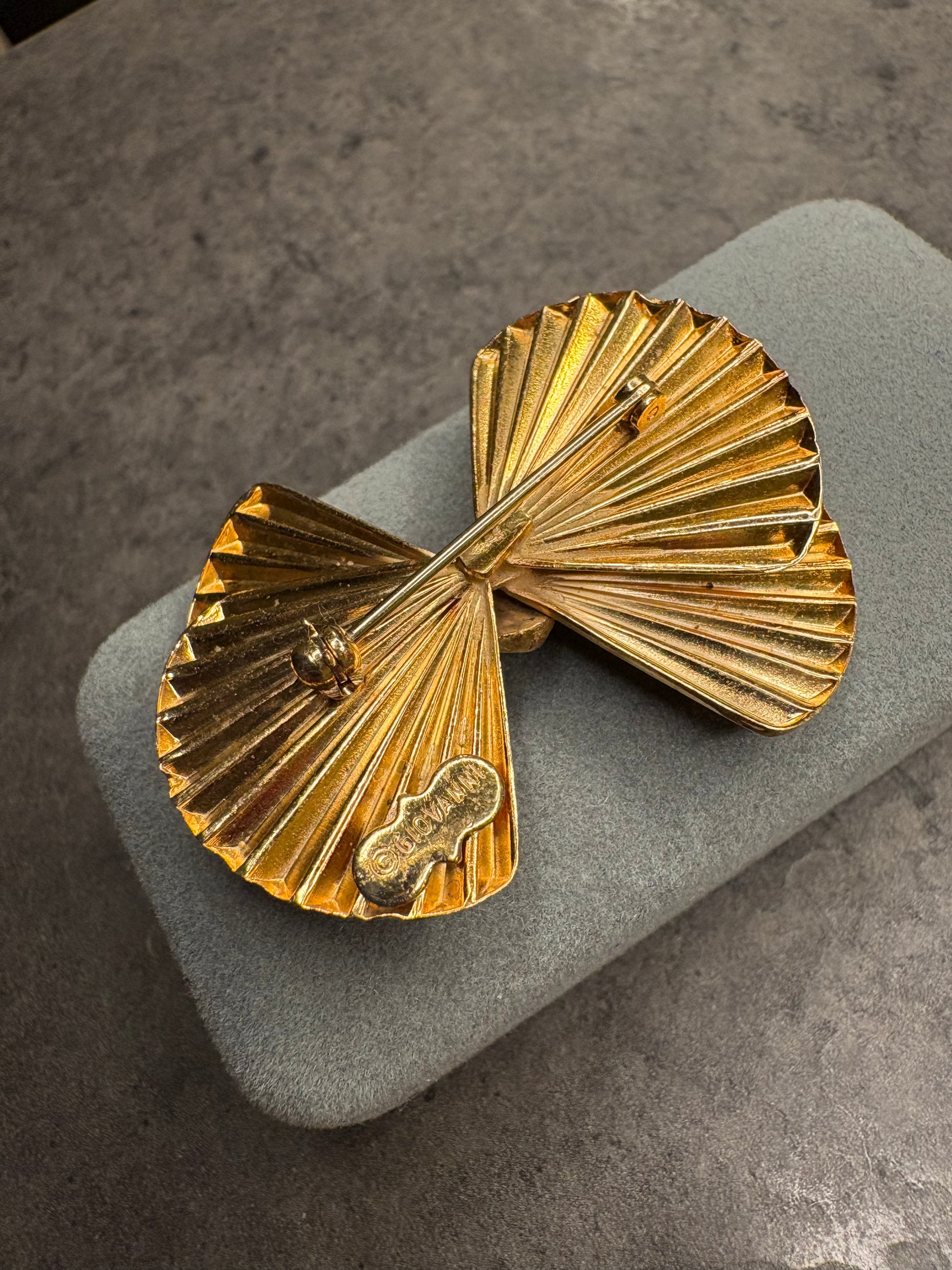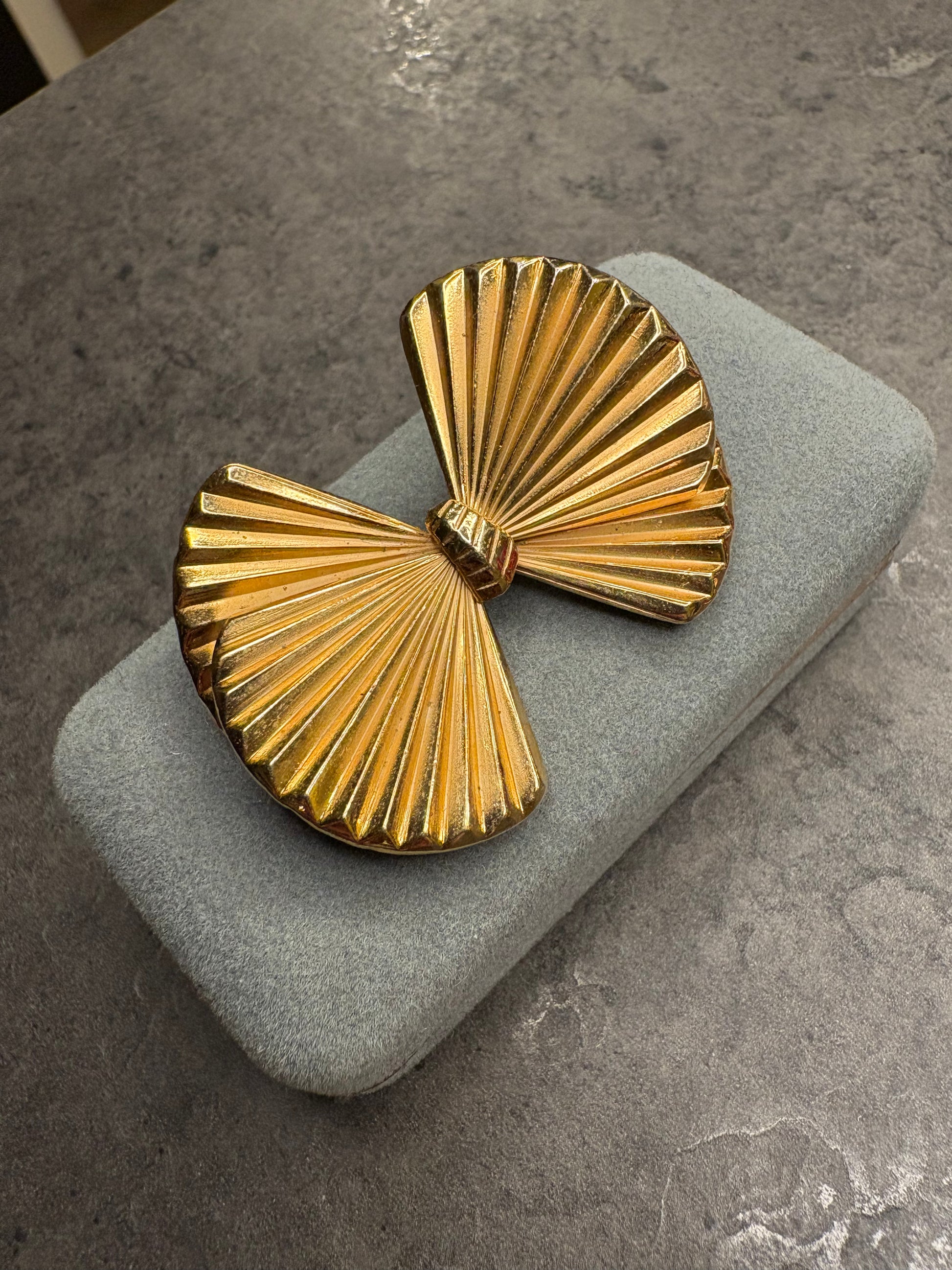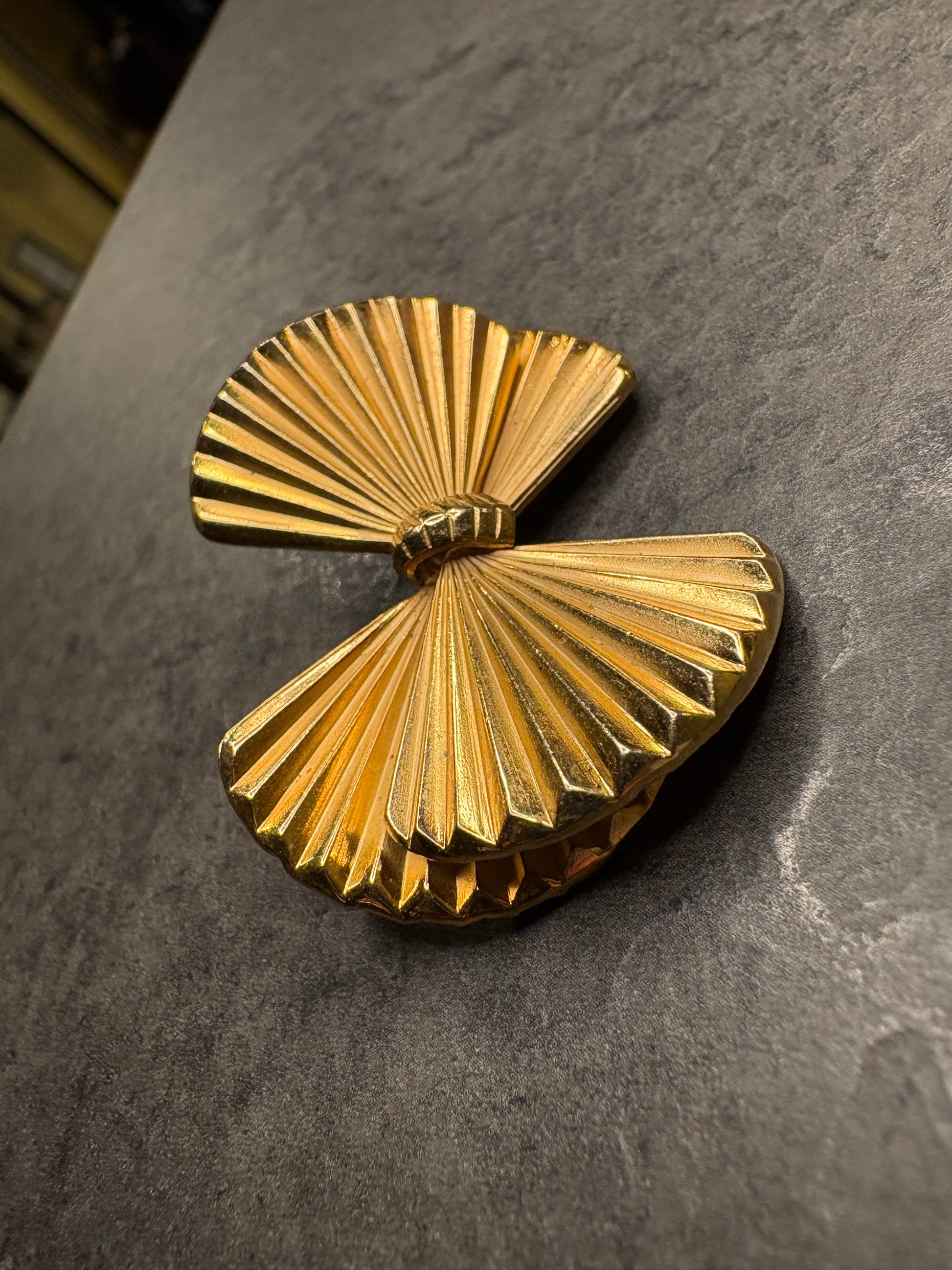 Elegante spilla vintage firmata Giovanni Cerrito, realizzata tra gli anni ’60 e ’70 e caratterizzata da un raffinato fiocco doppio dorato. Il design plissettato, dalle pieghe profonde e simmetriche, cattura la luce con un effetto scultoreo e dinamico che dona movimento e preziosità.