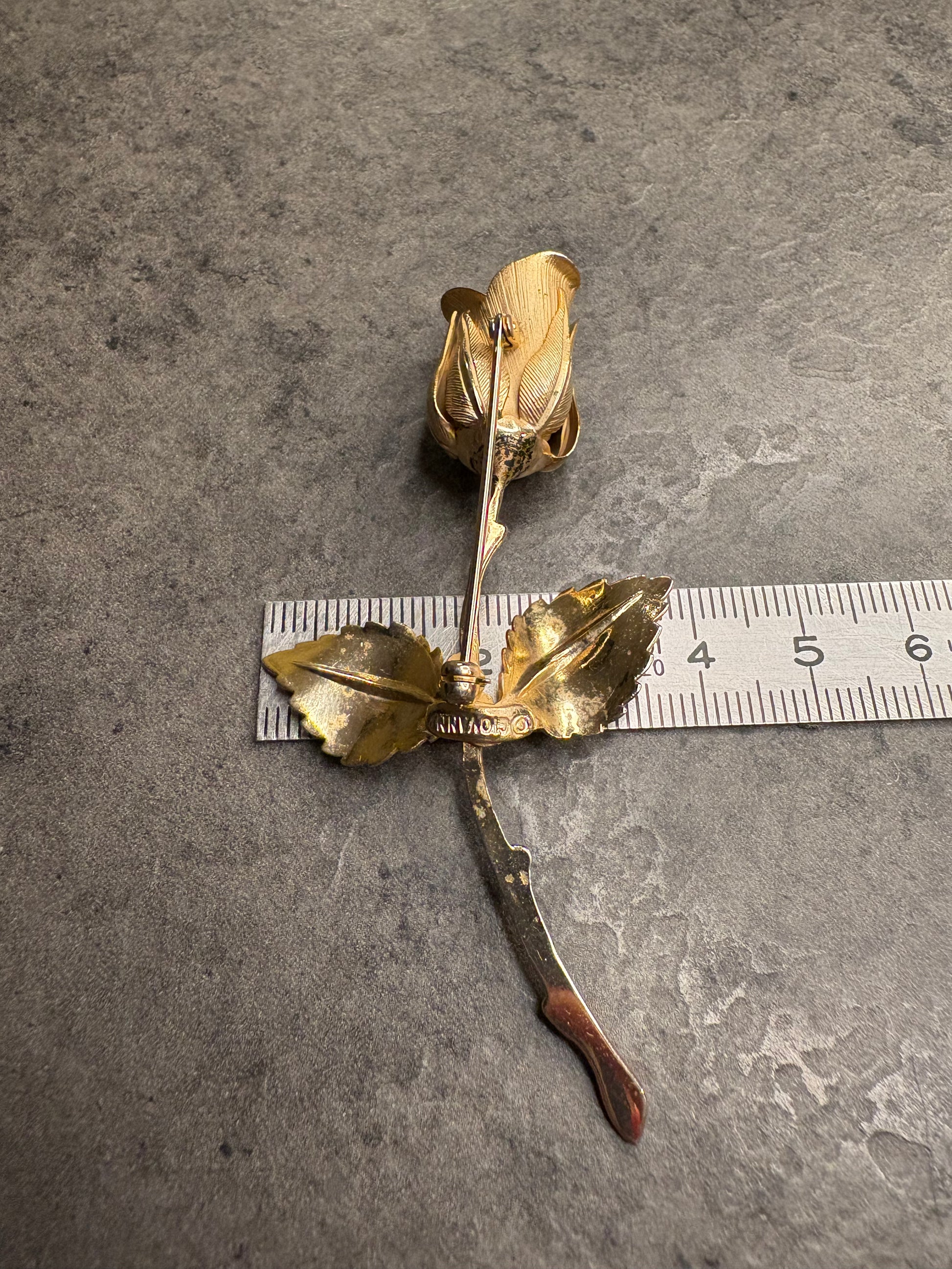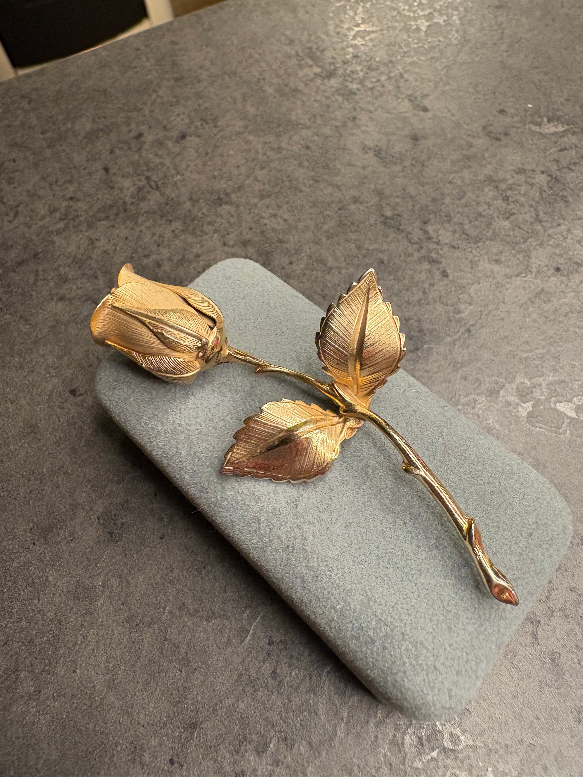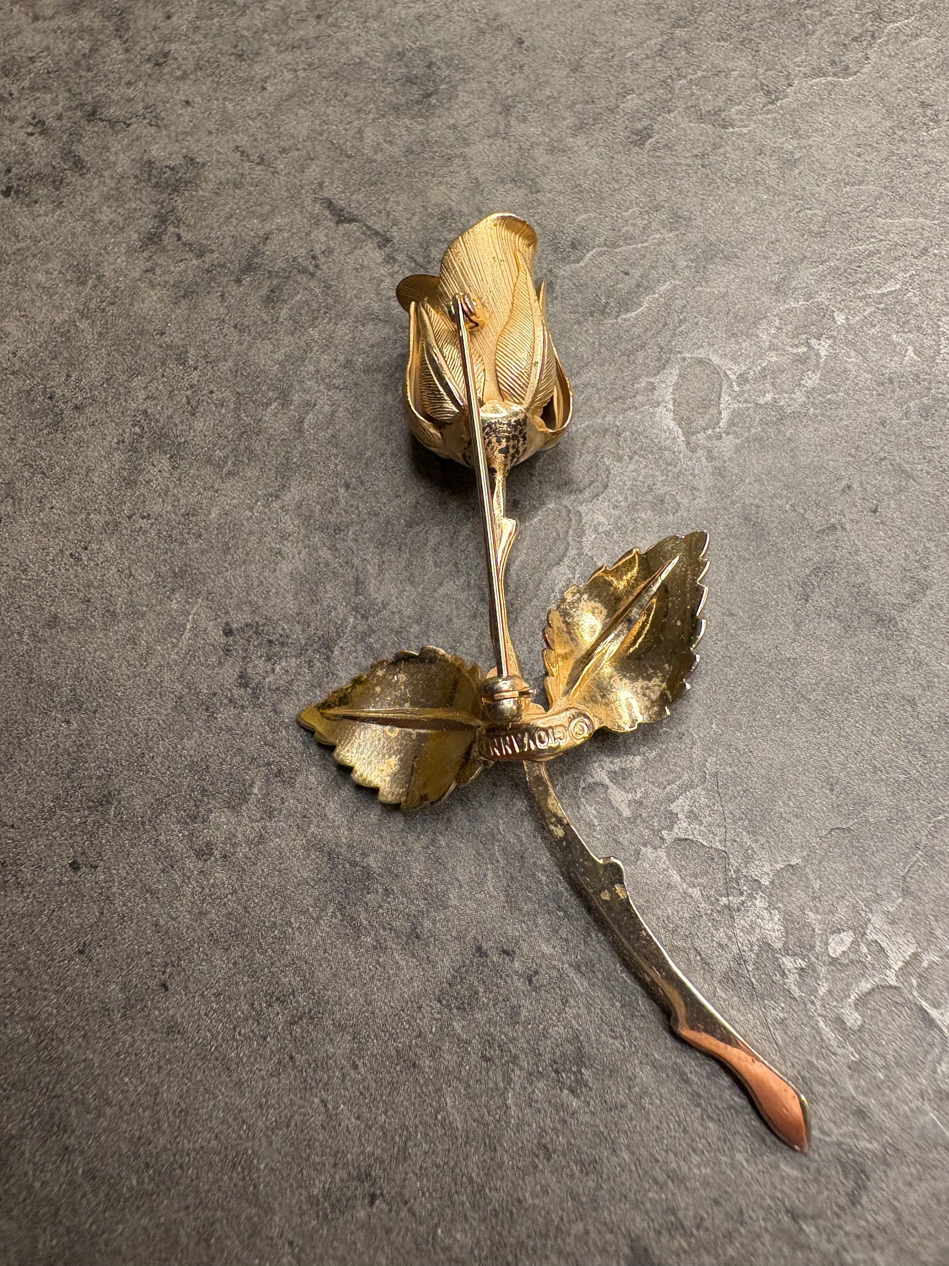 Raffinata spilla vintage “Rosa di Natale” firmata Giovanni, risalente agli anni ’60, realizzata in metallo dorato finemente cesellato.