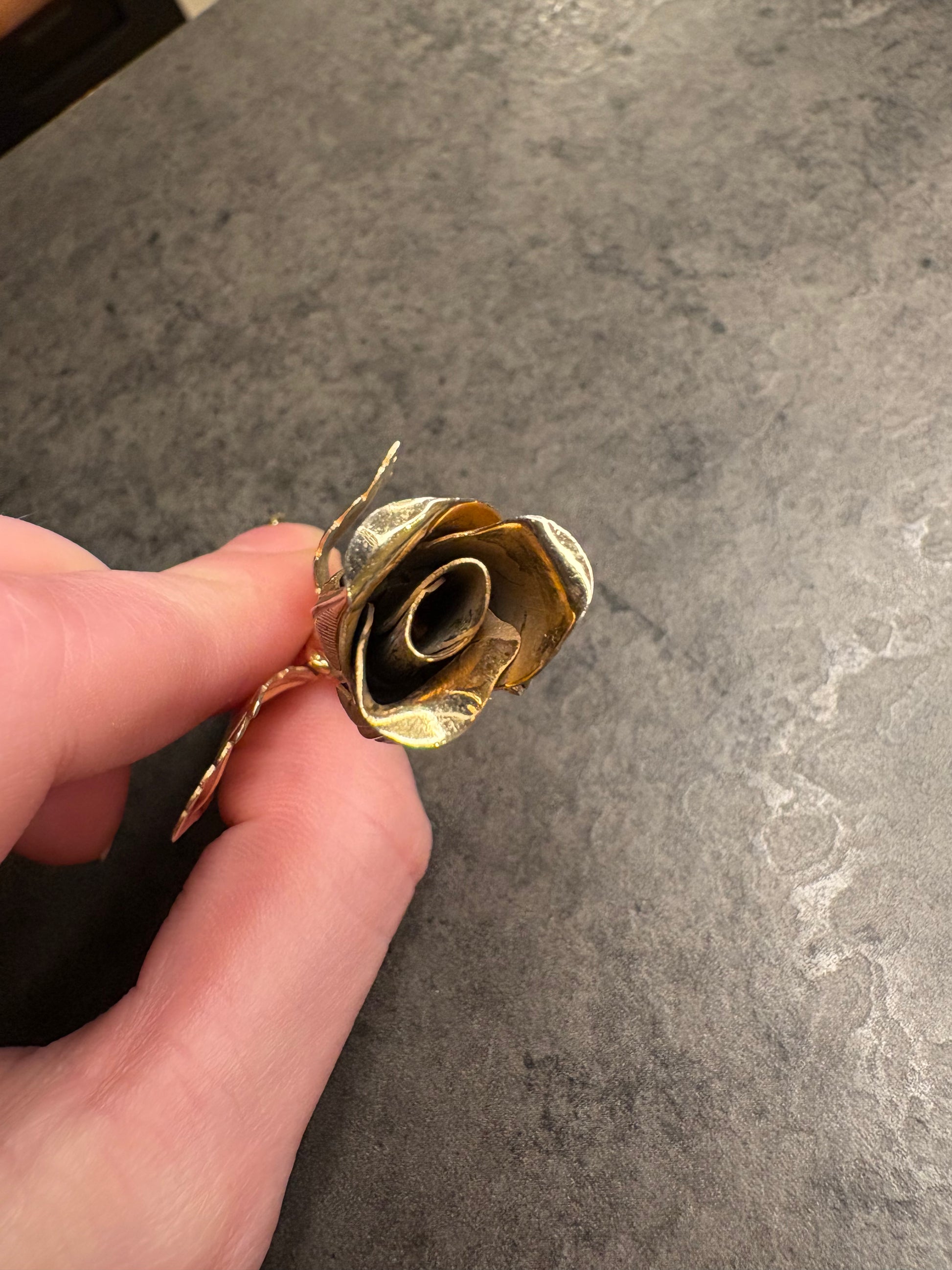 La composizione raffigura una rosa in pieno bocciolo, con gambo allungato e due foglie realistiche dalle venature perfettamente incise. Il metallo, lavorato con tecnica satinata e lucida alternata, crea un suggestivo gioco di luce che mette in risalto ogni dettaglio del fiore.