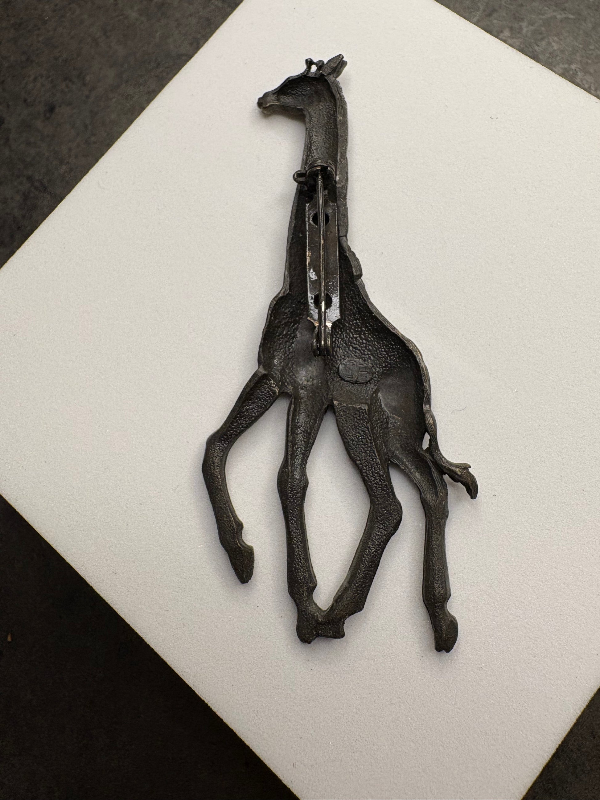 Elegante e slanciata spilla a forma di giraffa firmata SF, realizzata in metallo dorato brunito con lavorazione a rilievo. Il corpo è decorato da una texture punzonata che richiama il tipico manto maculato dell’animale, creando un raffinato gioco di luci e ombre. Le lunghe zampe sottili e il collo affusolato conferiscono alla spilla un aspetto armonioso e scultoreo. Un pezzo animalier sofisticato e originale, molto apprezzato nel collezionismo vintage.