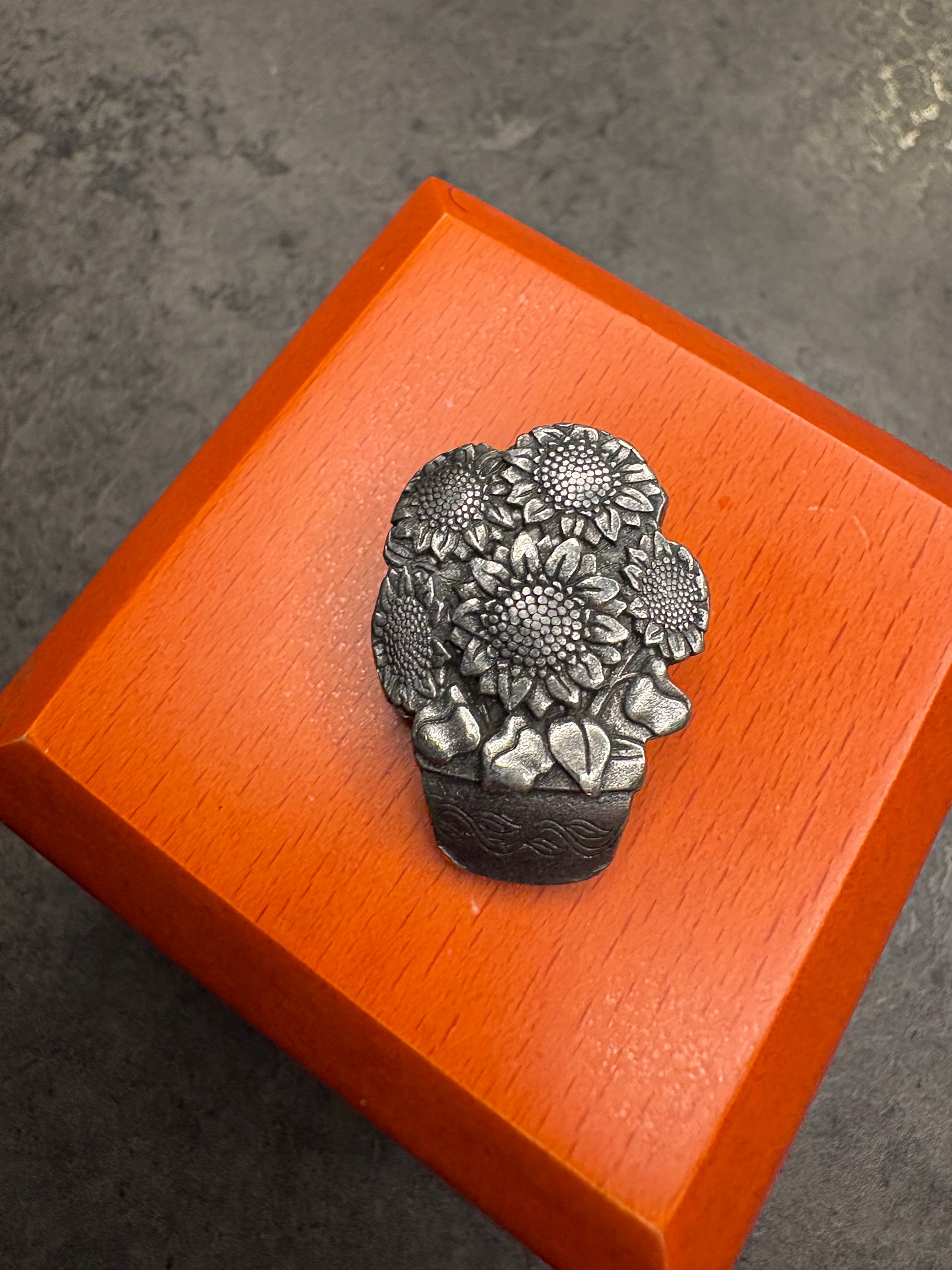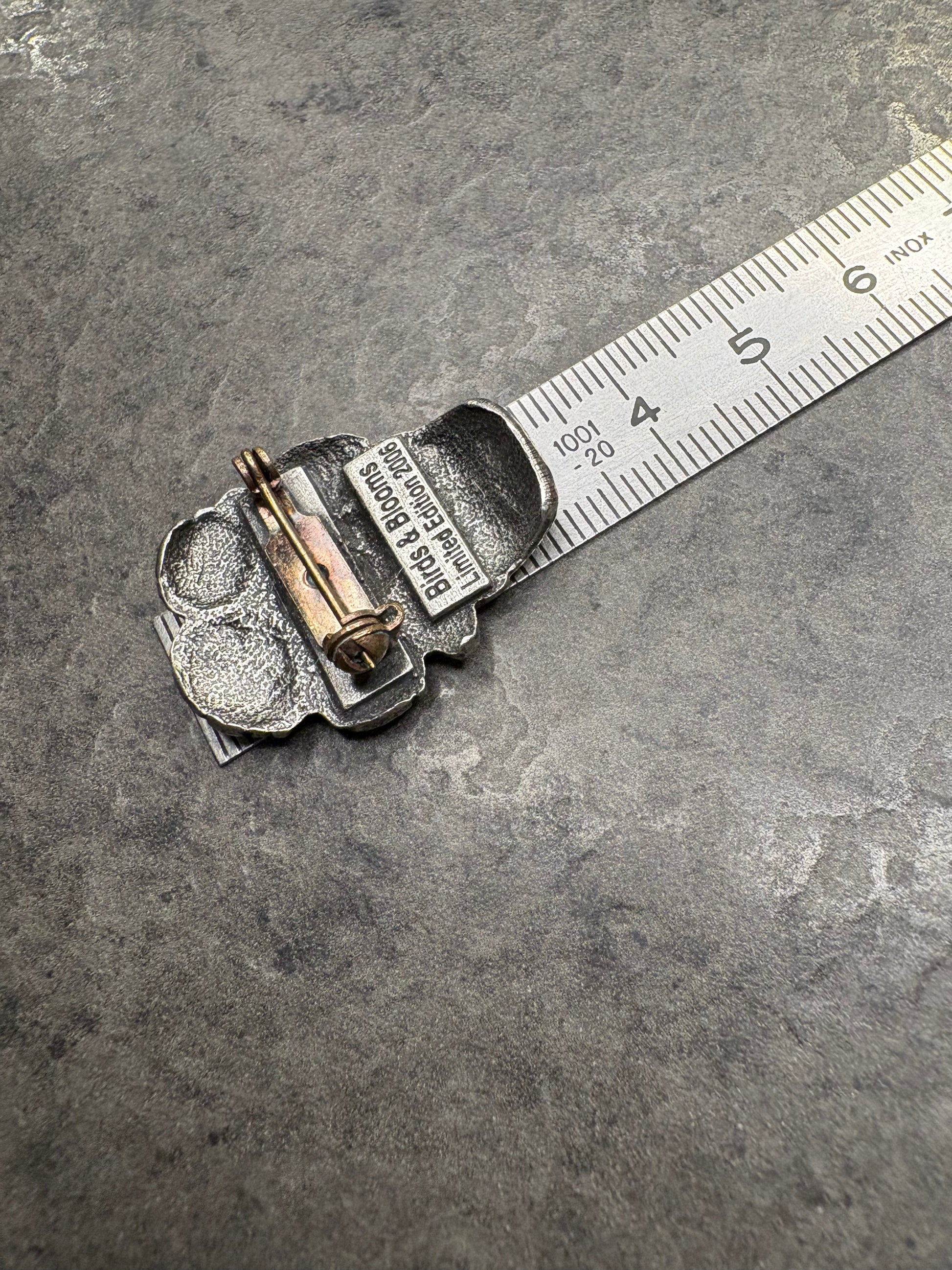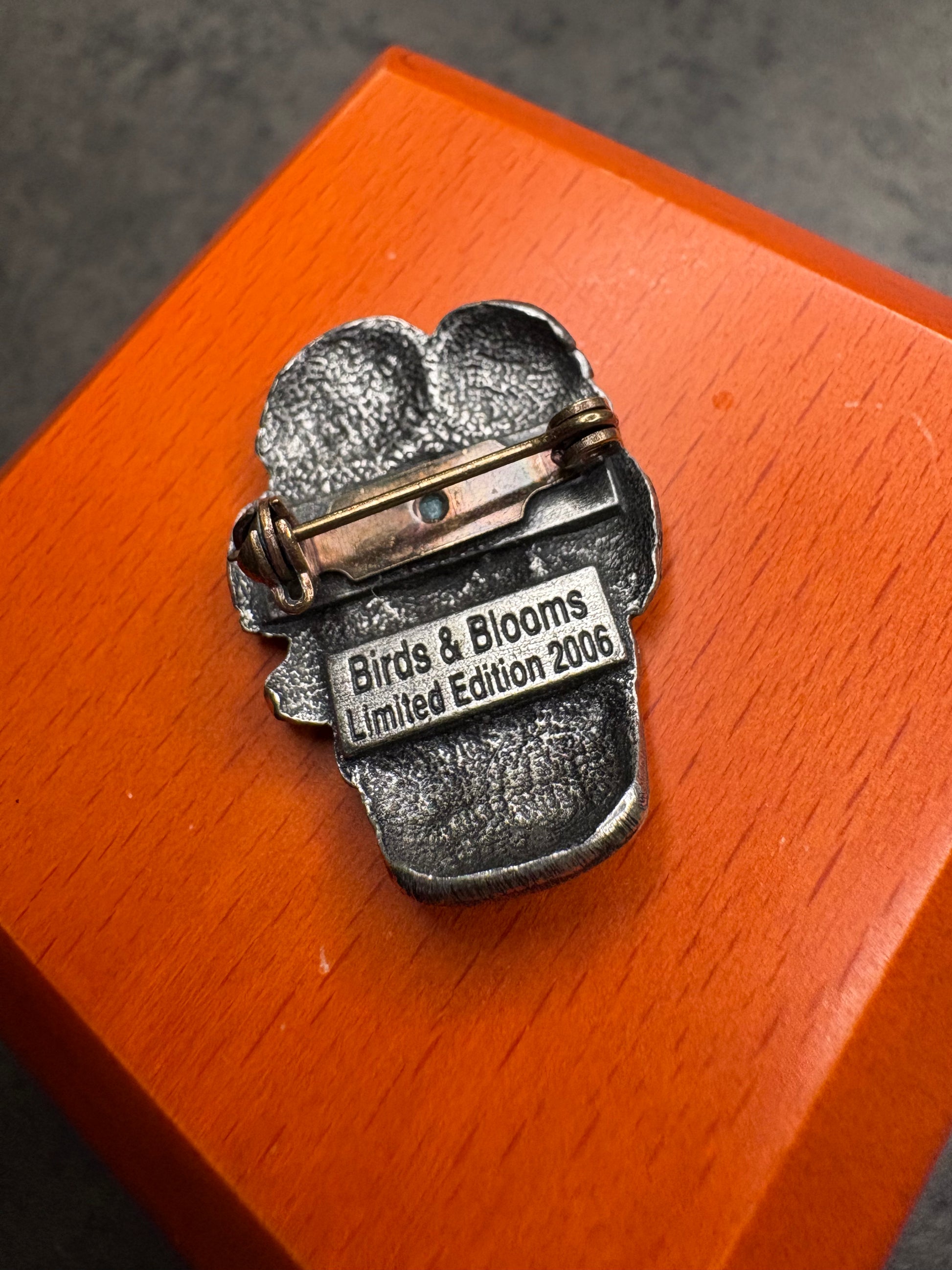 Questa spilla fa parte della collezione Birds & Blooms, edizione limitata del 2006, ed è dedicata al tema floreale. Realizzata in peltro, raffigura un vaso di girasoli finemente dettagliati, con una resa molto realistica dei petali e dei capolini. La lavorazione in rilievo e la texture delicata richiamano l’illustrazione botanica, cifra distintiva di questa linea. Un gioiello decorativo e poetico, pensato per veri appassionati e collezionisti.