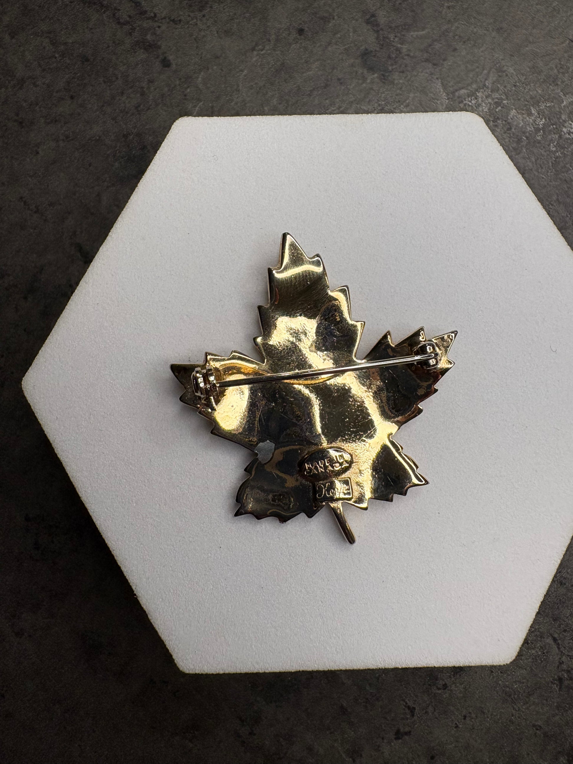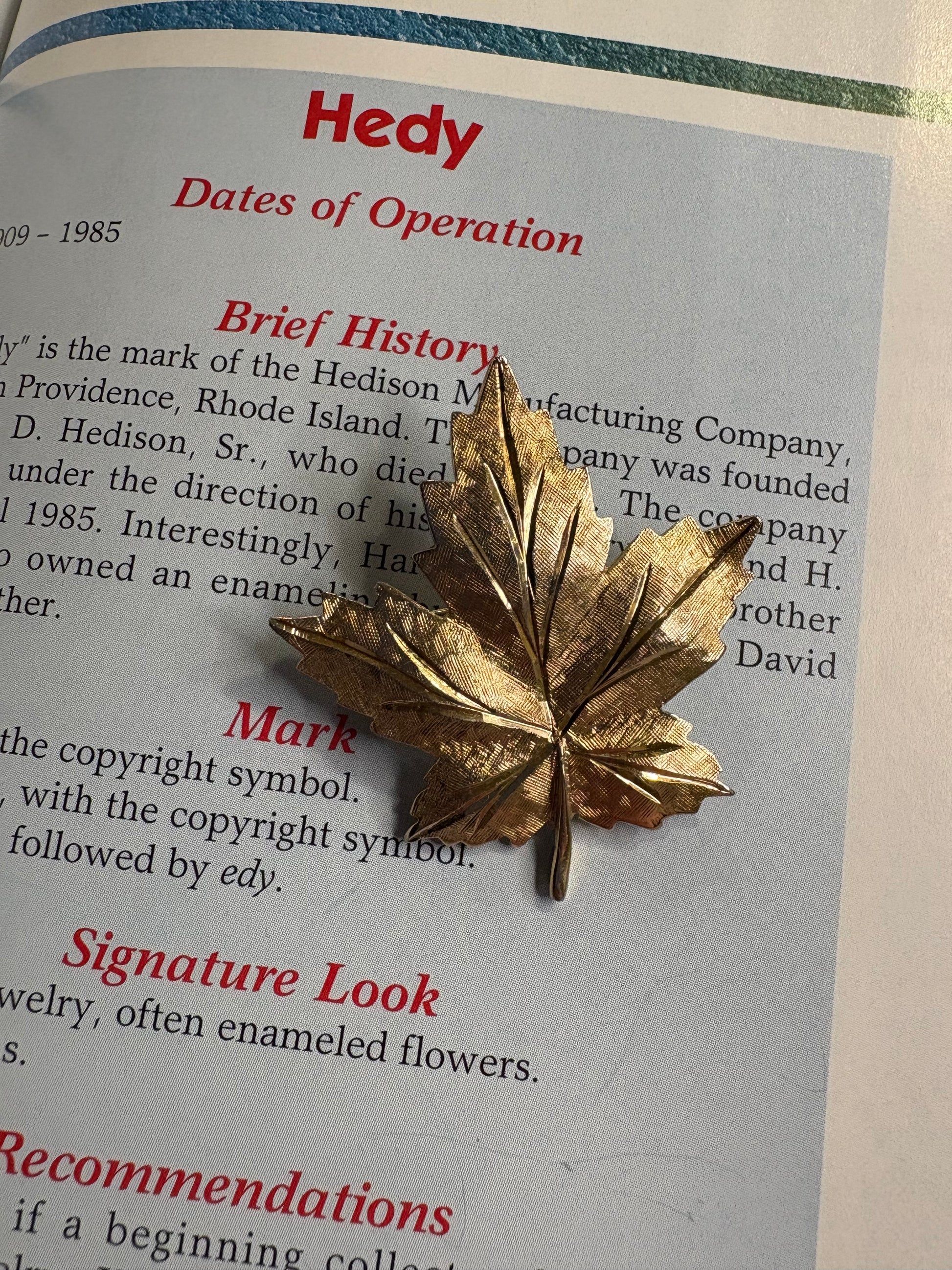 Bellissima spilla Hedy “Canada” realizzata a forma di foglia in metallo dorato. Le venature sono incise con precisione, conferendo realismo e profondità al design. La superficie presenta minimi segni del tempo che ne testimoniano l’autenticità vintage senza comprometterne la bellezza. Un gioiello elegante e naturale, tipico della produzione canadese di qualità.