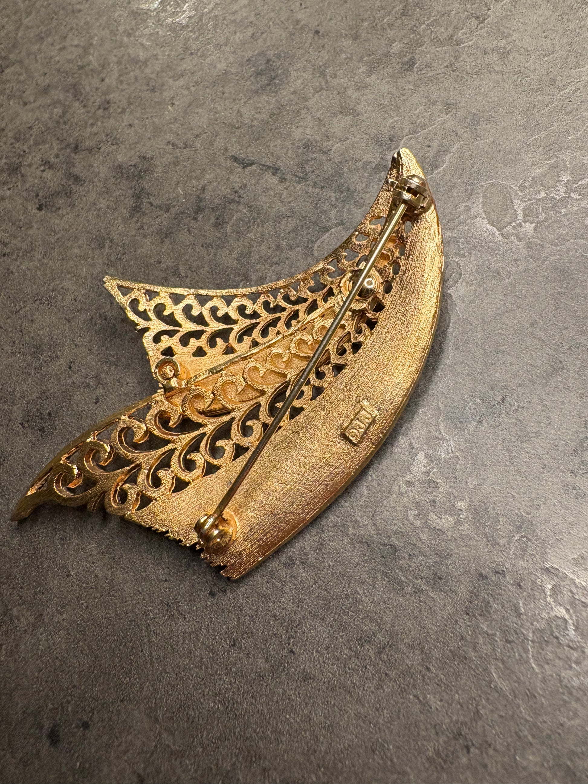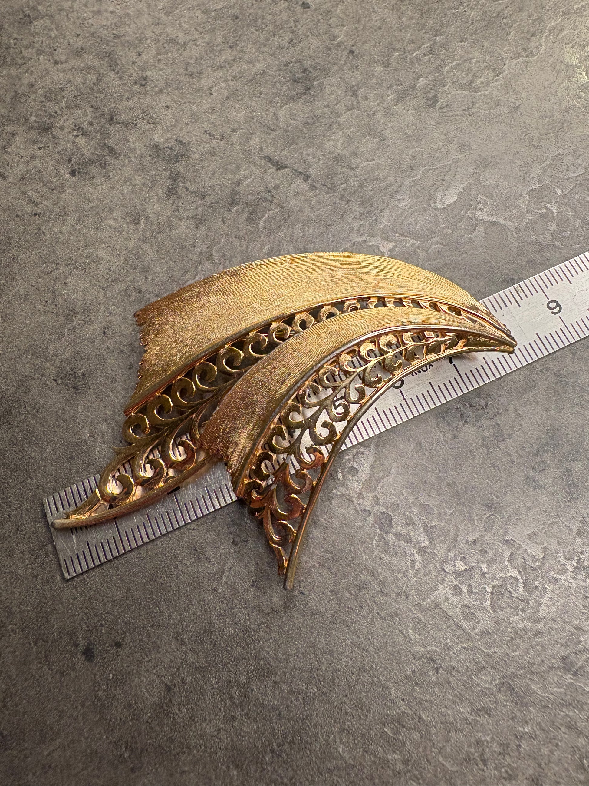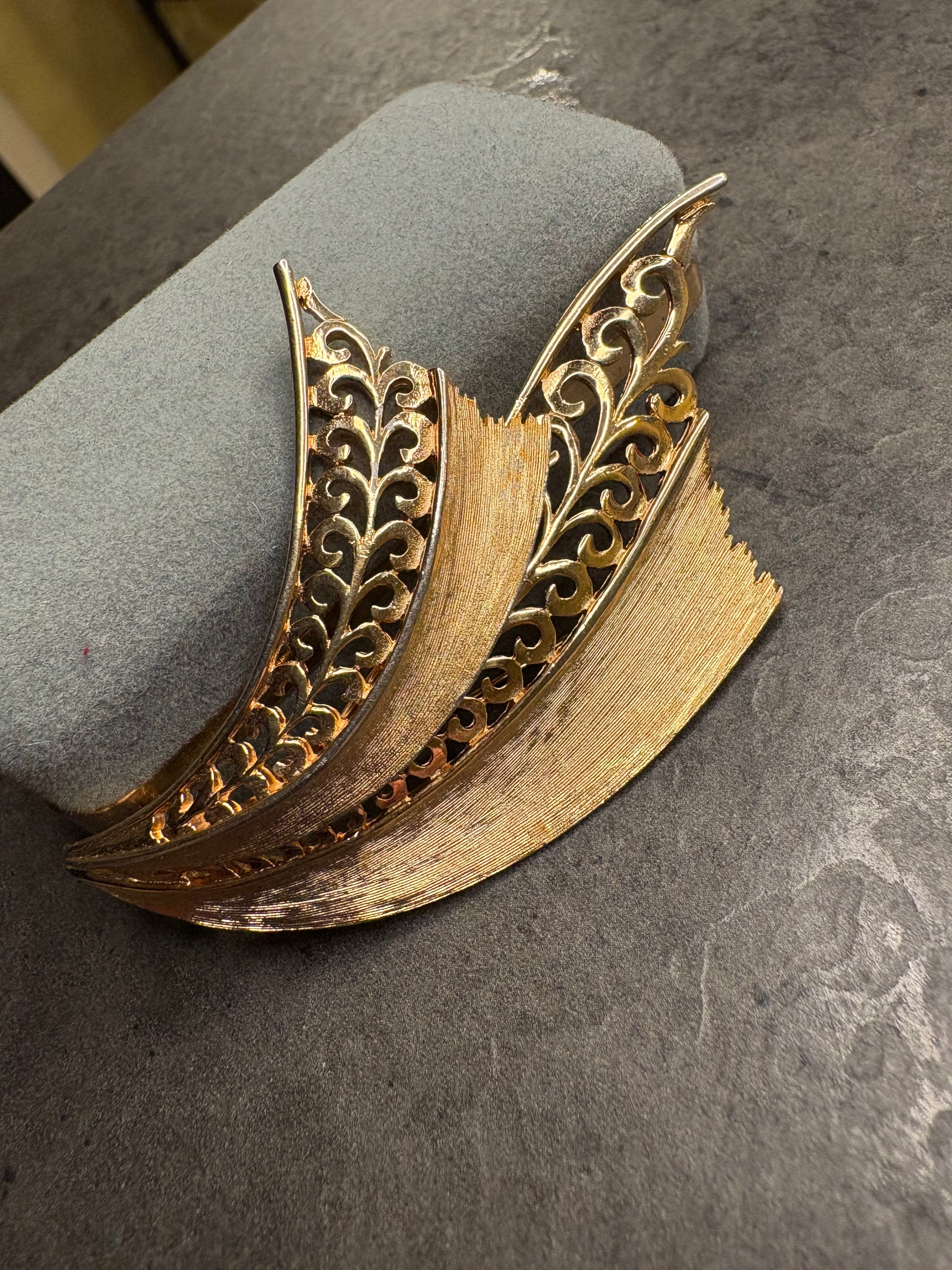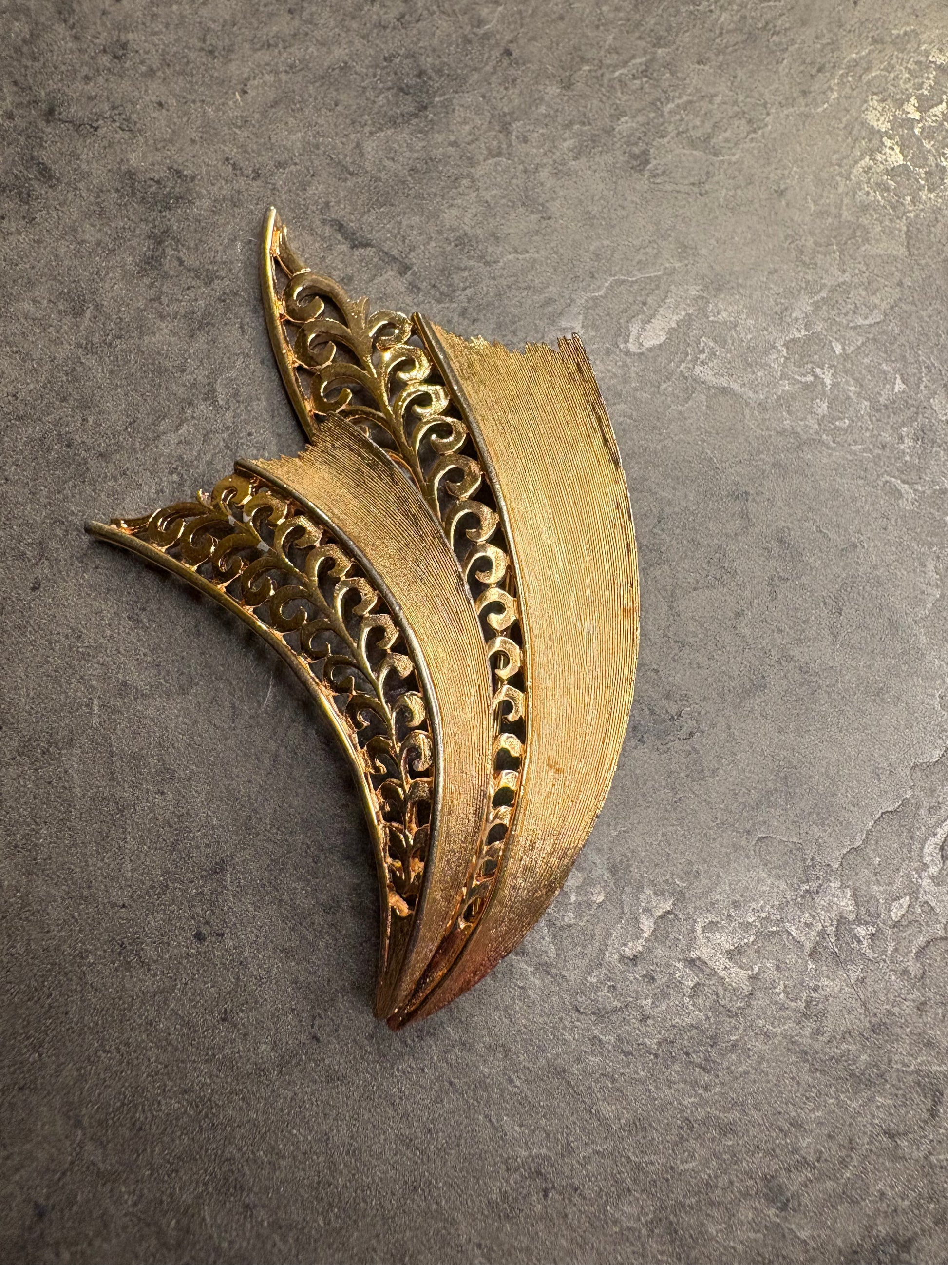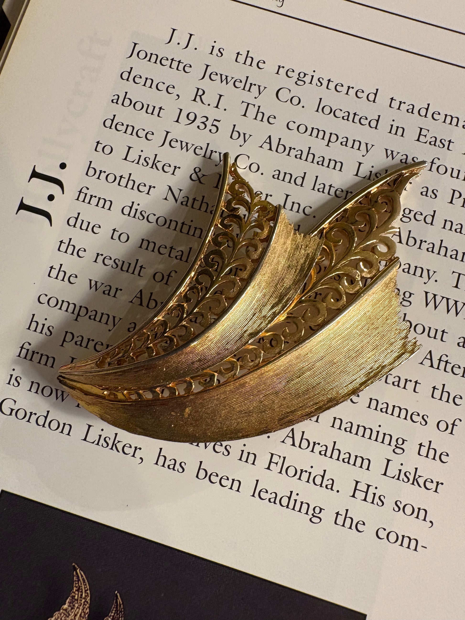 Questa splendida spilla vintage firmata JJ colpisce subito per il suo design elegante e movimentato: tre grandi curve dorate si intrecciano tra loro come pennellate metalliche, creando una forma slanciata e dinamica. Le superfici alternano una finitura rigata, luminosa e sofisticata, a una lavorazione traforata fatta di piccole volute ornamentali che ricordano una filigrana moderna, leggera e ariosa. Il metallo dorato, caldo e brillante, valorizza ogni dettaglio del rilievo e dona profondità all’intera composizione. Sul retro compare la firma © JJ, segno distintivo della Jonette Jewelry Company, celebre per i suoi pezzi decorativi curatissimi e oggi molto apprezzati dai collezionisti. Una spilla scenografica, raffinata e ricca di movimento, perfetta per impreziosire giacche, cappotti e abiti con un tocco vintage di grande classe.