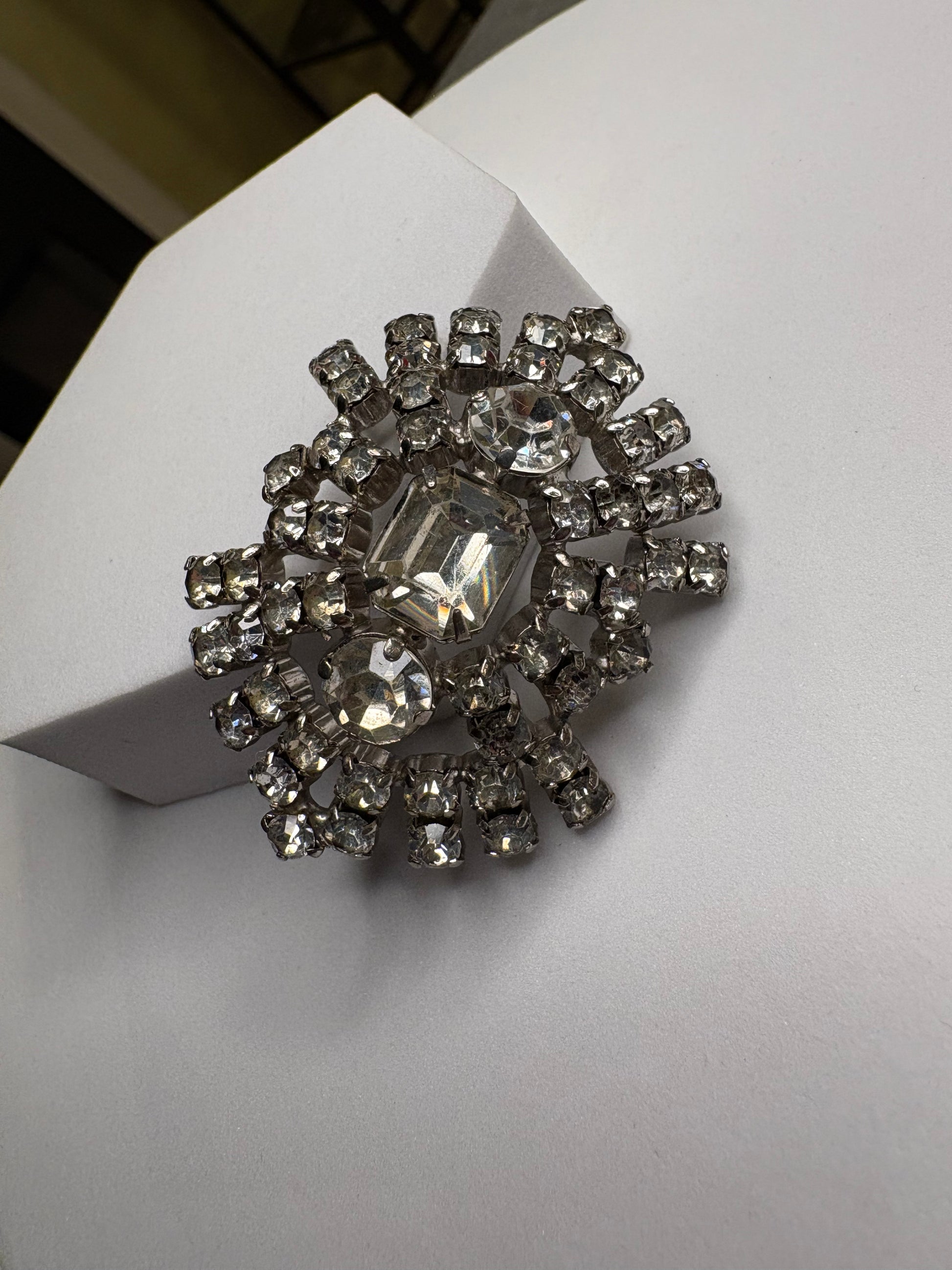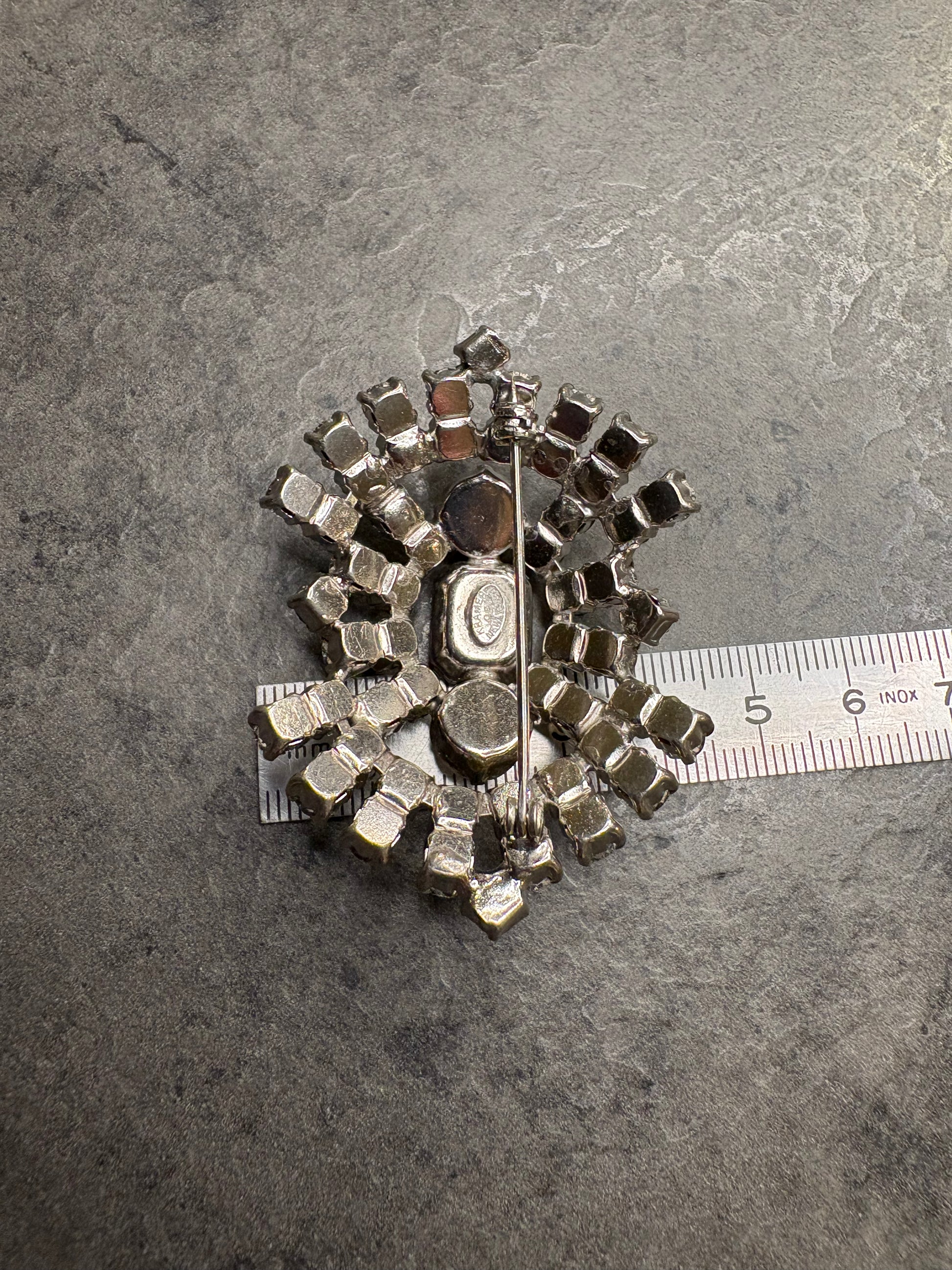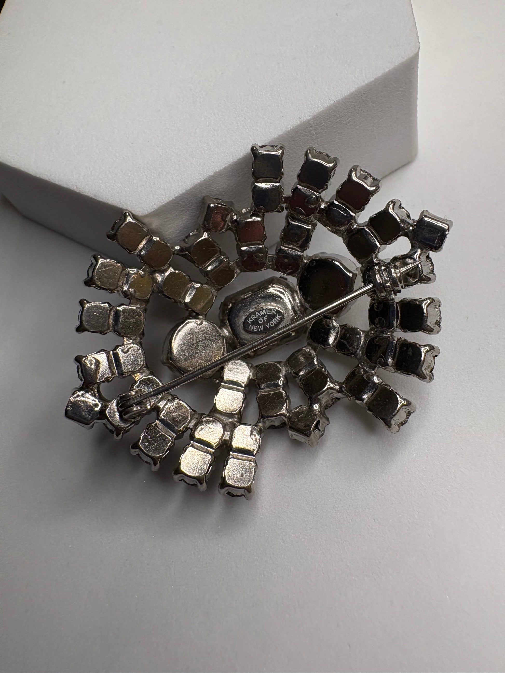 Meravigliosa e rara spilla vintage di Kramer of New York, realizzata in metallo color argento e riccamente ricoperta di cristalli trasparenti. Il design è scenografico e tridimensionale, con una grande pietra centrale sfaccettata circondata da una composizione radiale di cristalli di diverse dimensioni che creano un effetto esplosione di luce. Presenta minime perdite di luminosità compatibili con l’età, che non compromettono l’impatto visivo del pezzo. Un gioiello importante e altamente collezionabile.