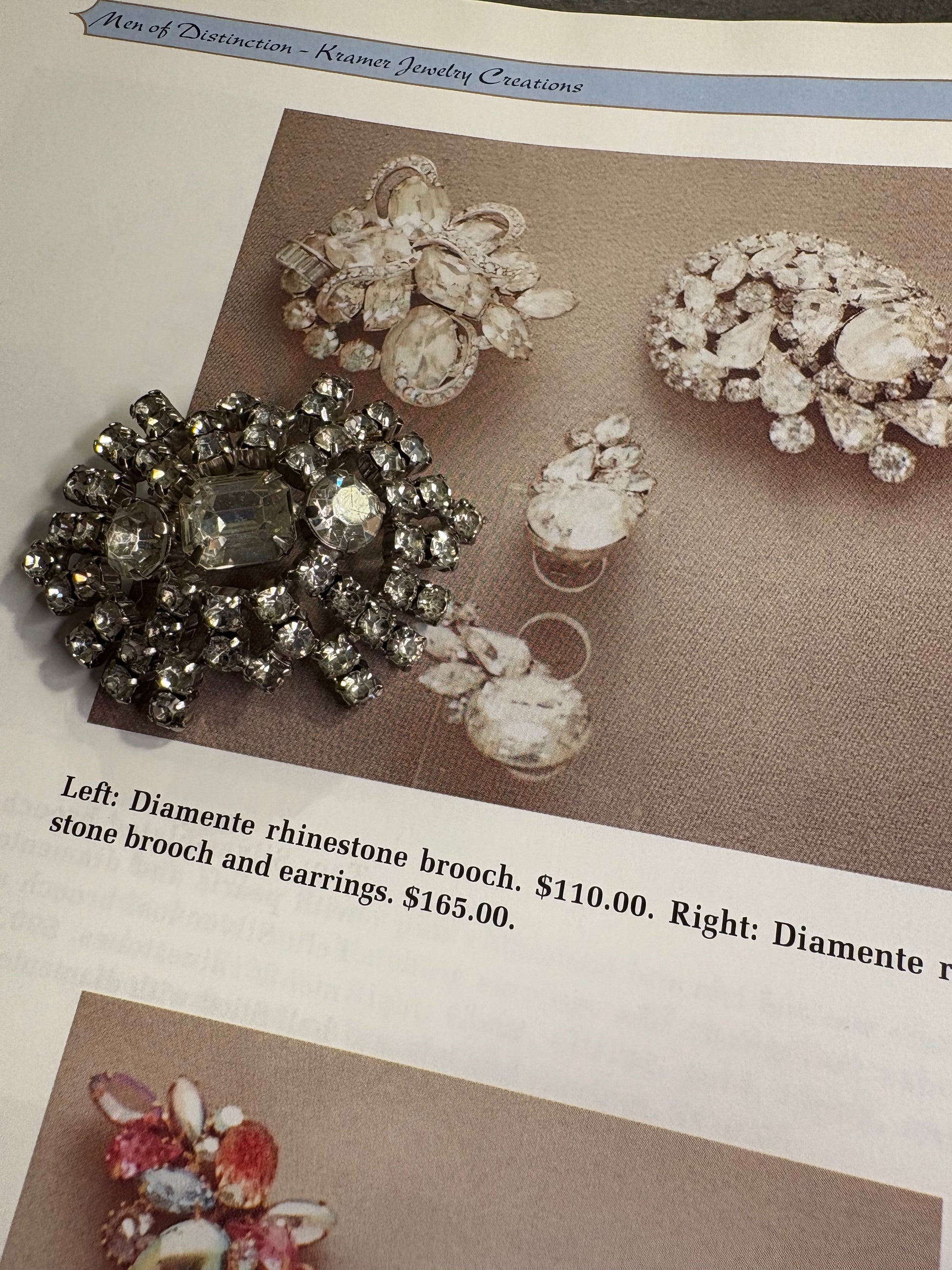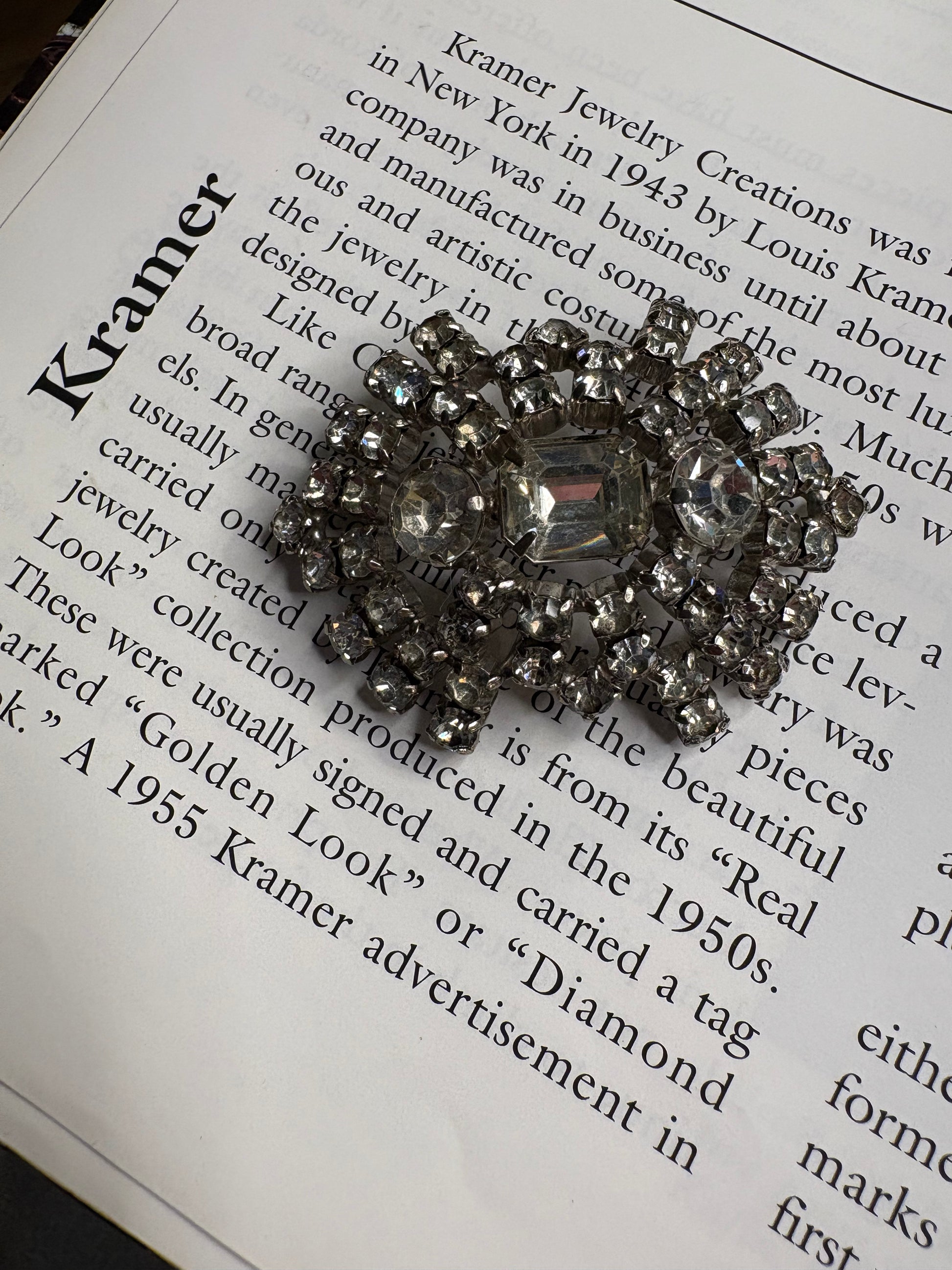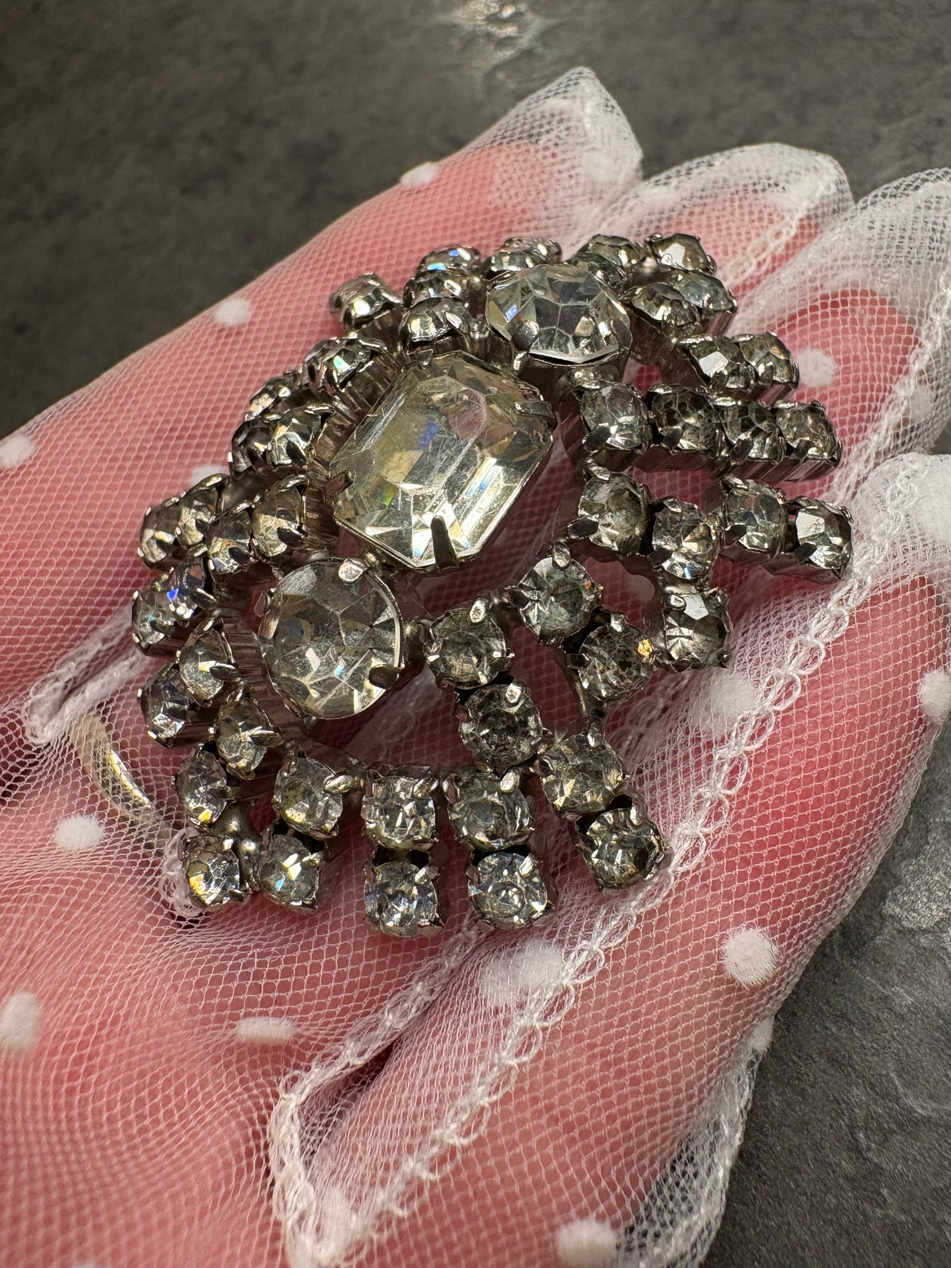 Meravigliosa e rara spilla vintage di Kramer of New York, realizzata in metallo color argento e riccamente ricoperta di cristalli trasparenti. Il design è scenografico e tridimensionale, con una grande pietra centrale sfaccettata circondata da una composizione radiale di cristalli di diverse dimensioni che creano un effetto esplosione di luce. Presenta minime perdite di luminosità compatibili con l’età, che non compromettono l’impatto visivo del pezzo. Un gioiello importante e altamente collezionabile.