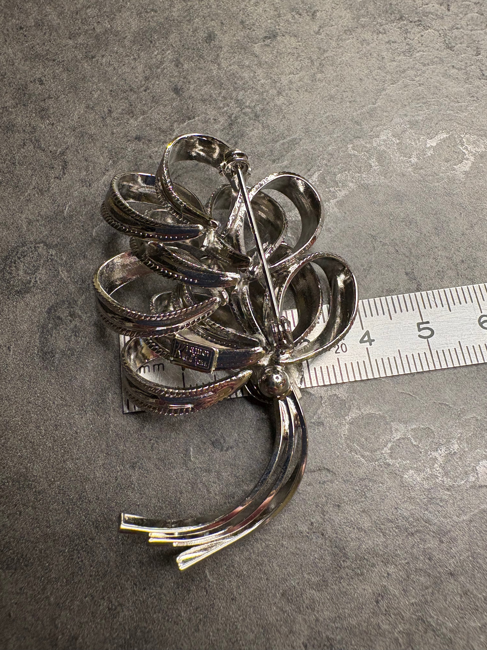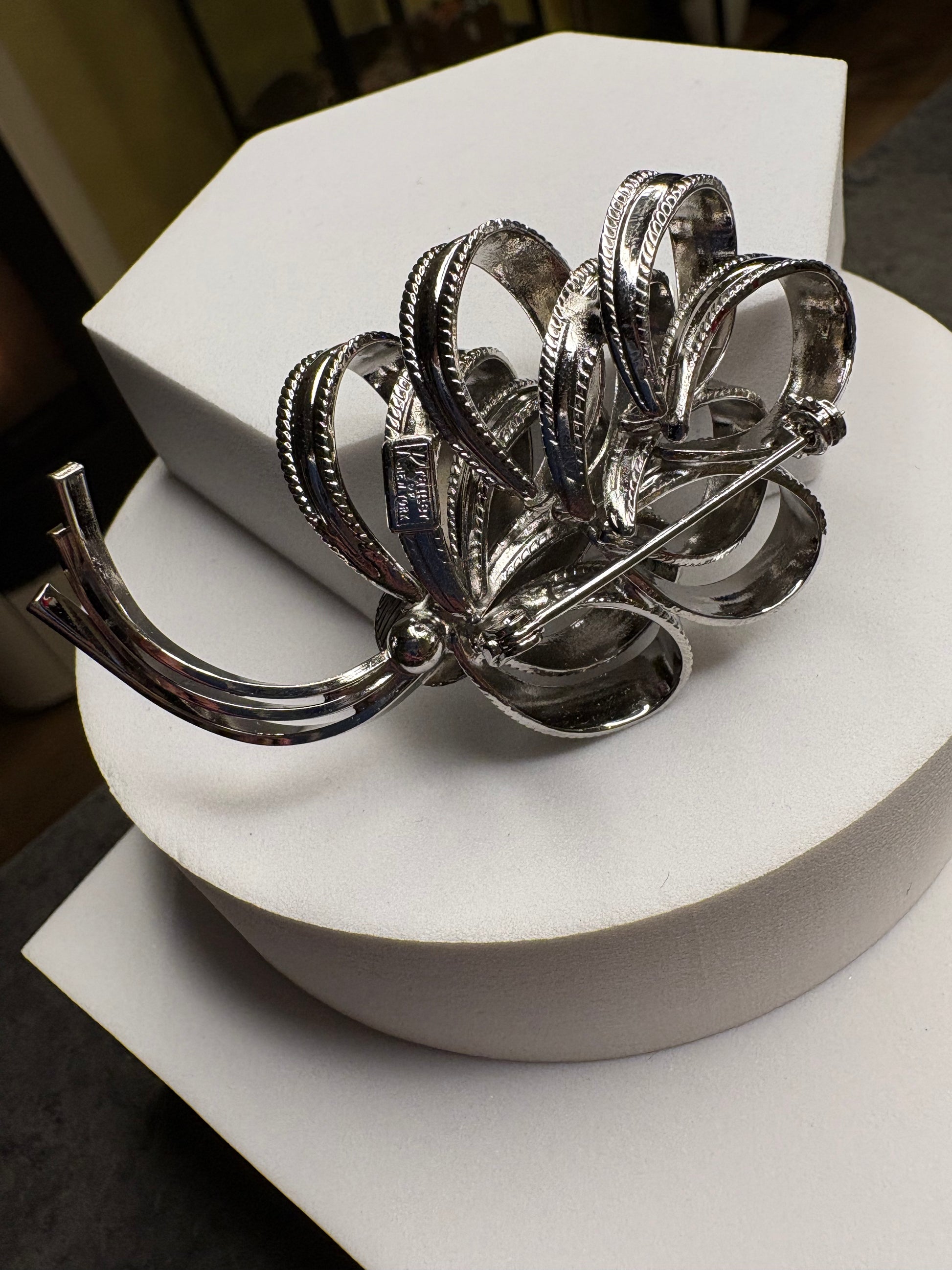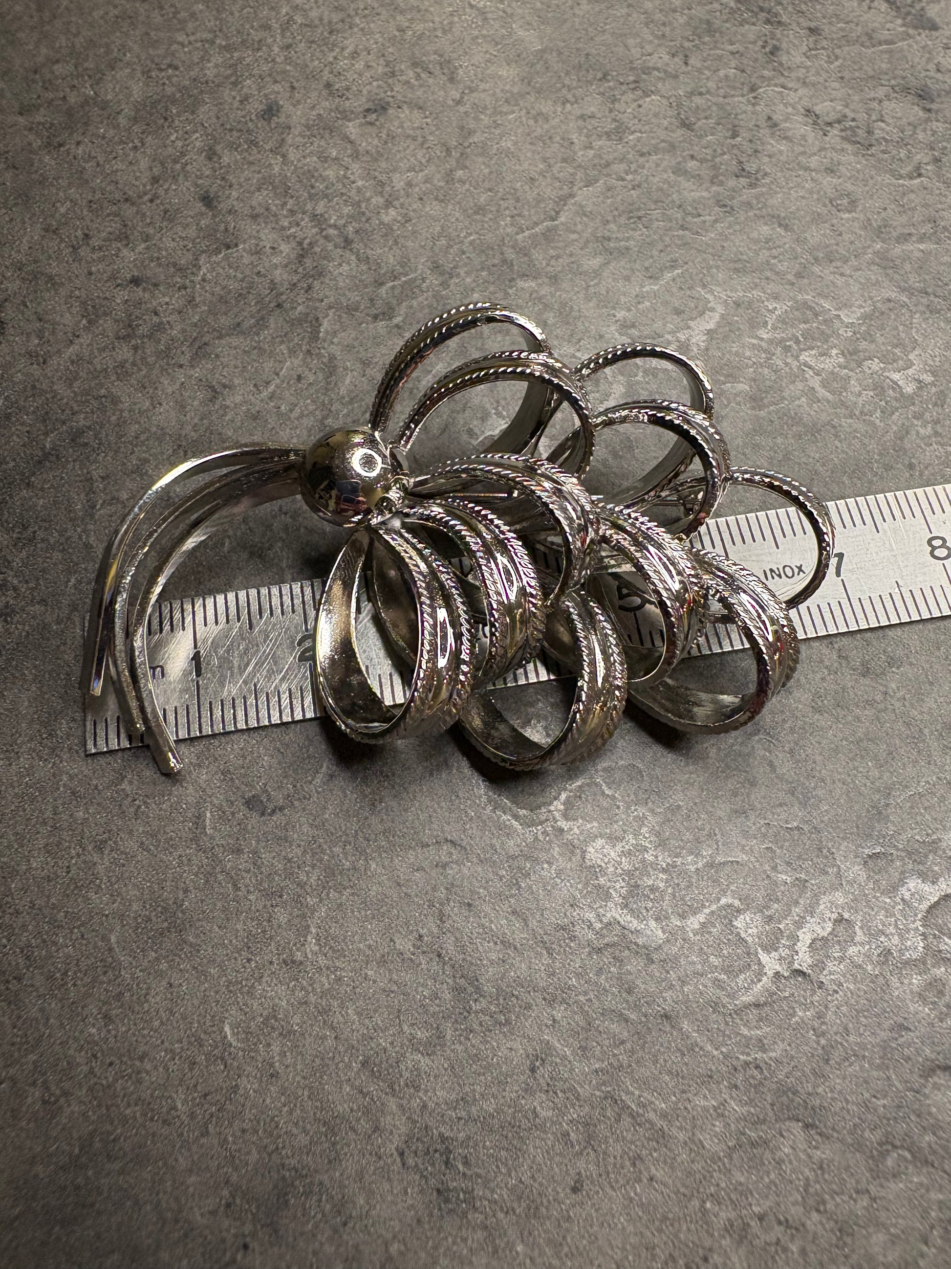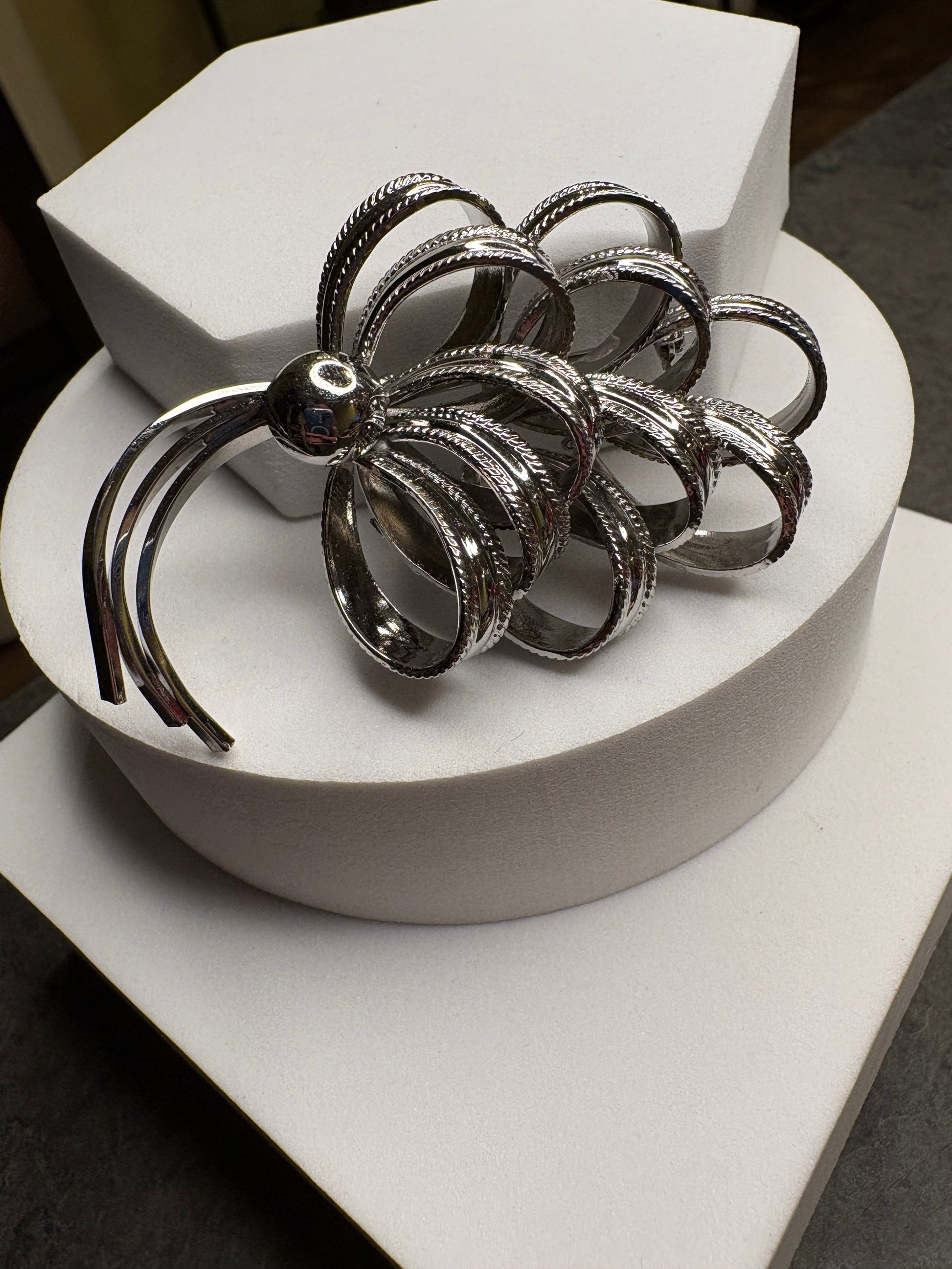 Questa meravigliosa spilla è un rarissimo e scenografico pezzo firmato Kramer of New York, realizzato in metallo argentato lucido con una struttura tridimensionale molto elaborata. Il design, fortemente plastico e scultoreo, è composto da una serie di anelli o nastri metallici intrecciati e sovrapposti, che creano un volume importante e un effetto visivo estremamente dinamico. La finitura specchiata esalta la complessità della forma e la rende un vero e proprio gioiello-scultura, molto ricercato dai collezionisti per l’originalità del disegno e per la qualità della realizzazione.