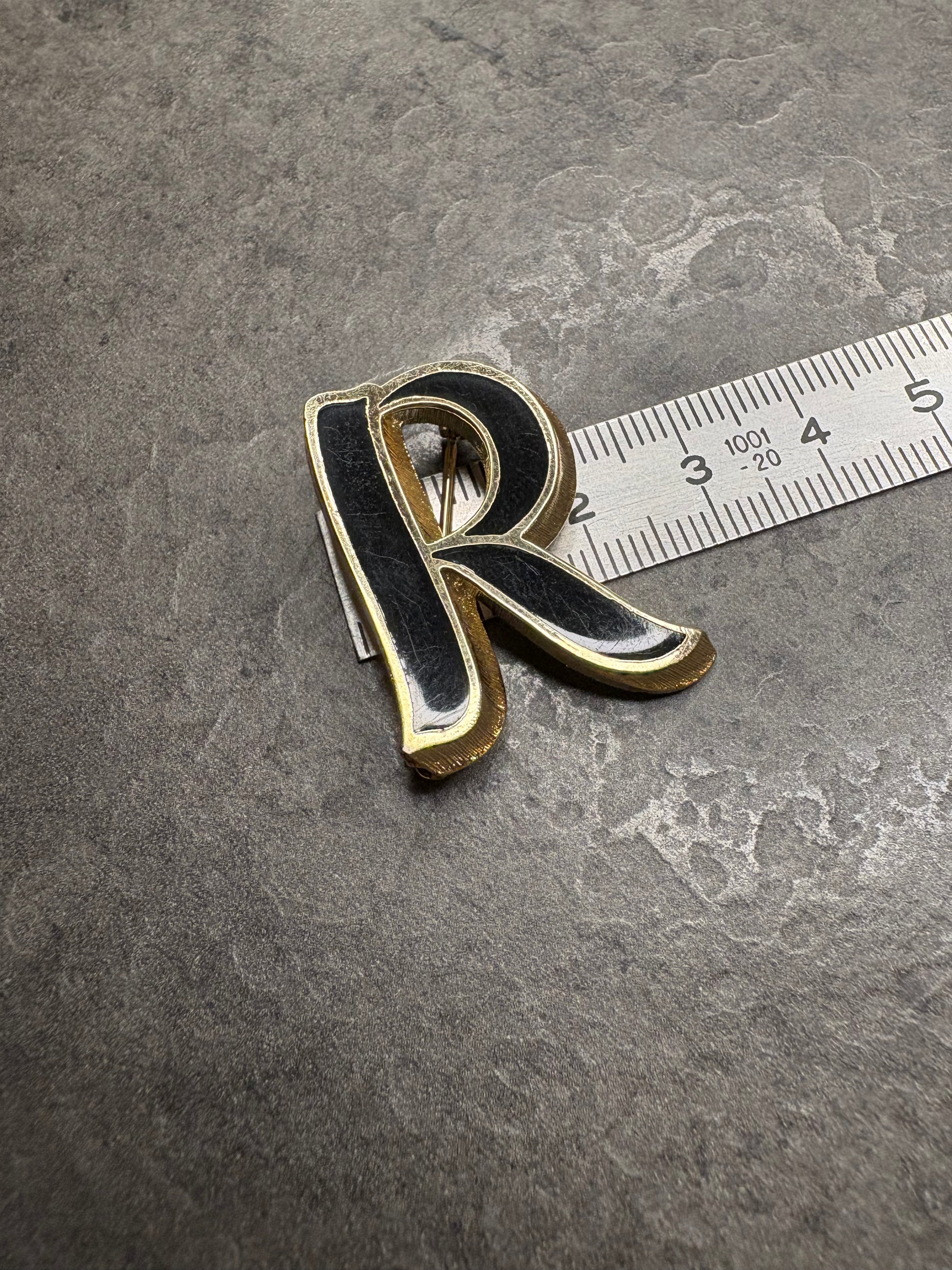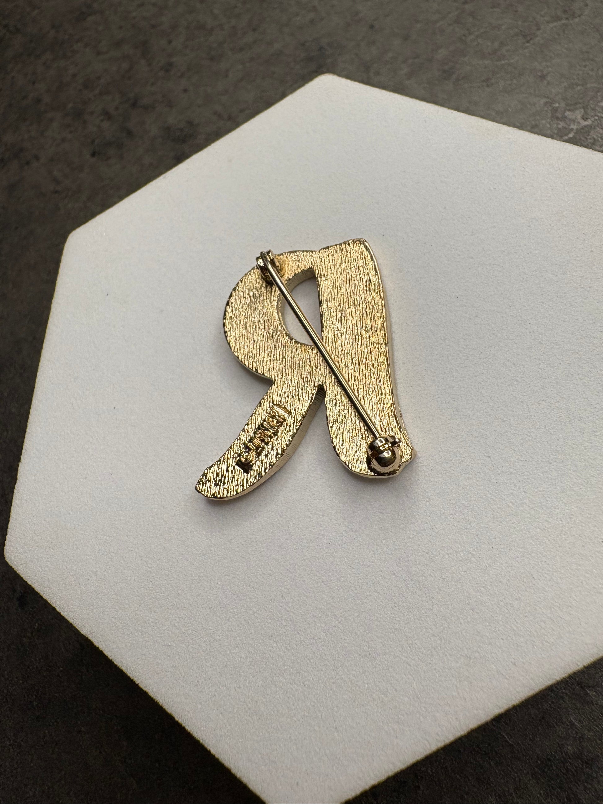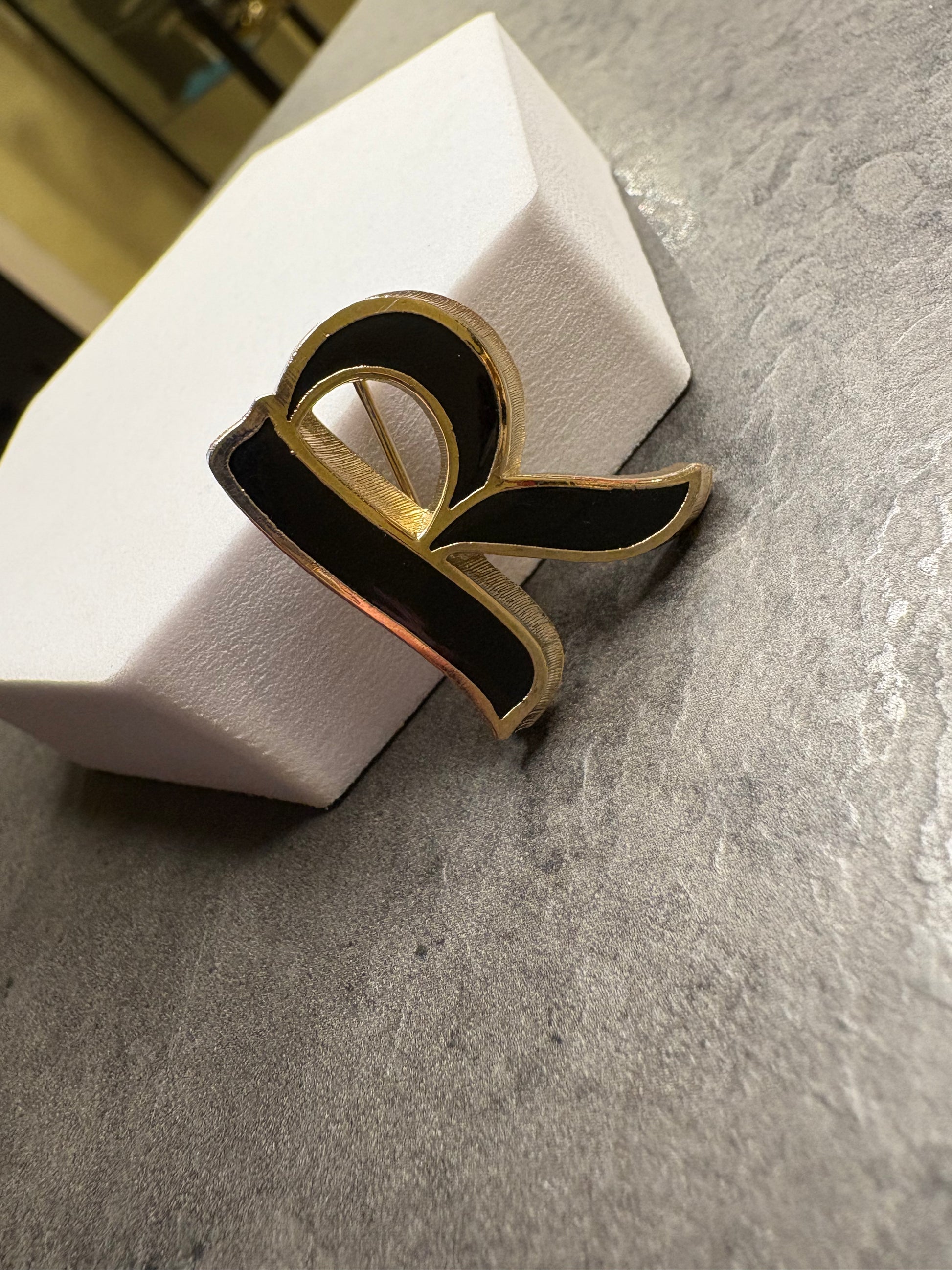 Spilla vintage a forma di iniziale “R” firmata Lisner, realizzata in metallo dorato con elegante inserto in smalto nero. Il design è grafico e ben bilanciato, con linee morbide ma decise che conferiscono carattere al monogramma. Il contrasto tra la finitura dorata lucida e lo smalto nero profondo crea un effetto raffinato e senza tempo, tipico delle produzioni Lisner di metà Novecento. La spilla è solida, ben rifinita anche sul retro, e rappresenta un accessorio distintivo, perfetto sia come gioiello personalizzato sia come pezzo da collezione. Ottime condizioni vintage, con lievissimi segni del tempo coerenti con l’età.
