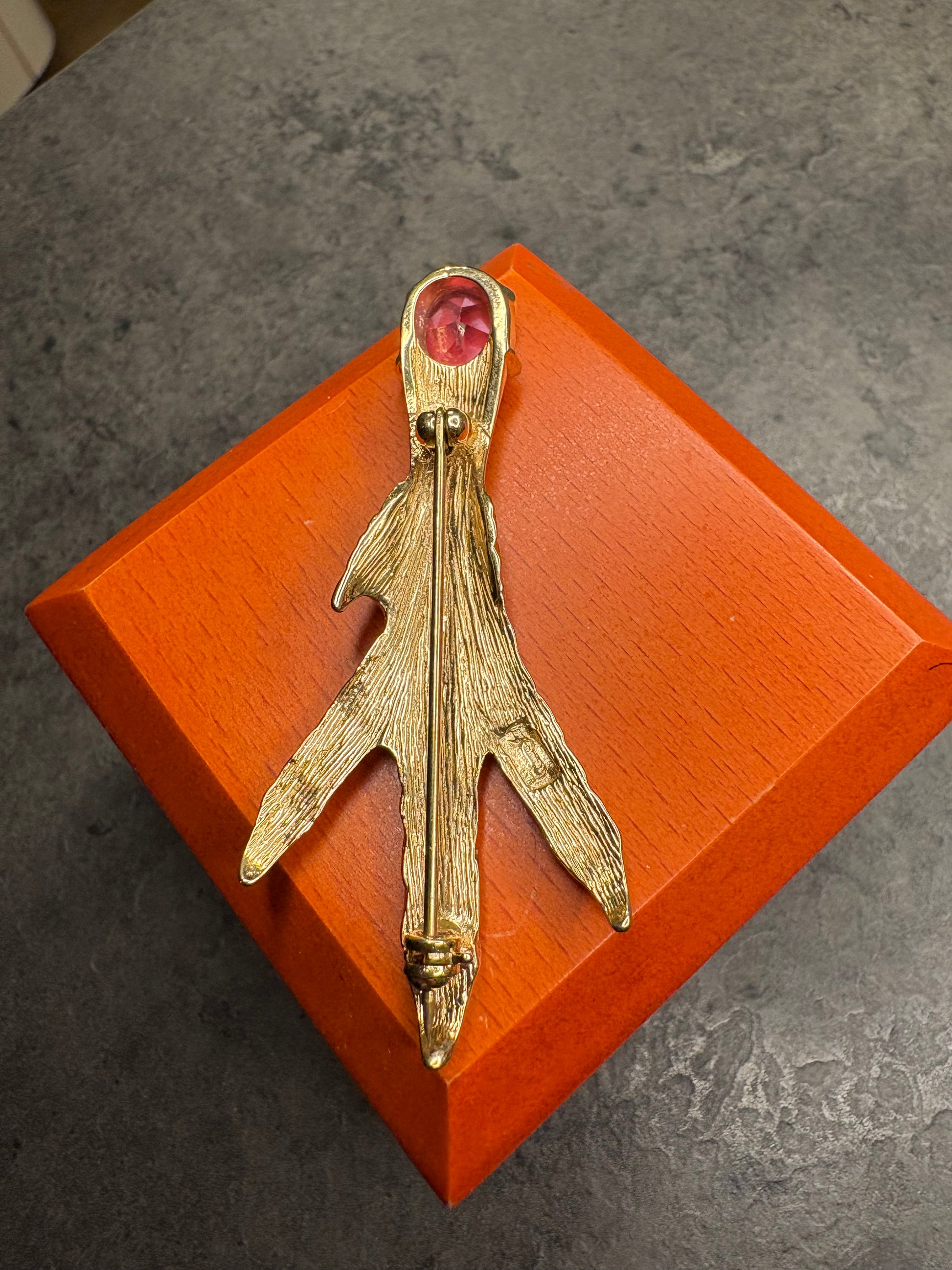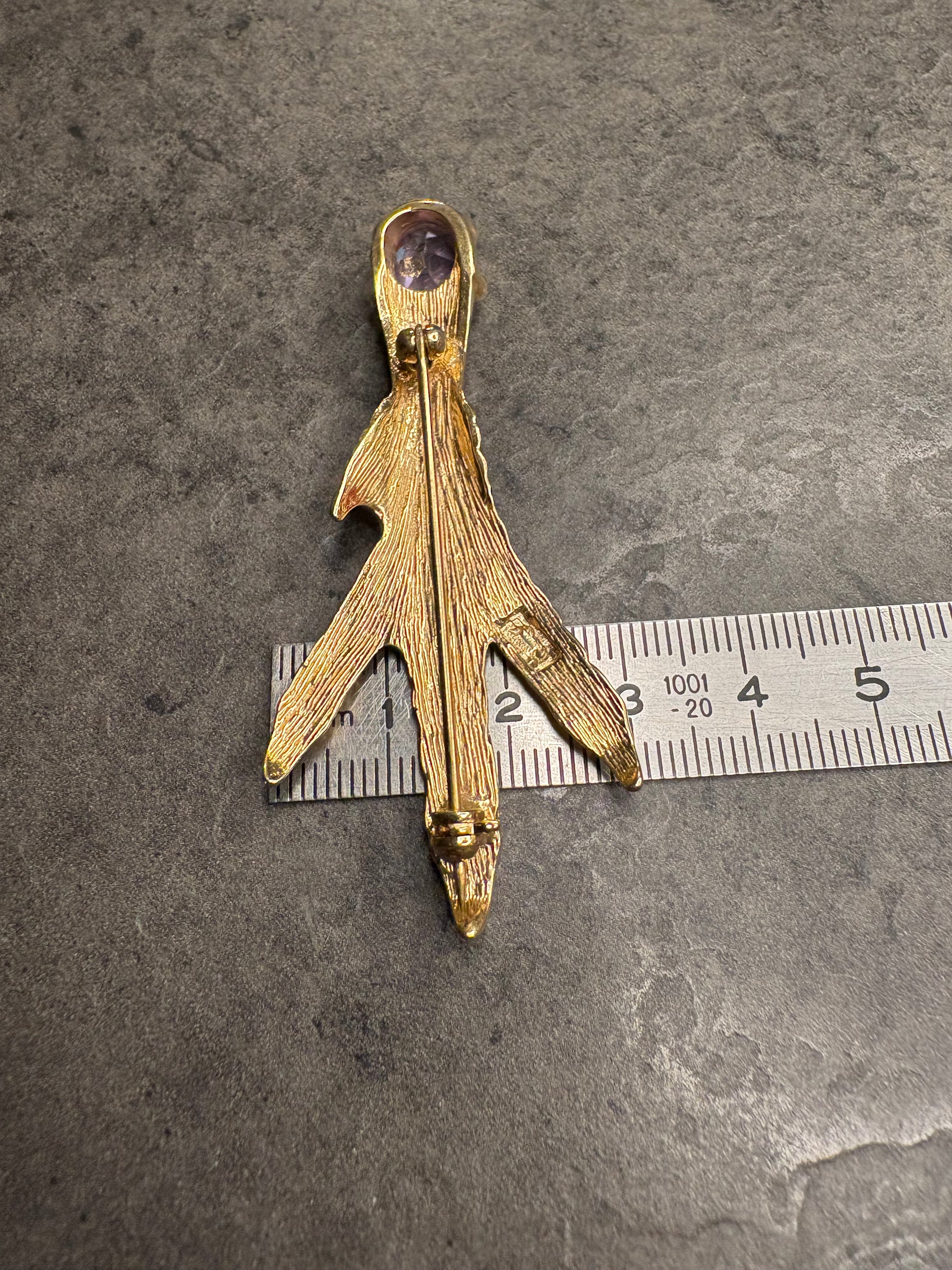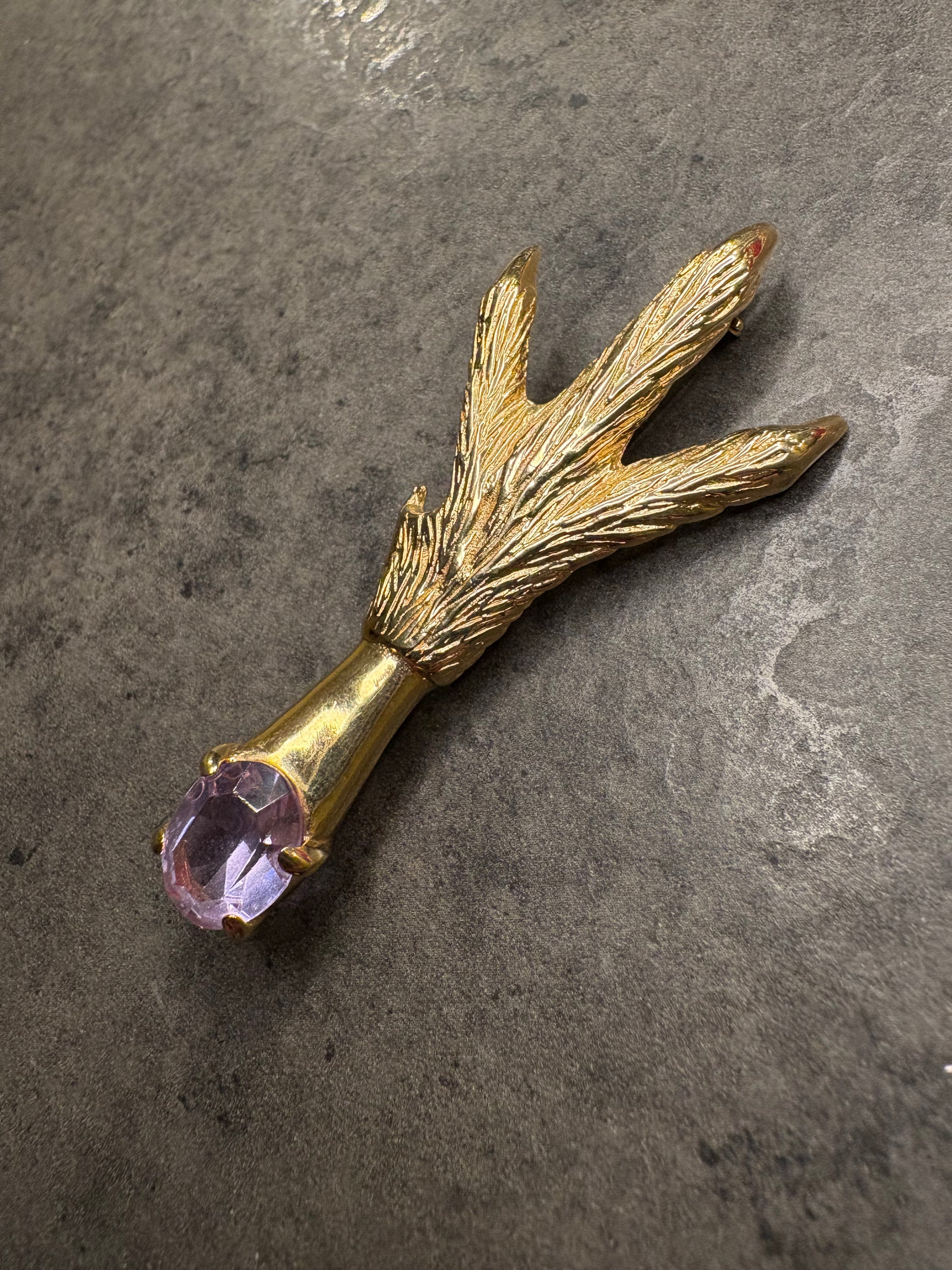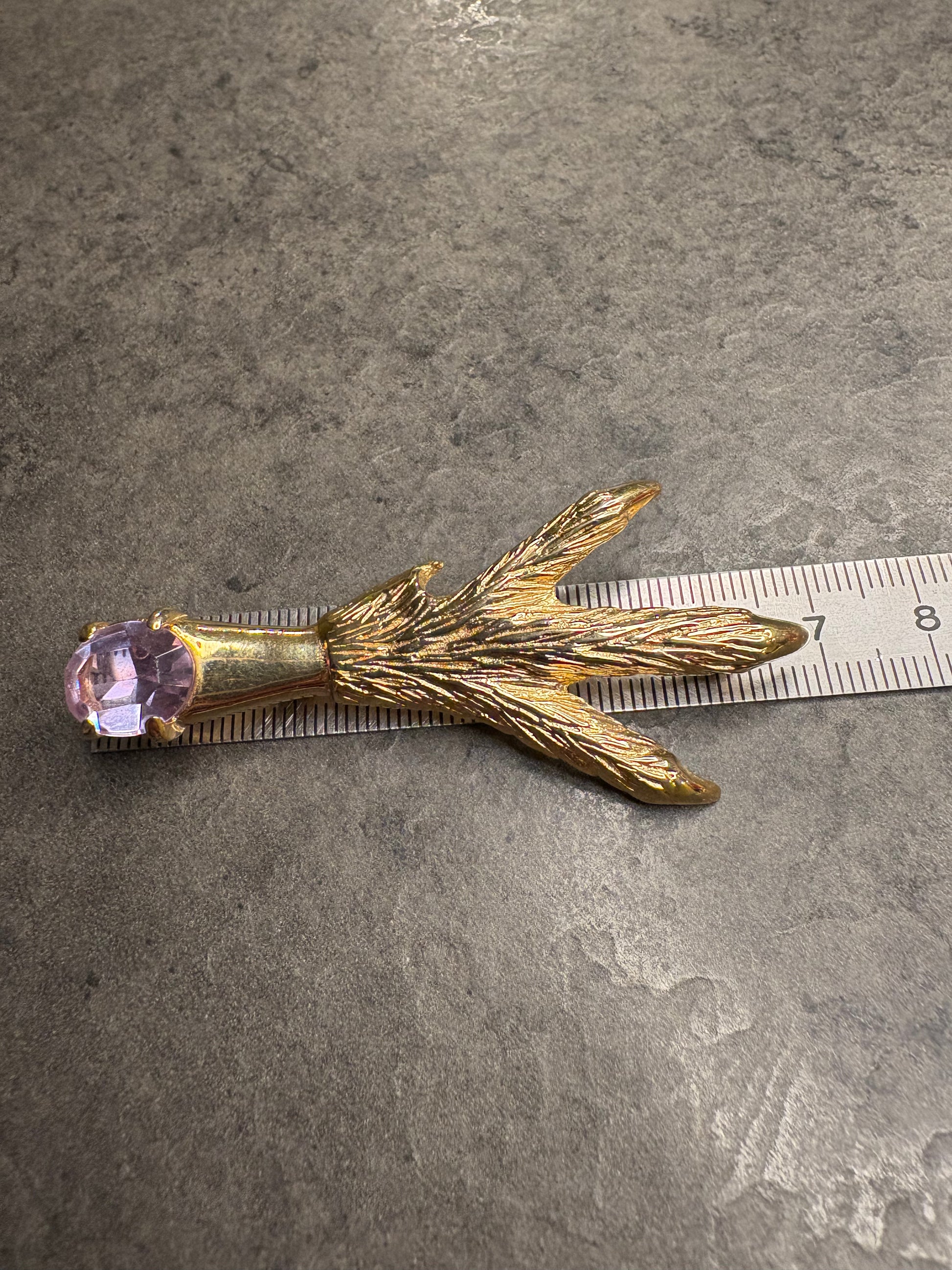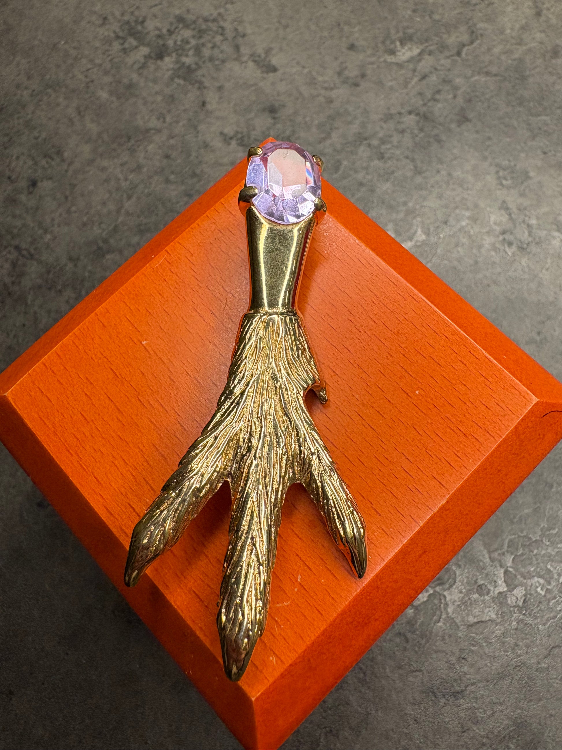 Questa splendida spilla vintage raffigura una zampa d’uccello portafortuna, un soggetto profondamente radicato nel folklore scozzese. Realizzata in metallo dorato, mostra una lavorazione ricca di dettagli: le tre “dita” sono scolpite con una texture che imita le piume e le scaglie dell’animale, creando un effetto realistico e potente. Nella parte superiore, la montatura liscia e lucida sostiene un grande cristallo sfaccettato color ametista, che aggiunge un tocco di luce e raffinatezza al talismano.