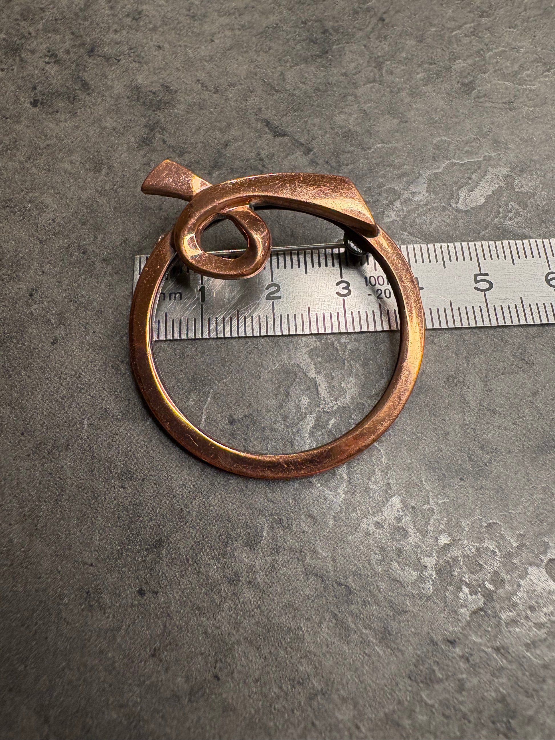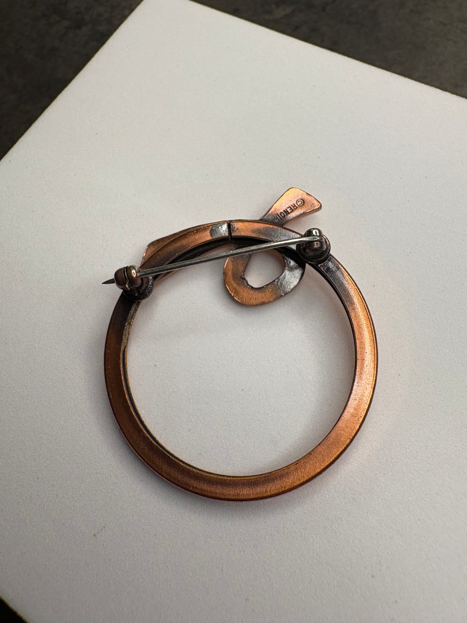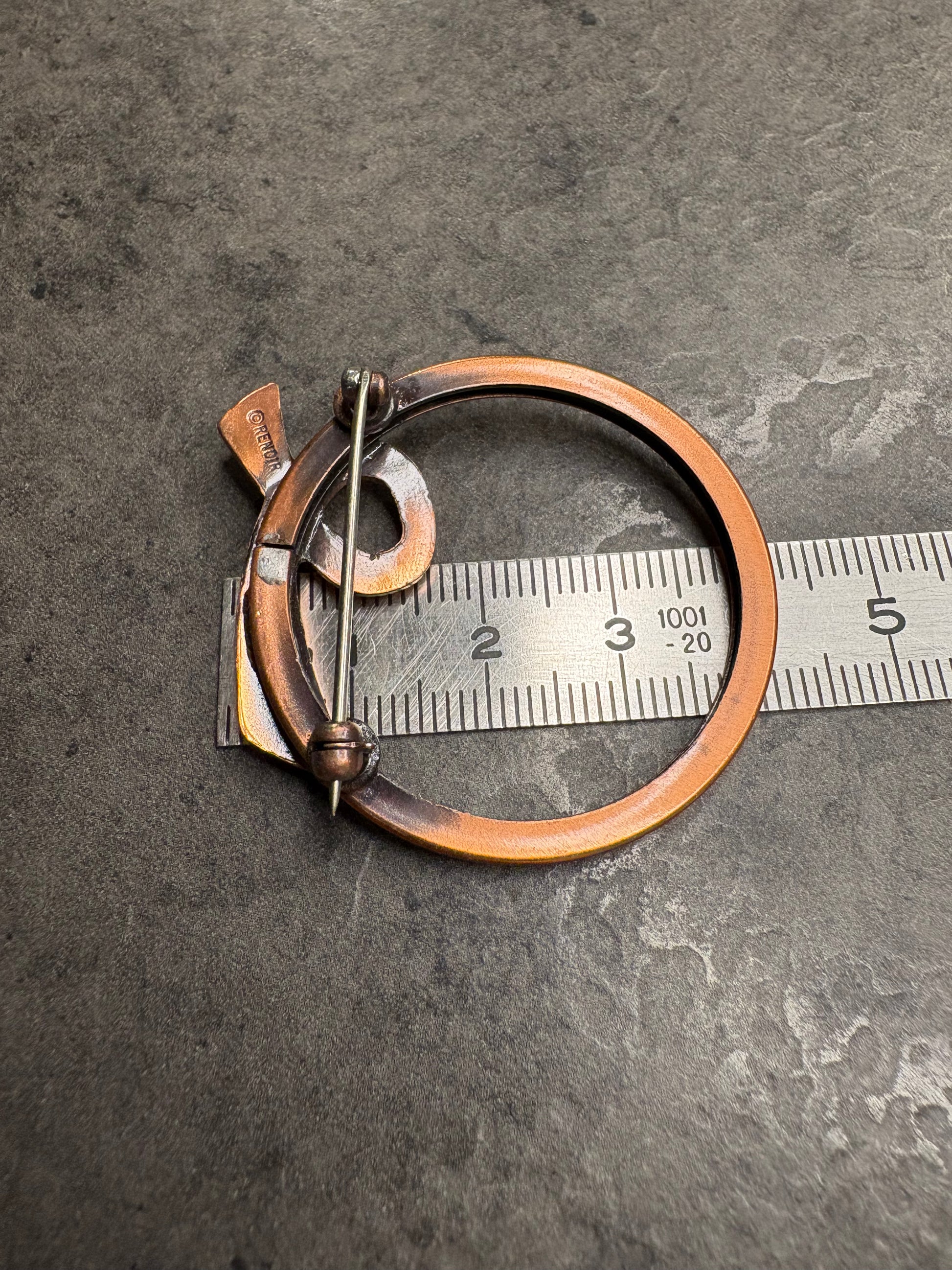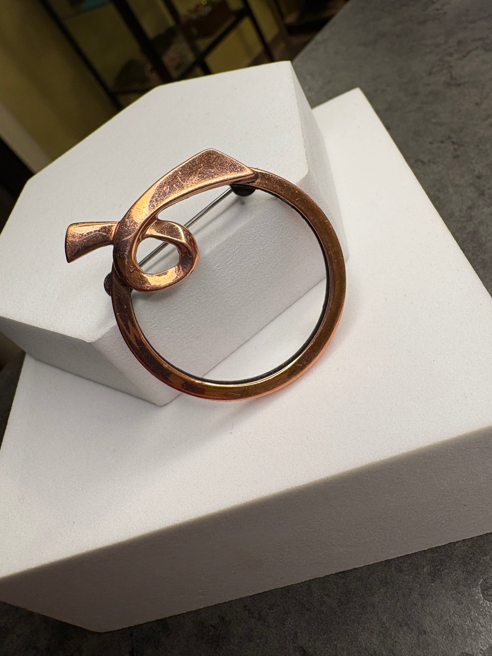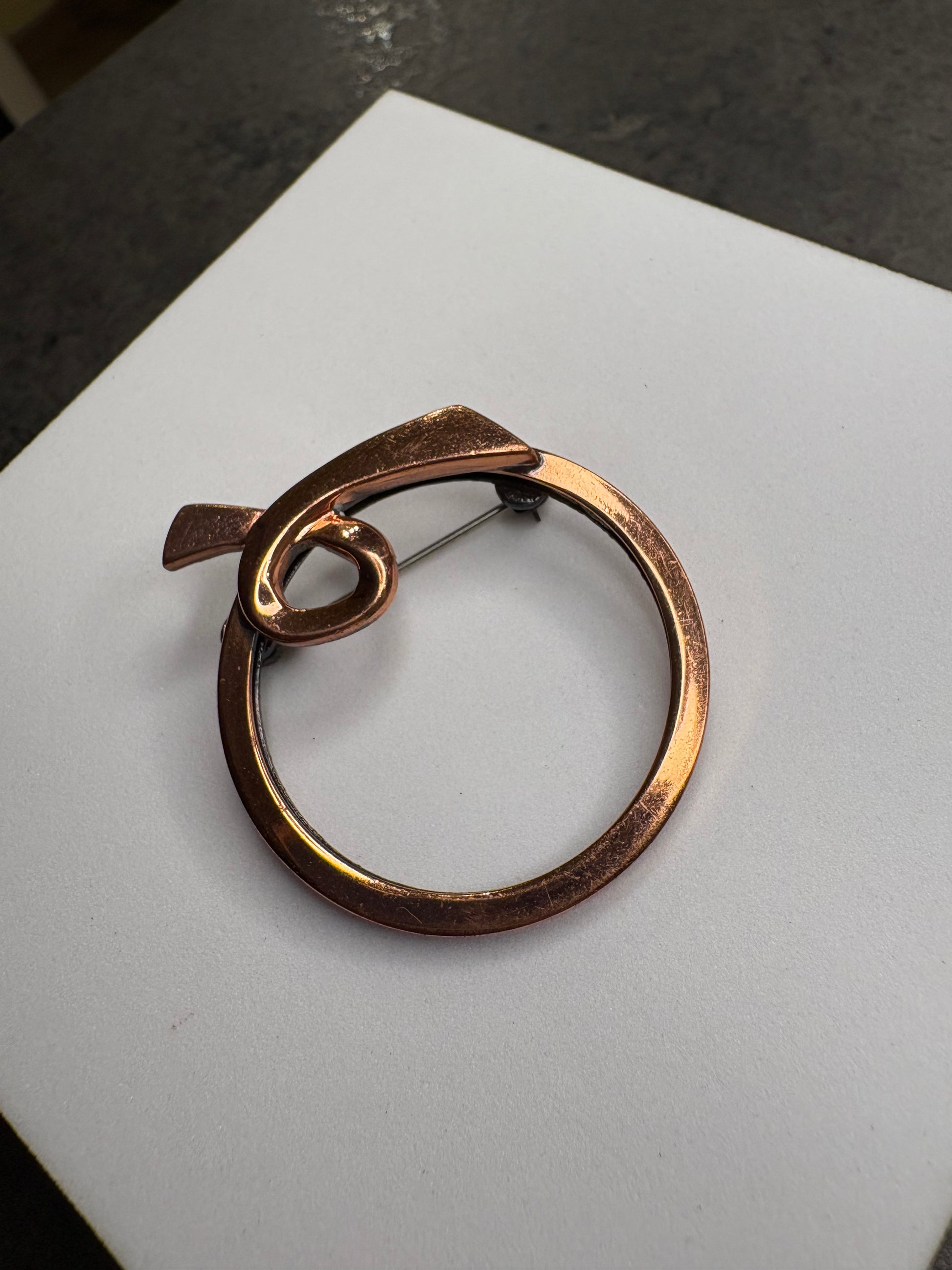 Importante spilla vintage firmata Matisse Renoir, realizzata in rame massiccio con la tipica finitura calda e leggermente satinata che caratterizza questi gioielli artistici di metà Novecento. Il design è astratto e scultoreo, con linee fluide che si avvolgono a formare un motivo circolare e dinamico, molto moderno e ancora oggi attualissimo. La superficie mostra la naturale patina del rame, che ne esalta il carattere e l’autenticità. Questo tipo di spilla è molto ricercato dai collezionisti sia per il valore del marchio sia per lo stile artistico distintivo. Pezzo raro e di grande fascino, in buone condizioni vintage con lievi segni coerenti con l’età.
