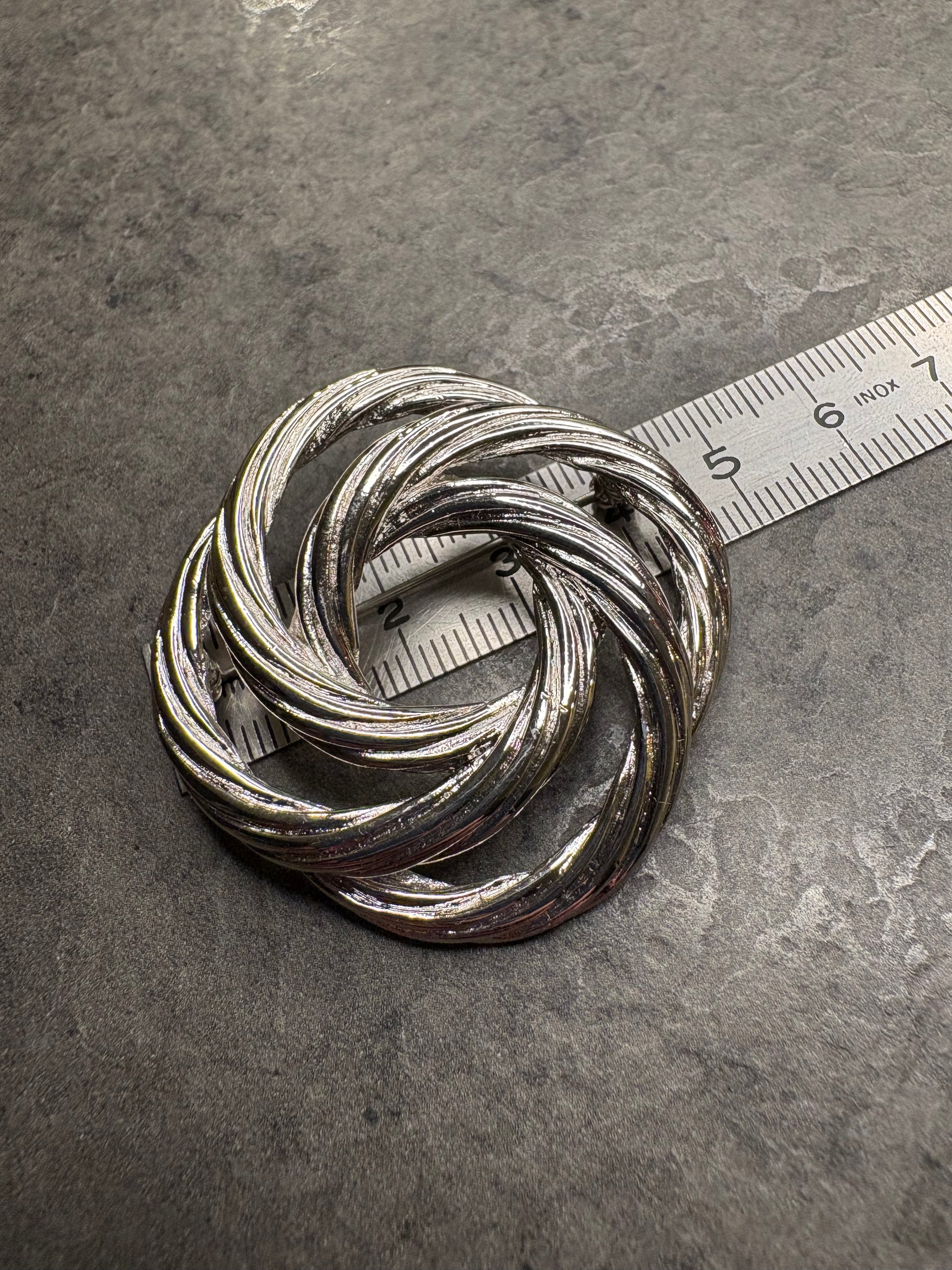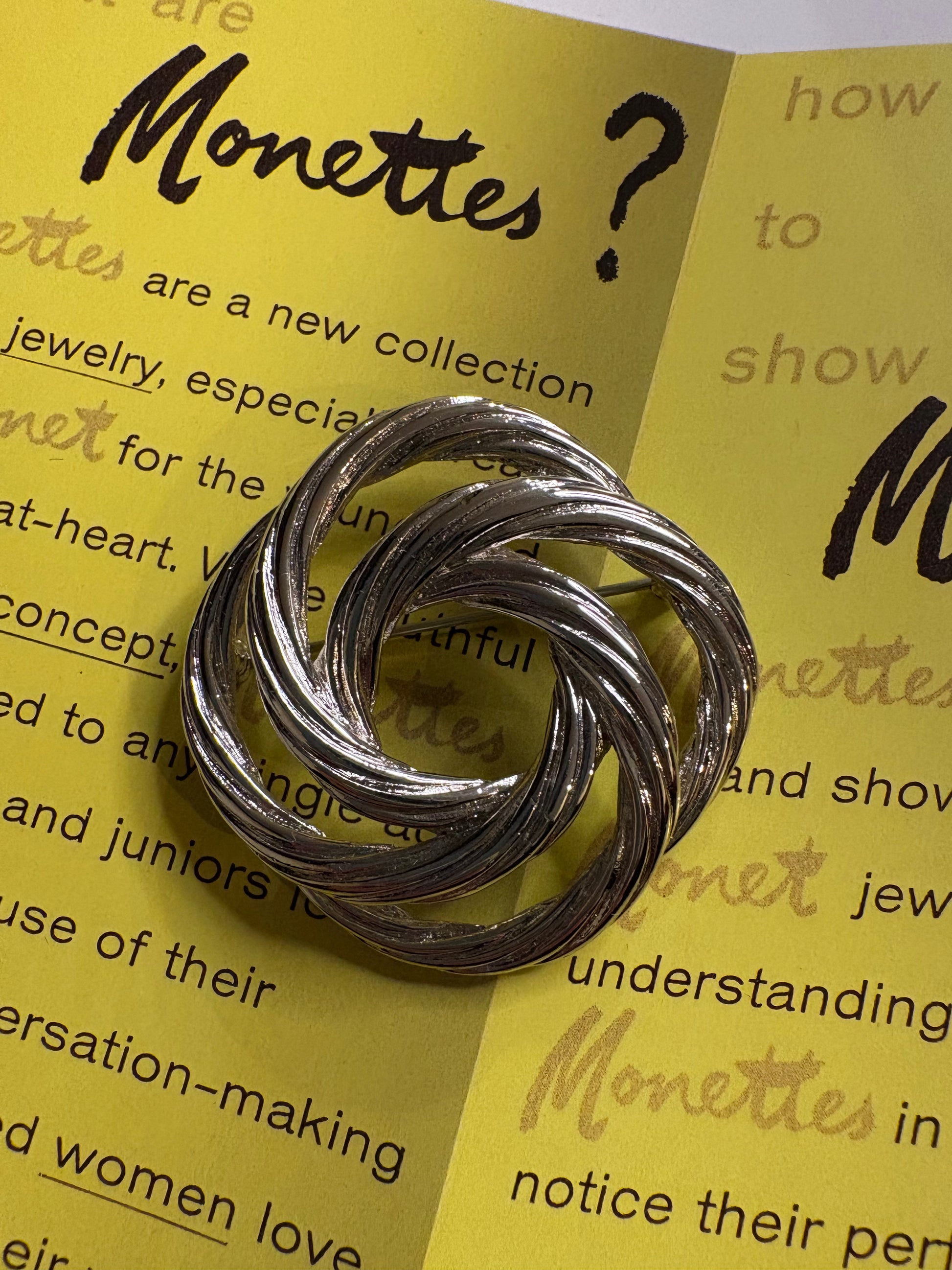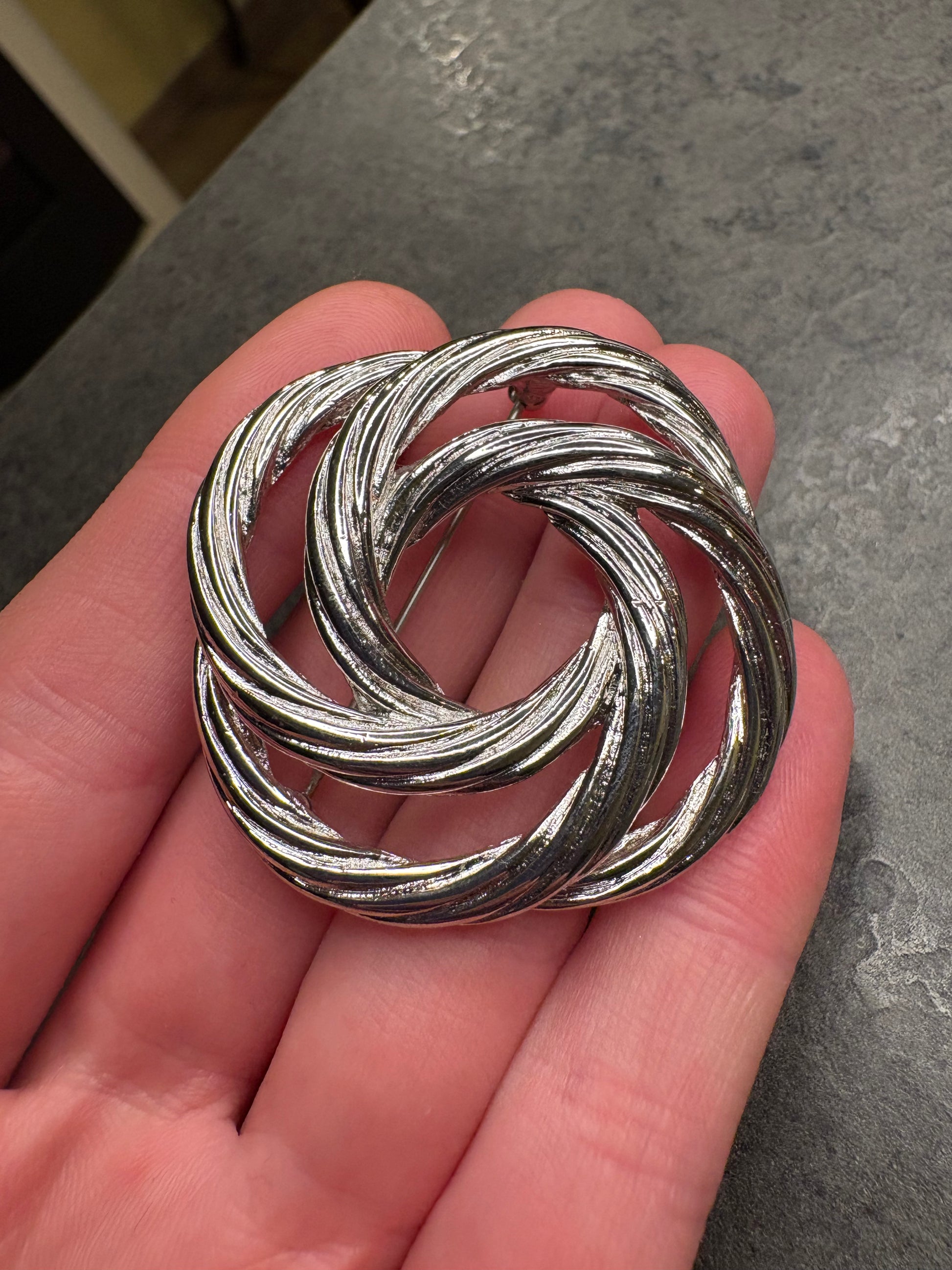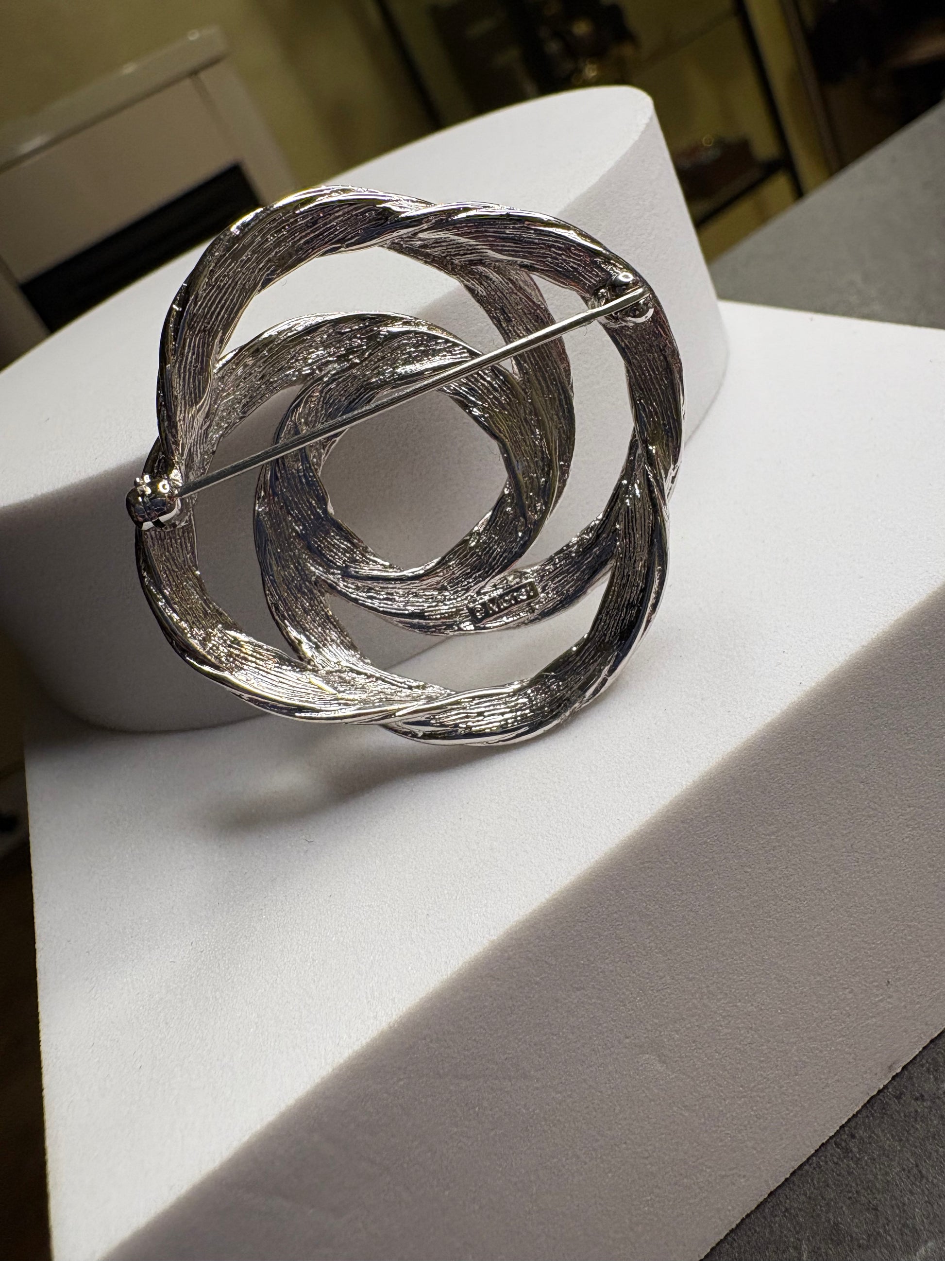 Elegantissima spilla circolare in metallo color argento composta da più elementi curvi intrecciati tra loro in un disegno fluido e dinamico che ricorda un vortice o un nodo ornamentale. La superficie è prevalentemente lucida, con leggere lavorazioni a rilievo che creano giochi di luce e movimento. Il design è pulito, sofisticato e molto rappresentativo dello stile Monet, pensato per dare un tocco elegante ma non eccessivo. La costruzione è compatta e ben proporzionata, con una buona presenza sul capo senza risultare pesante. La chiusura sul retro è solida e funzionale.