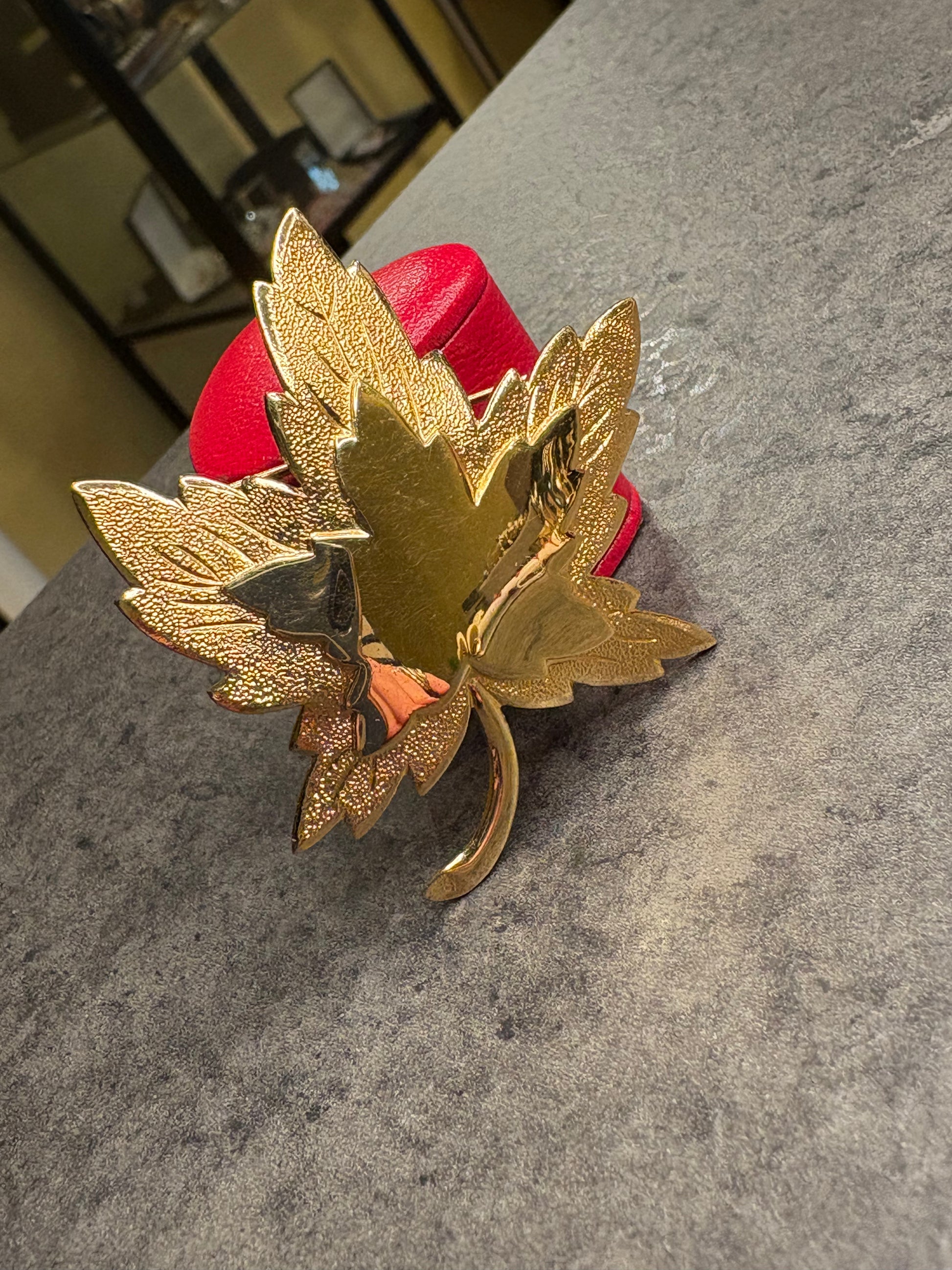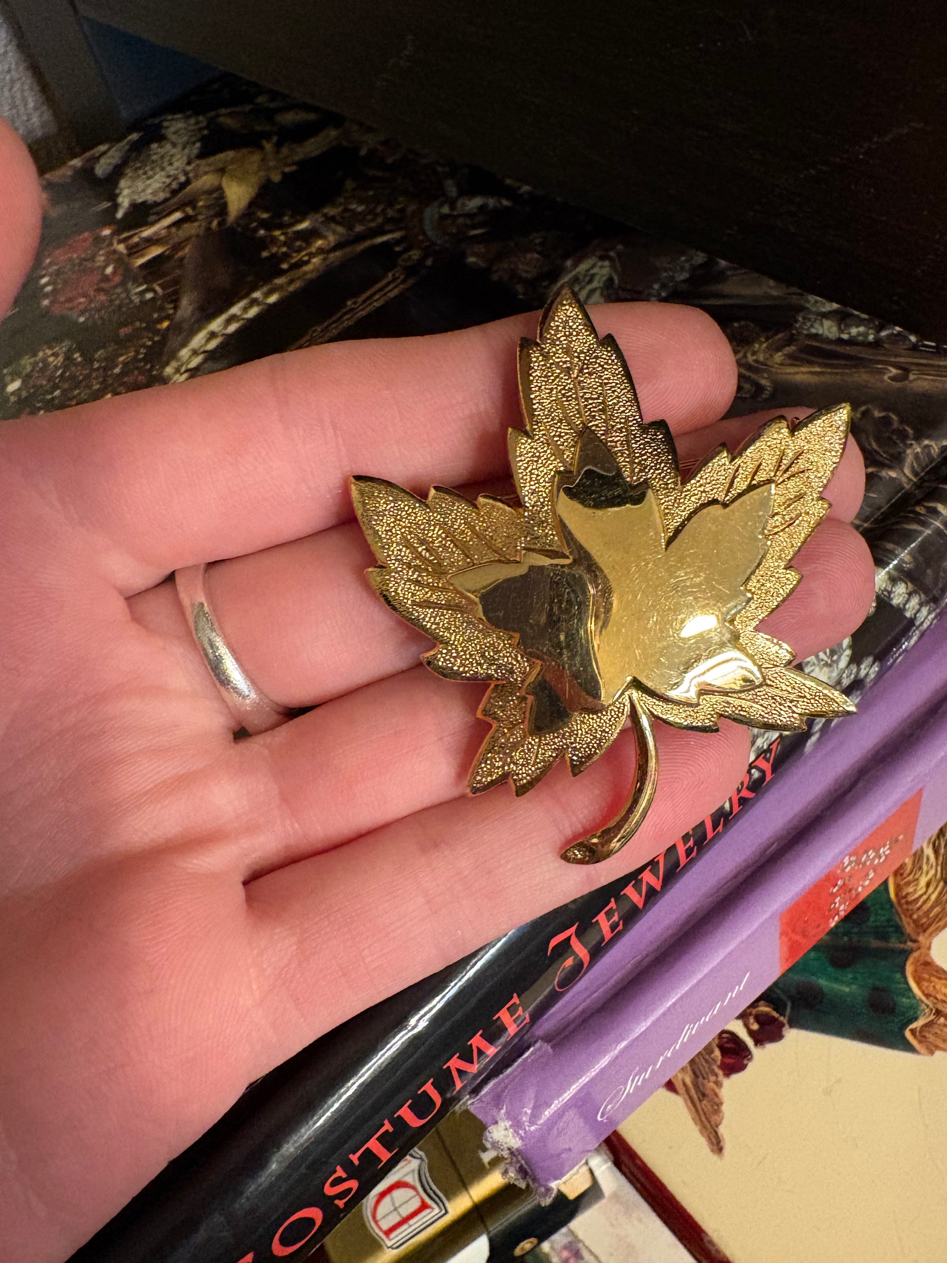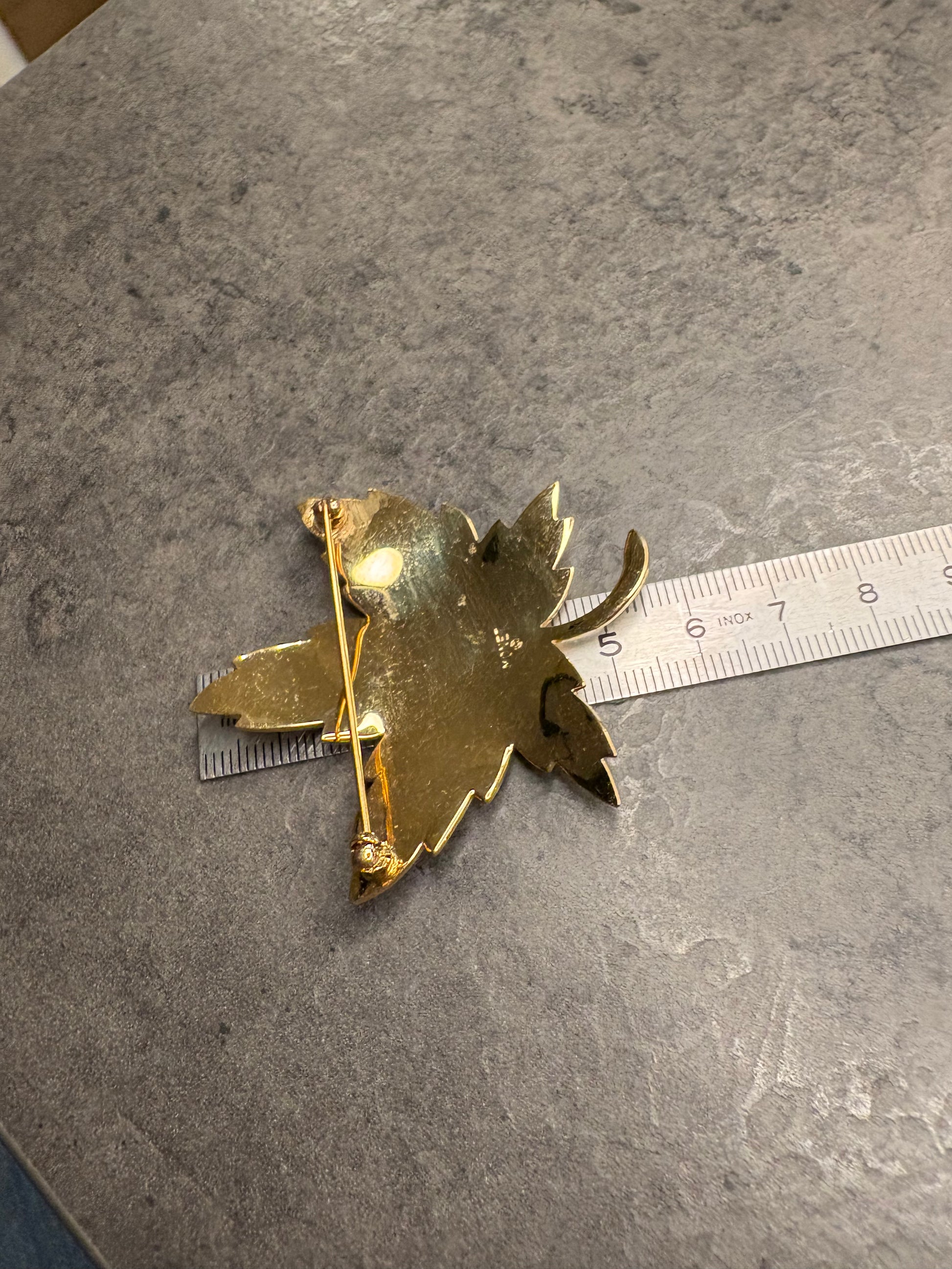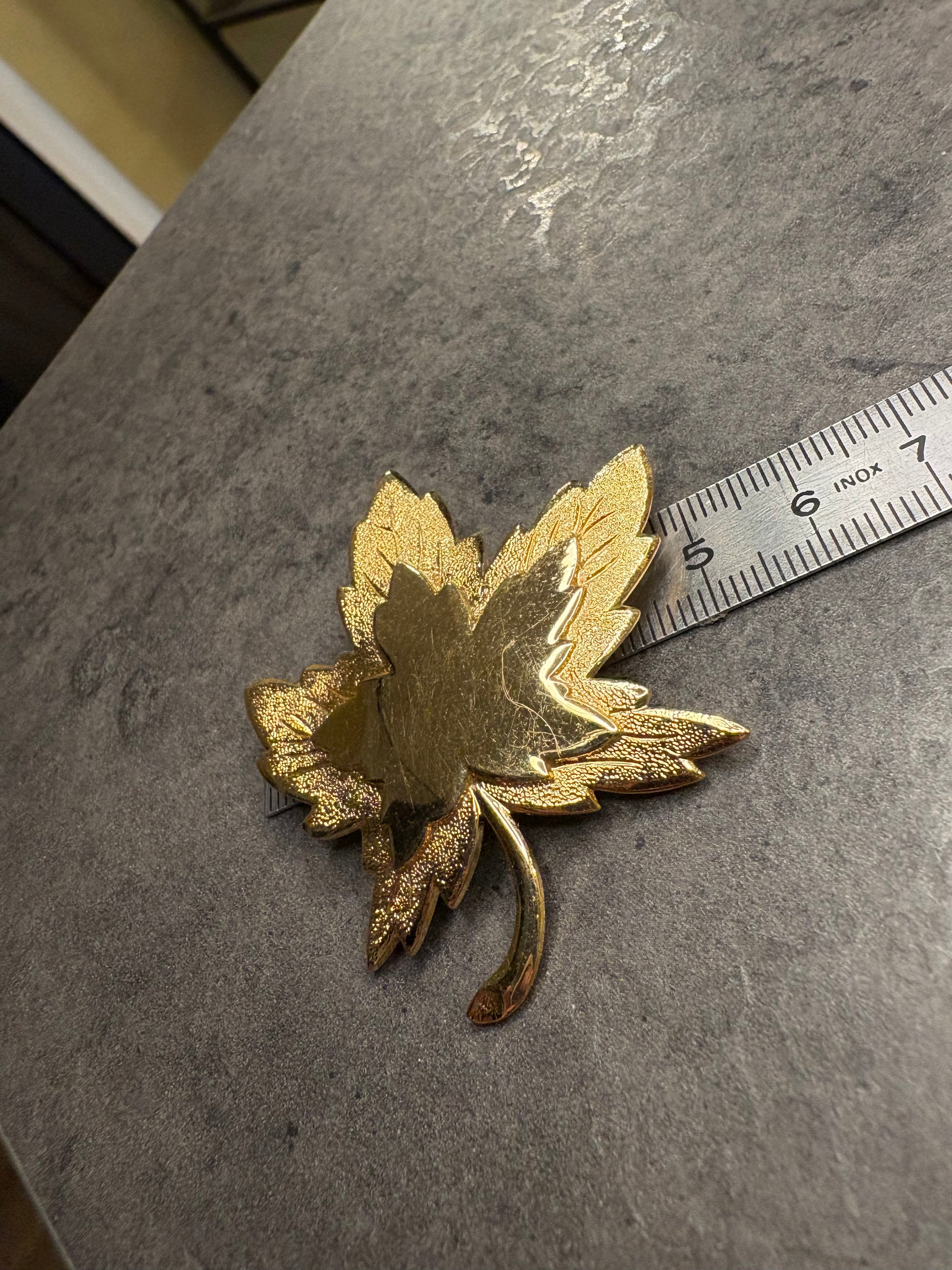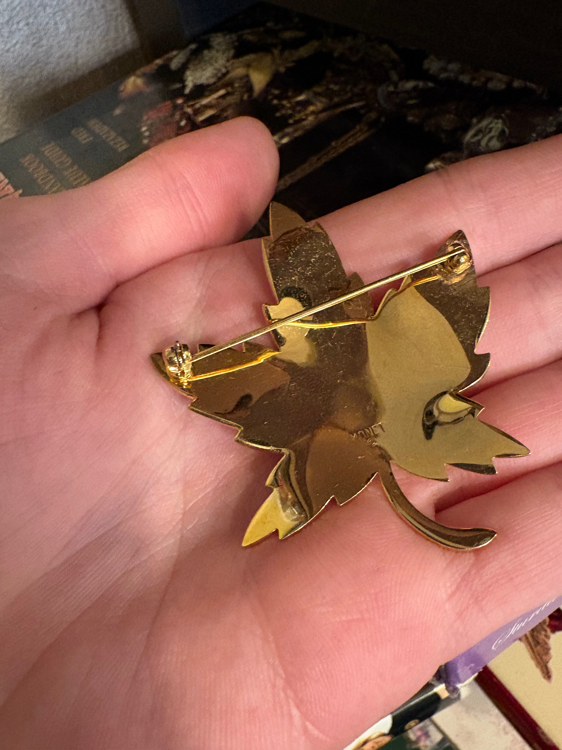 Questa spilla vintage firmata Monet è un pezzo di grande fascino, caratterizzato da una raffinata lavorazione che raffigura una foglia stilizzata. Realizzata in metallo color oro lucido, presenta una combinazione di superfici: la parte centrale liscia e specchiata contrasta elegantemente con i bordi dalla finitura satinata e leggermente testurizzata, che donano profondità e brillantezza al design.