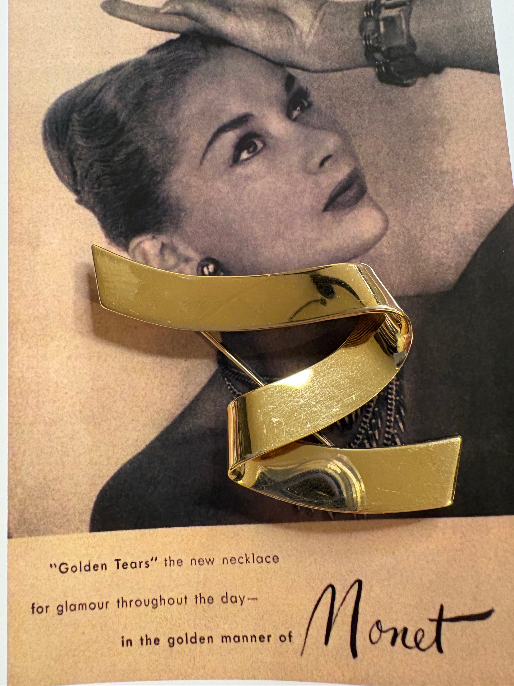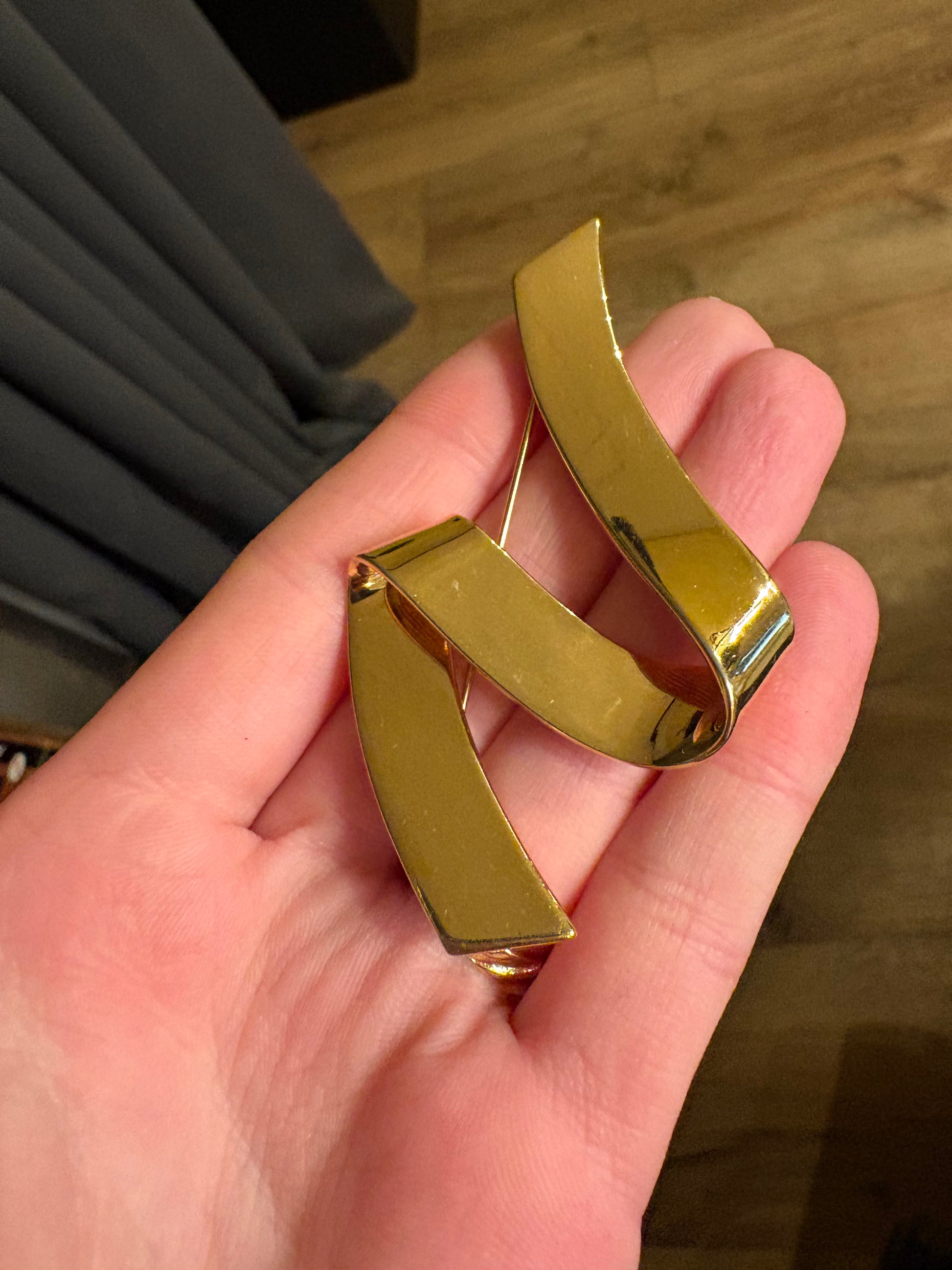 Il nastro si avvolge in una curva morbida e armoniosa, come un drappo di seta fermato da un gesto naturale, evocando lo stile sofisticato che ha reso il brand uno dei protagonisti assoluti della bigiotteria americana del XX secolo. La forma fluida la rende un accessorio incredibilmente versatile: può essere indossata su una giacca, un cappotto, un abito o persino su un maglione, aggiungendo un tocco di luce e ricercatezza senza tempo.