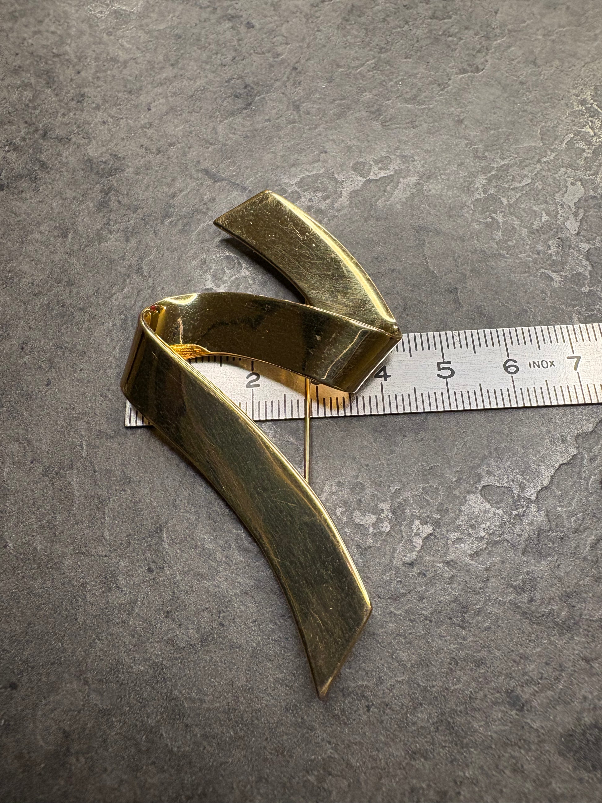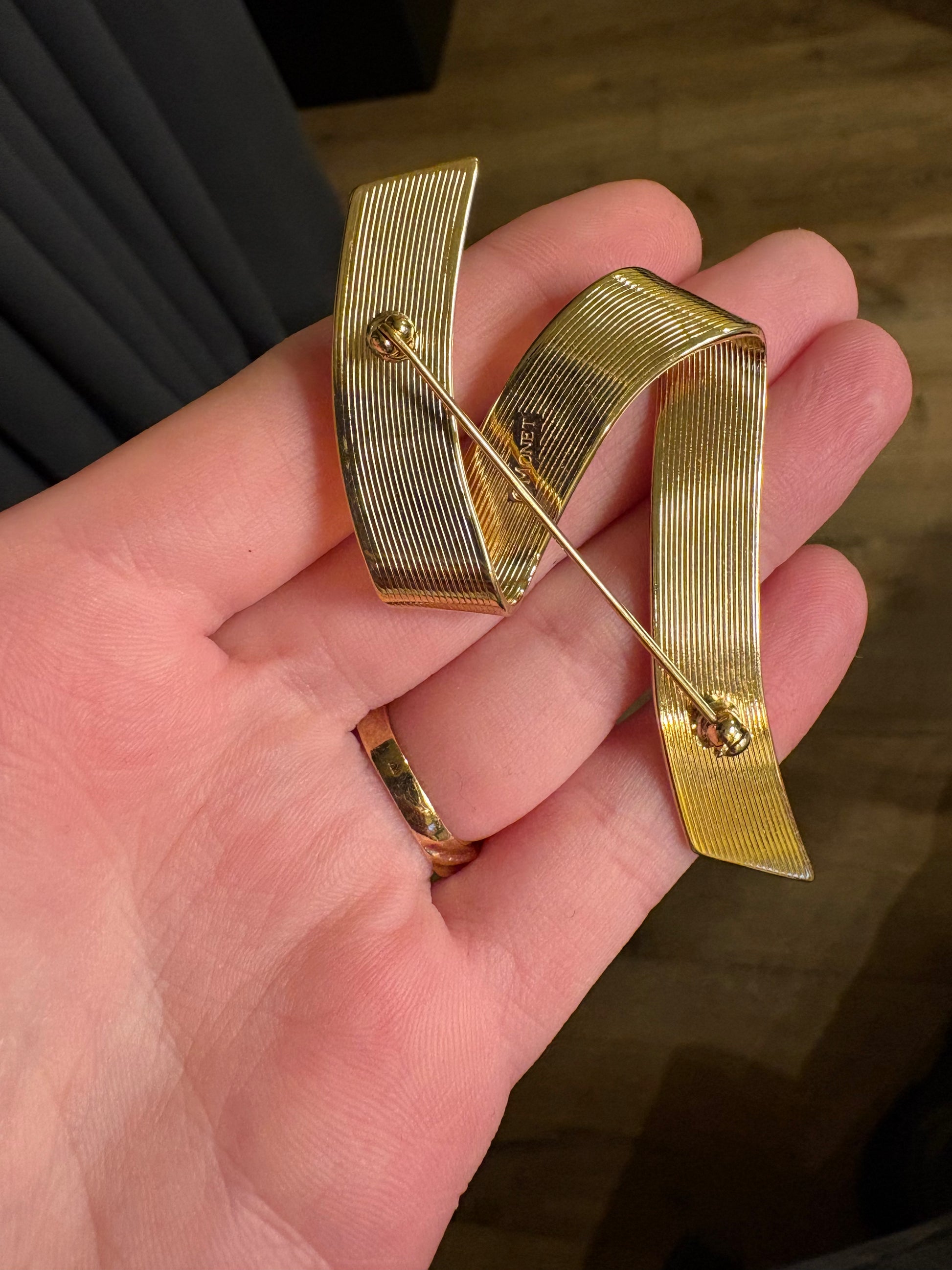 Questa magnifica spilla vintage di Monet cattura immediatamente lo sguardo con il suo design sinuoso a forma di nastro, un motivo caro alla maison per la sua eleganza scultorea e la capacità di donare movimento anche al metallo. Realizzata in metallo color oro dalla luminosità impeccabile, presenta una superficie liscia sul fronte, moderna e minimale, mentre il retro rivela una lavorazione a sottili righe incise che aggiunge profondità e raffinatezza, oltre alla firma MONET che ne certifica l’autenticità.