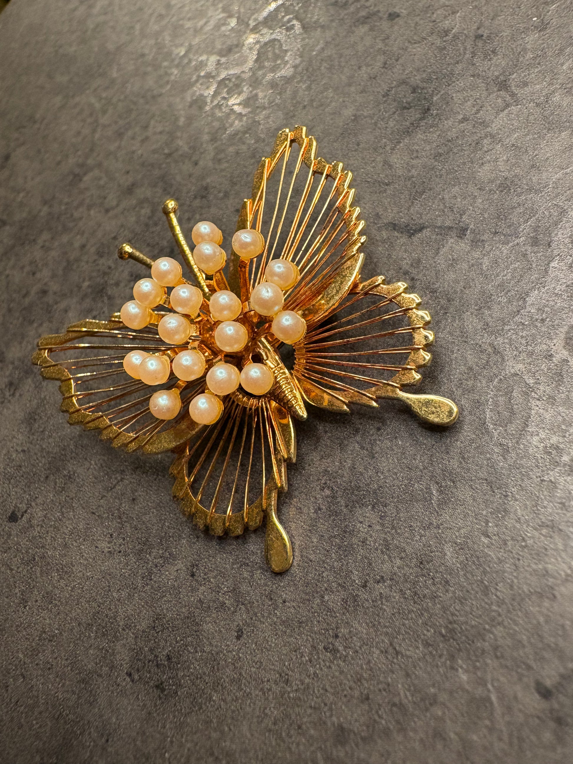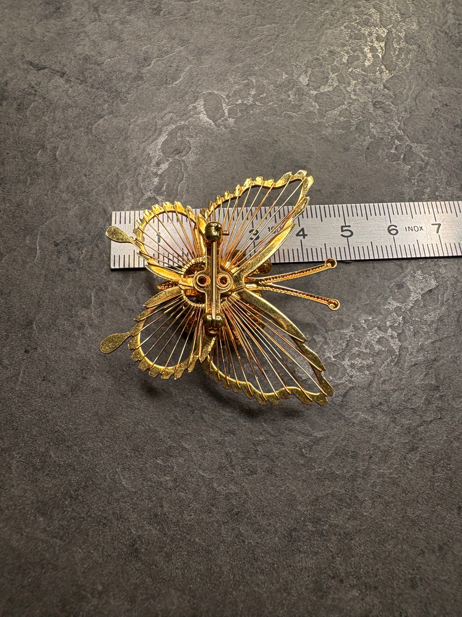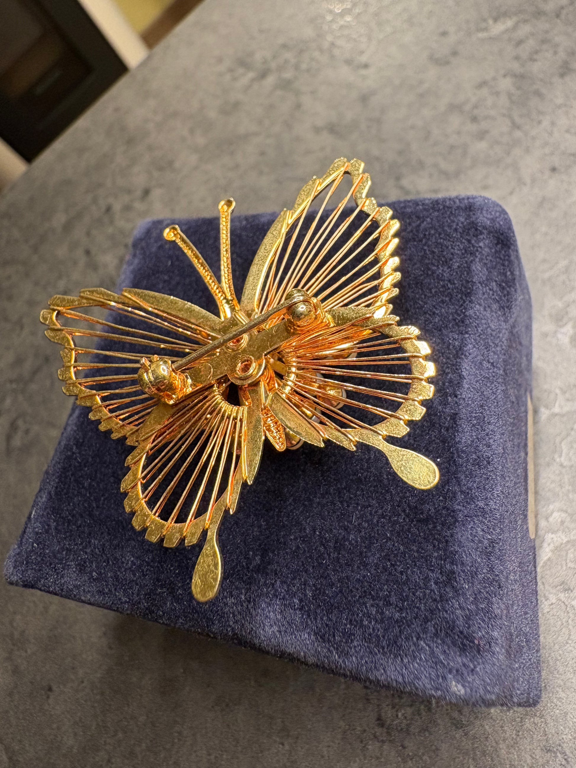 Incantevole spilla vintage a forma di farfalla, attribuibile alla maison Monet (non firmata) realizzata in metallo dorato con elegante lavorazione filigranata.