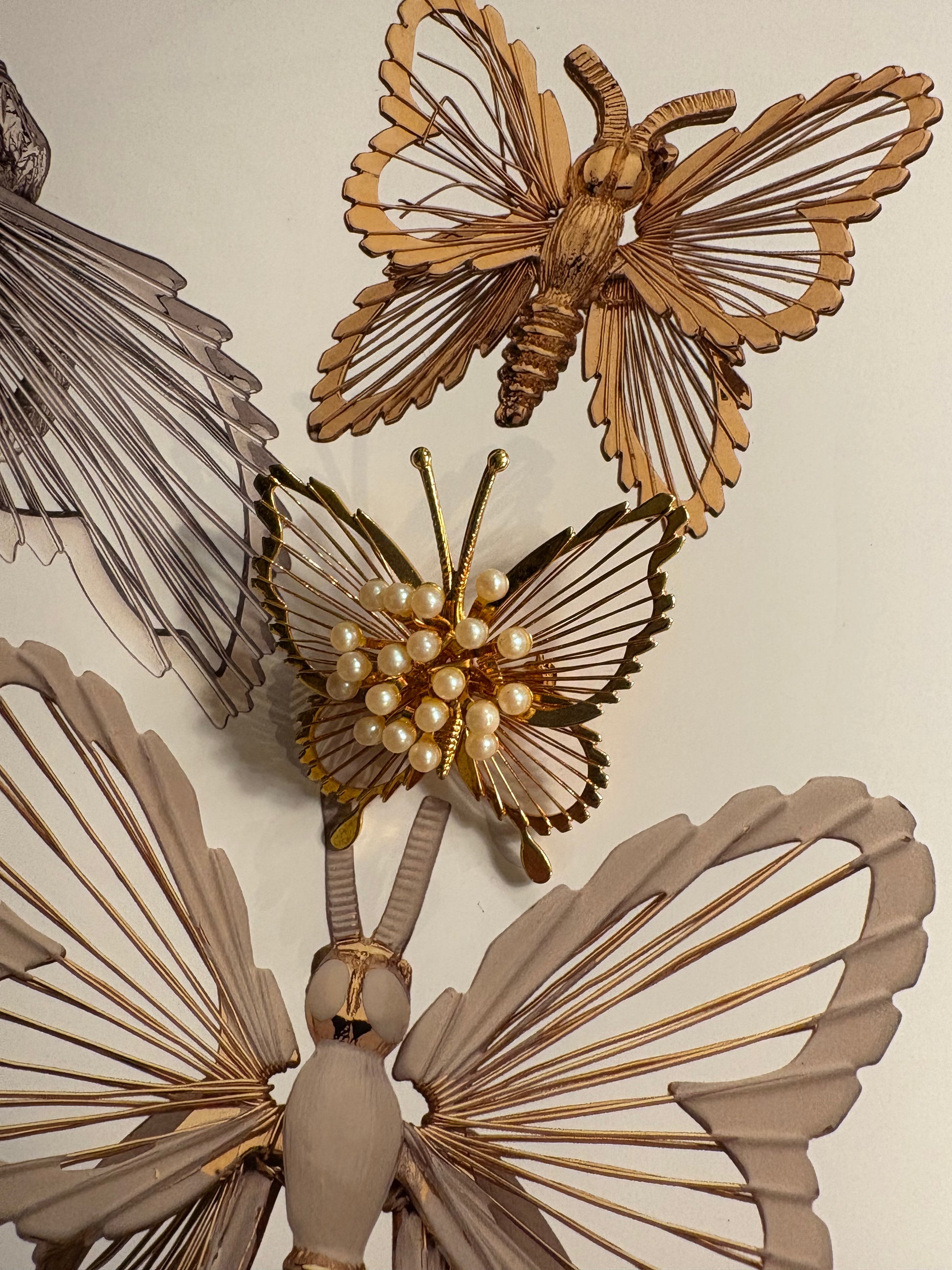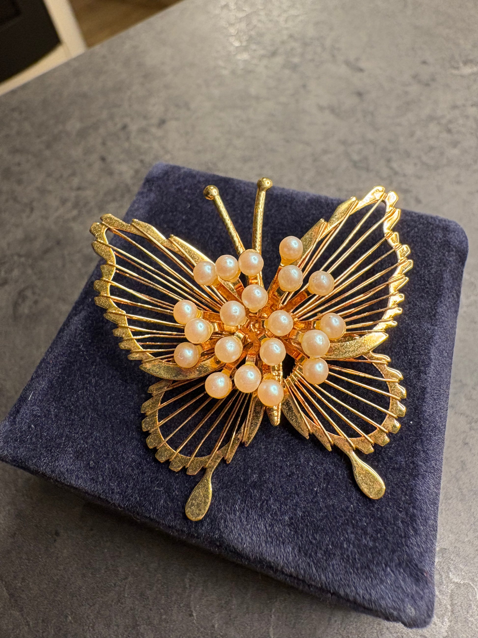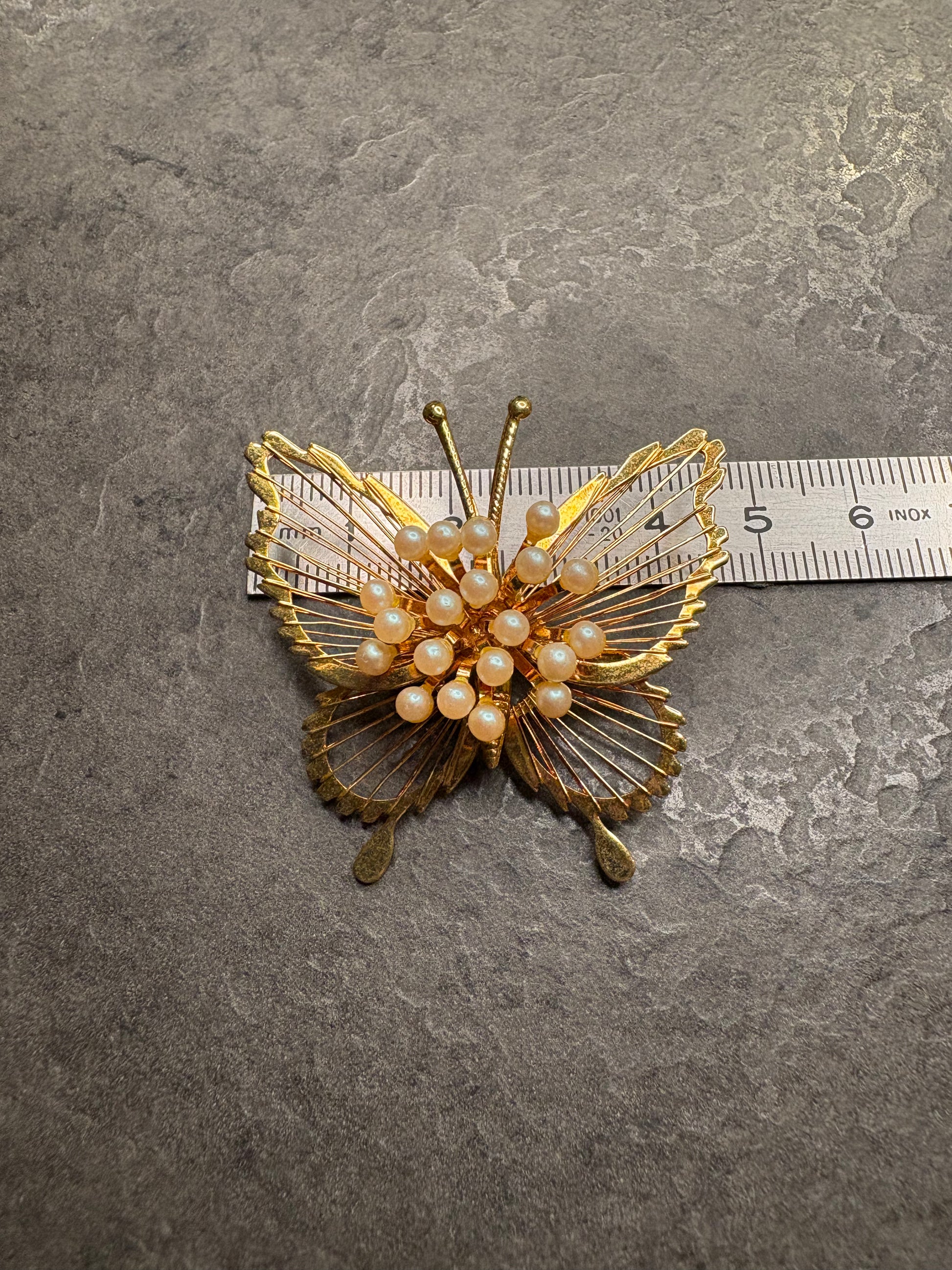 Incantevole spilla vintage a forma di farfalla, attribuibile alla maison Monet (non firmata) realizzata in metallo dorato con elegante lavorazione filigranata.
