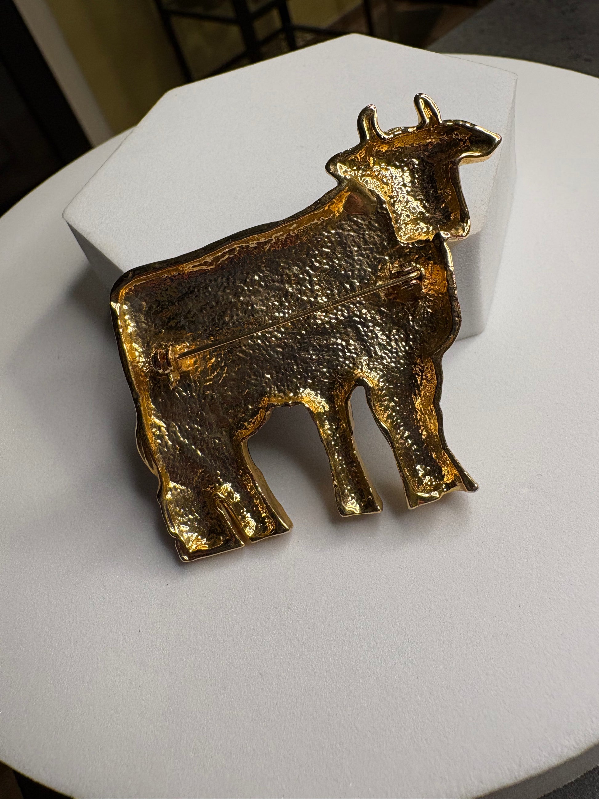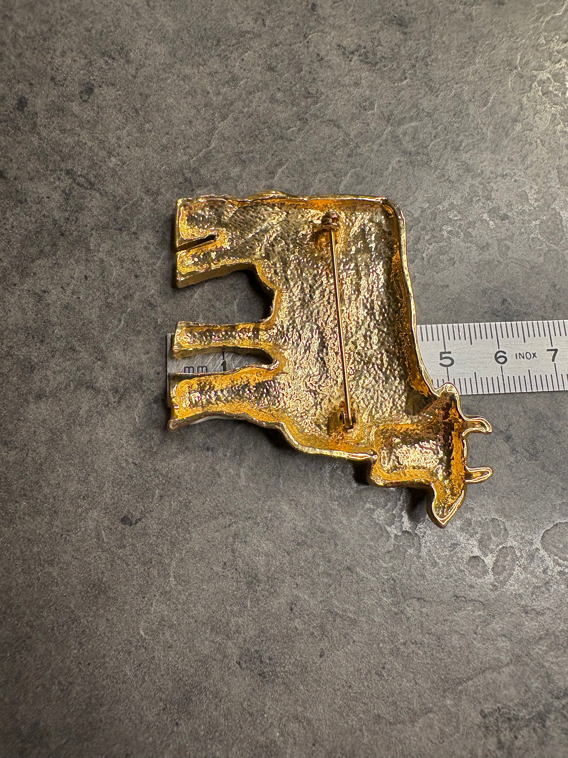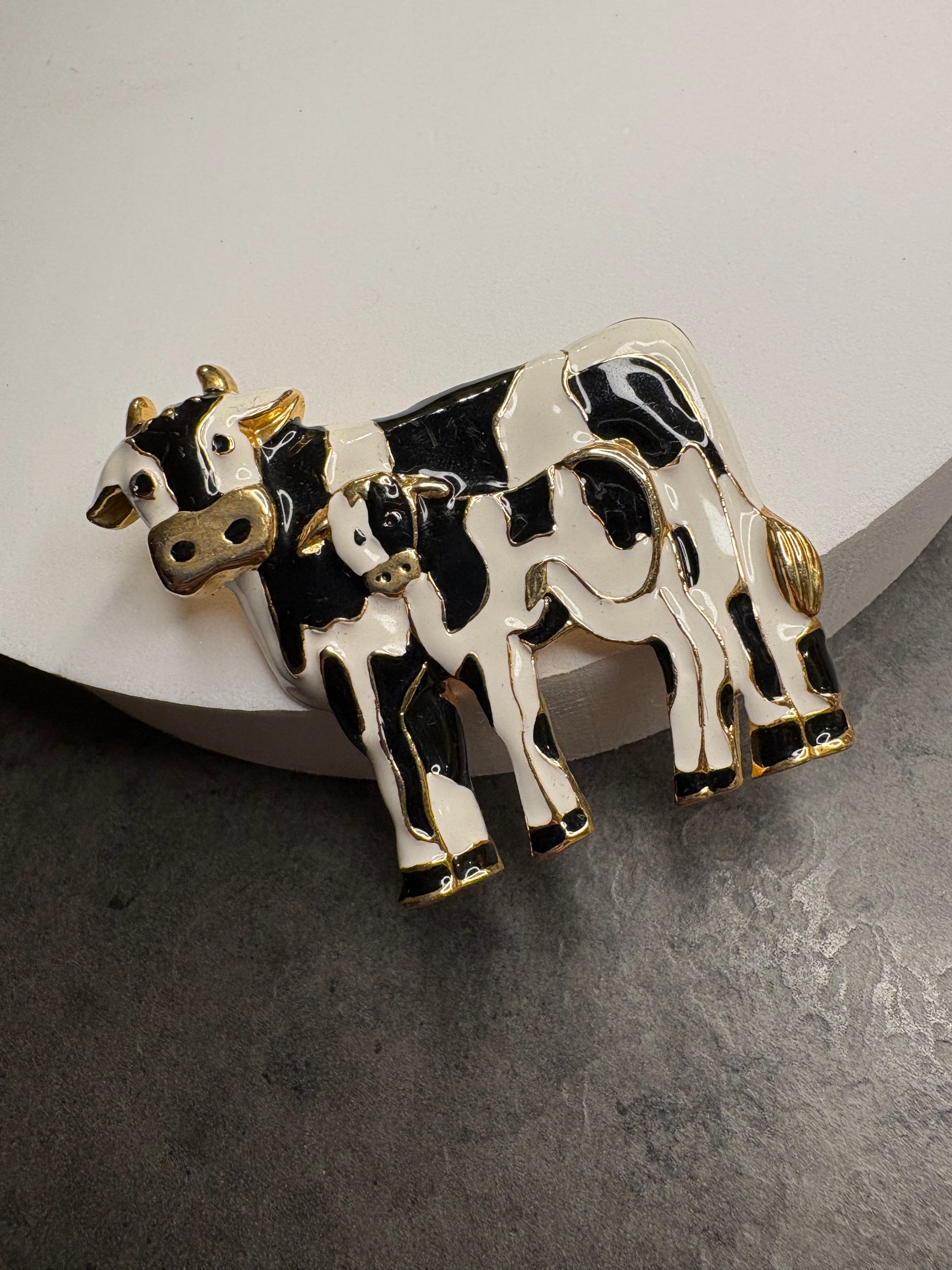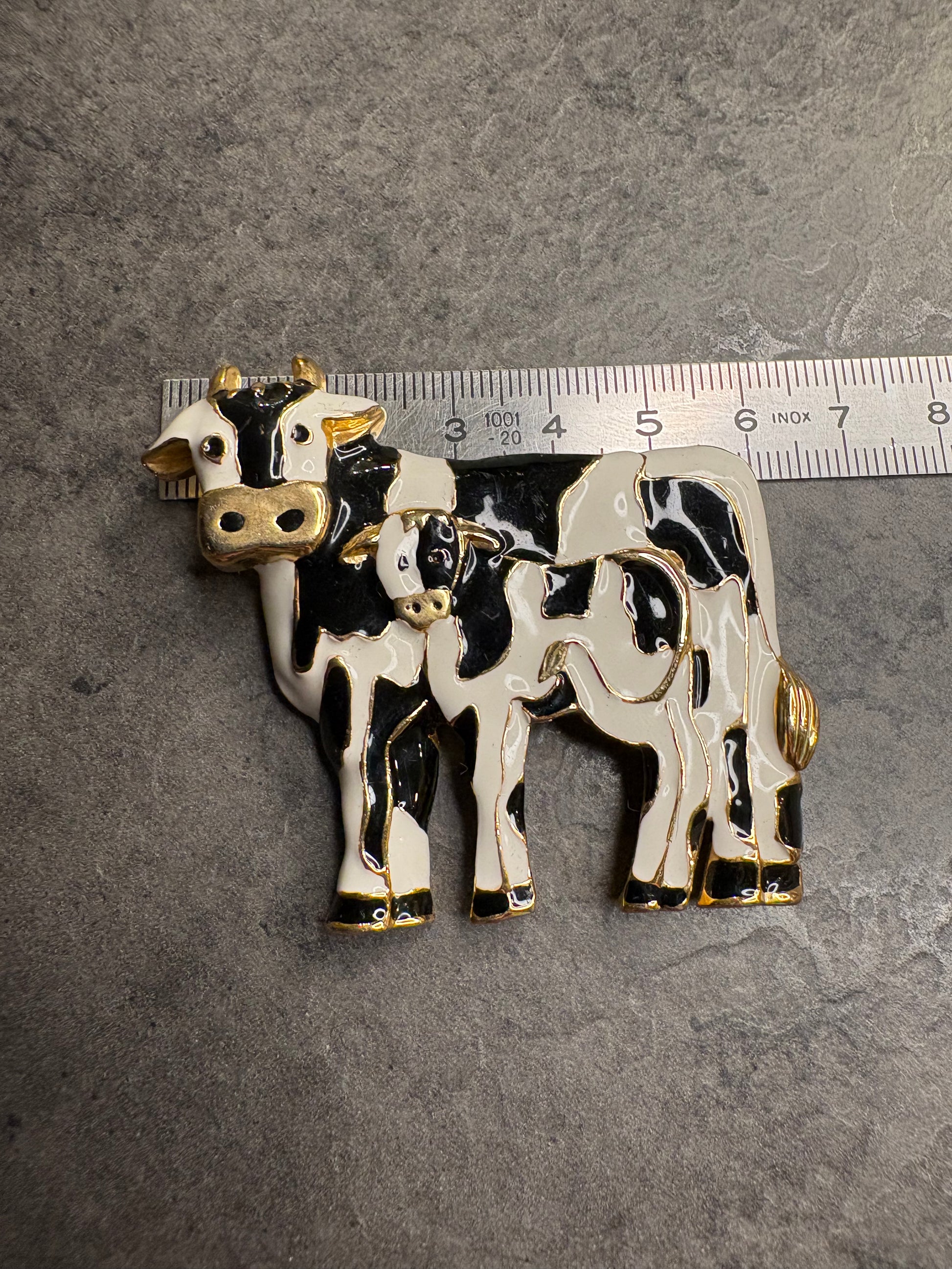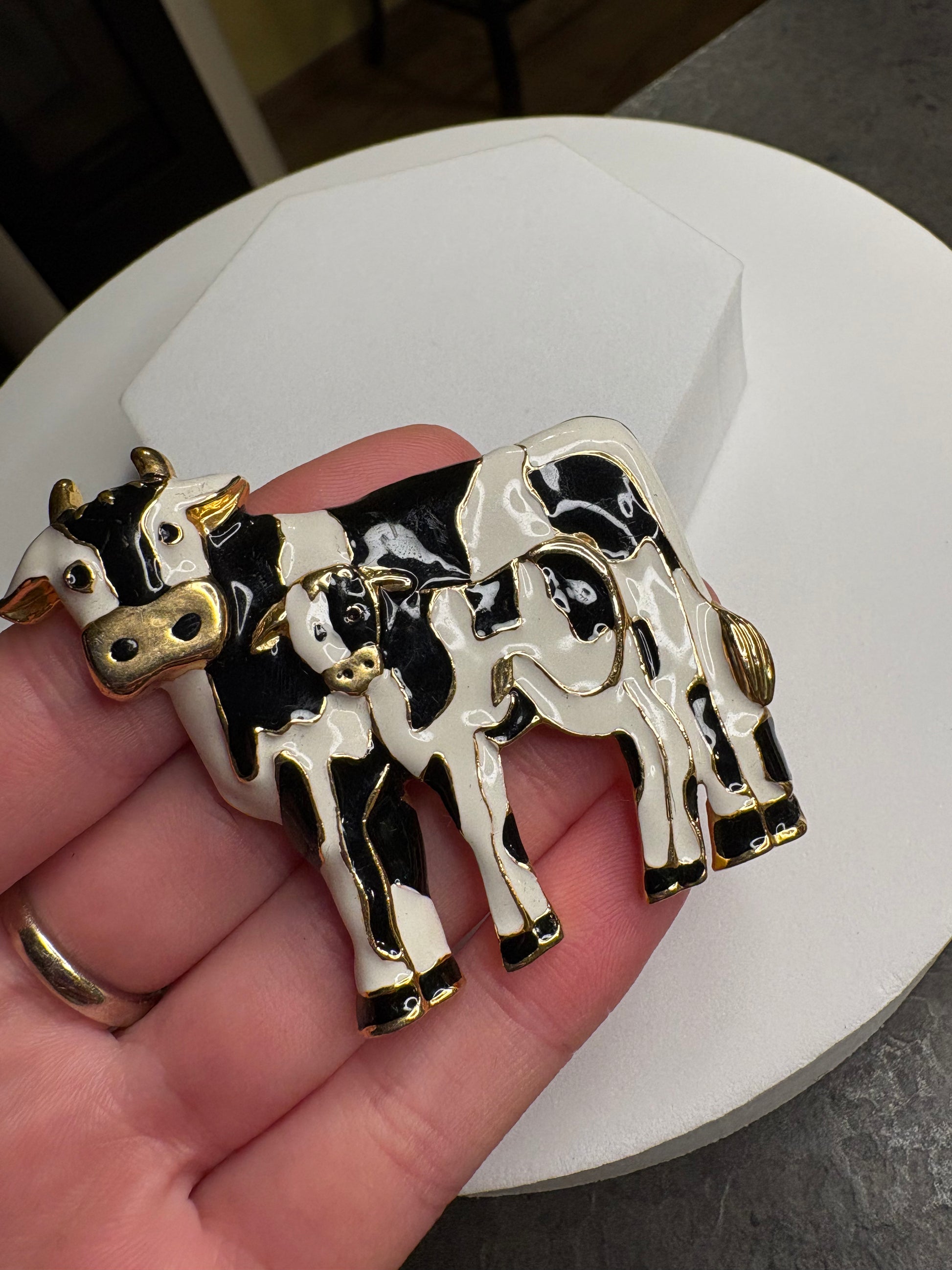 Questa meravigliosa spilla raffigurante una mucca con vitellino è una creazione dal forte impatto decorativo e dal gusto giocoso ma raffinato. Realizzata in metallo color oro, presenta un’accurata lavorazione a smalto nei toni del nero e del bianco che definisce con precisione le macchie del manto. I profili dorati mettono in risalto le forme morbide degli animali, creando un piacevole contrasto cromatico. Una spilla originale e simpatica, perfetta per collezionisti e amanti dei soggetti figurativi vintage.